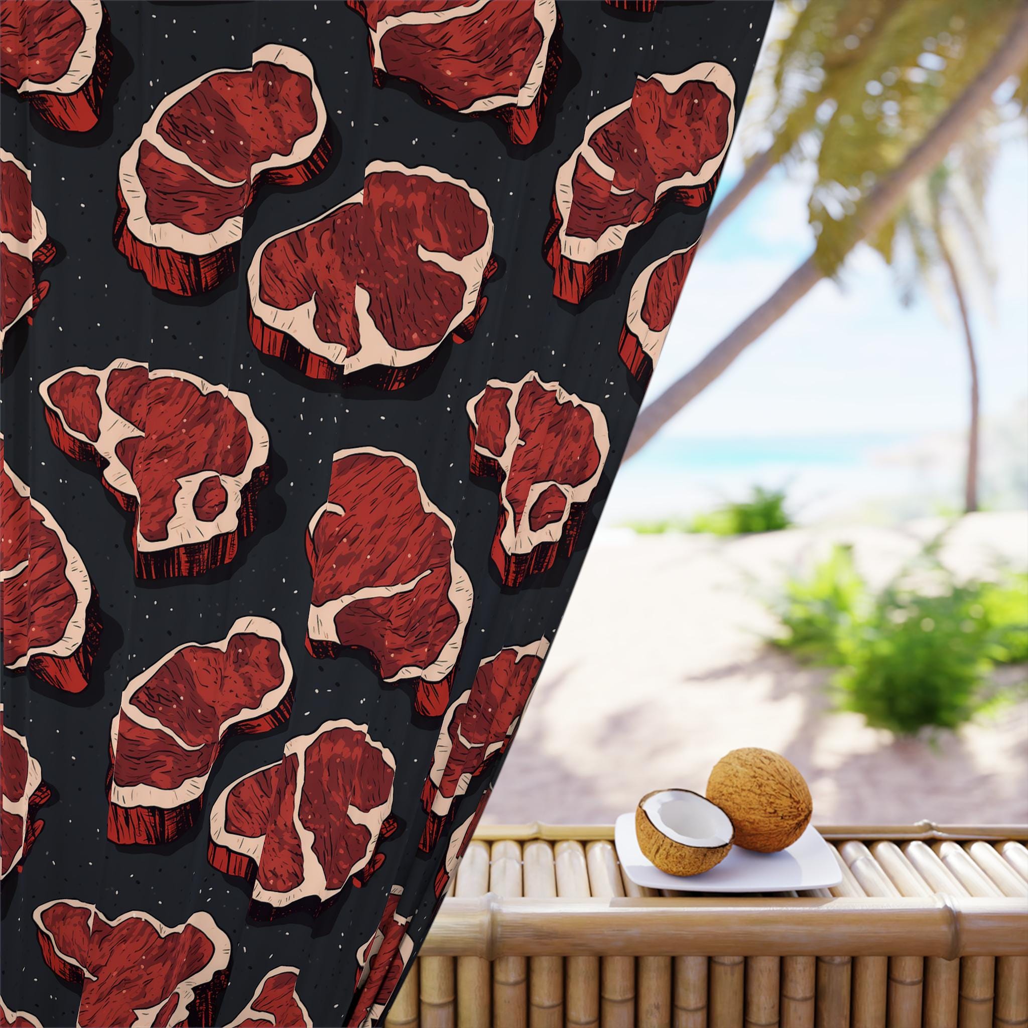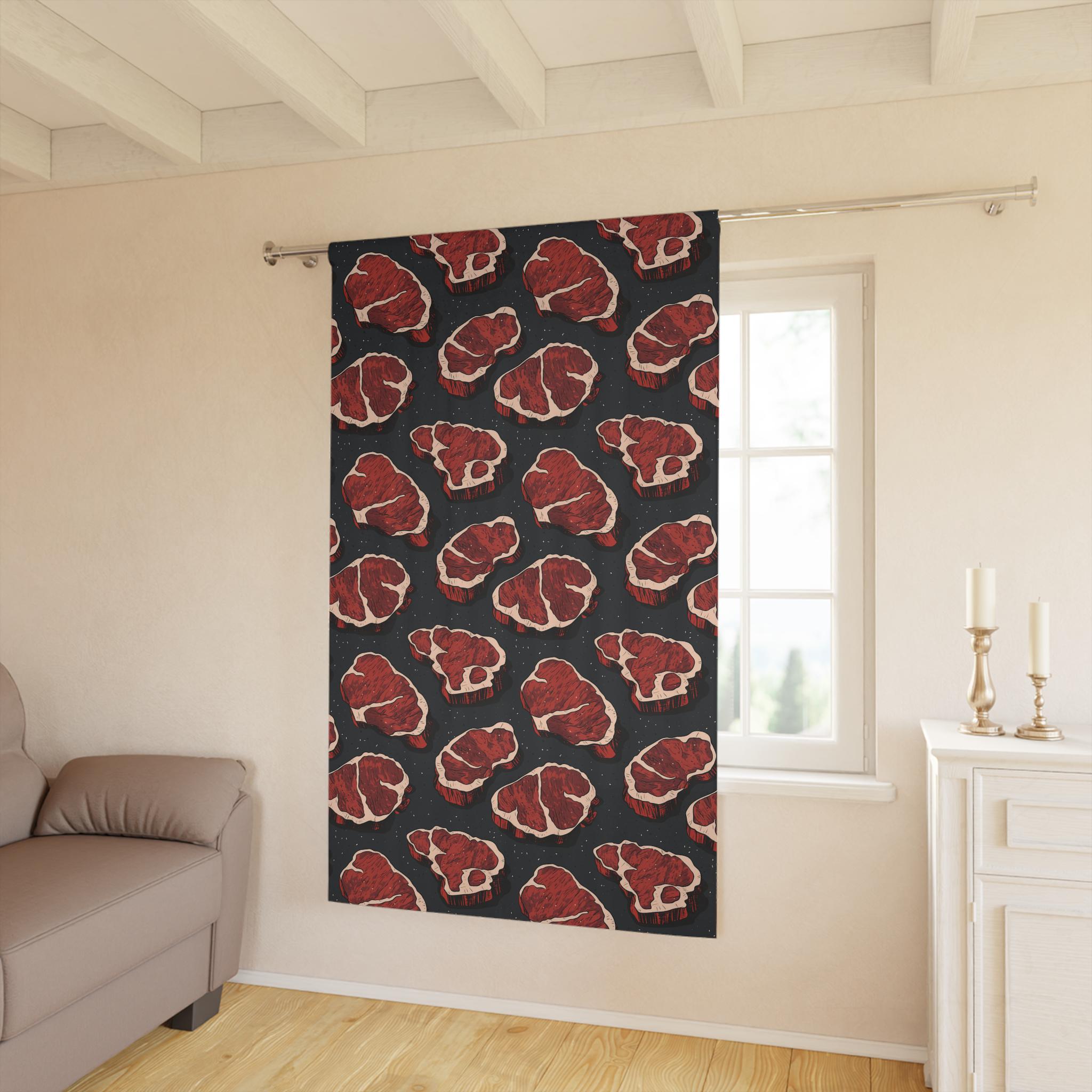 Introducing our boldly cheeky curtain design that will surely make a statement and keep tongues wagging. Feast your eyes on our "meat curtains" themed curtain, featuring a dark and deliciously daring black background adorned with succulent steaks. Now, before your imagination runs wild, let's clarify that this curtain is all about celebrating the carnivorous side of life and adding a playful twist to your decor.