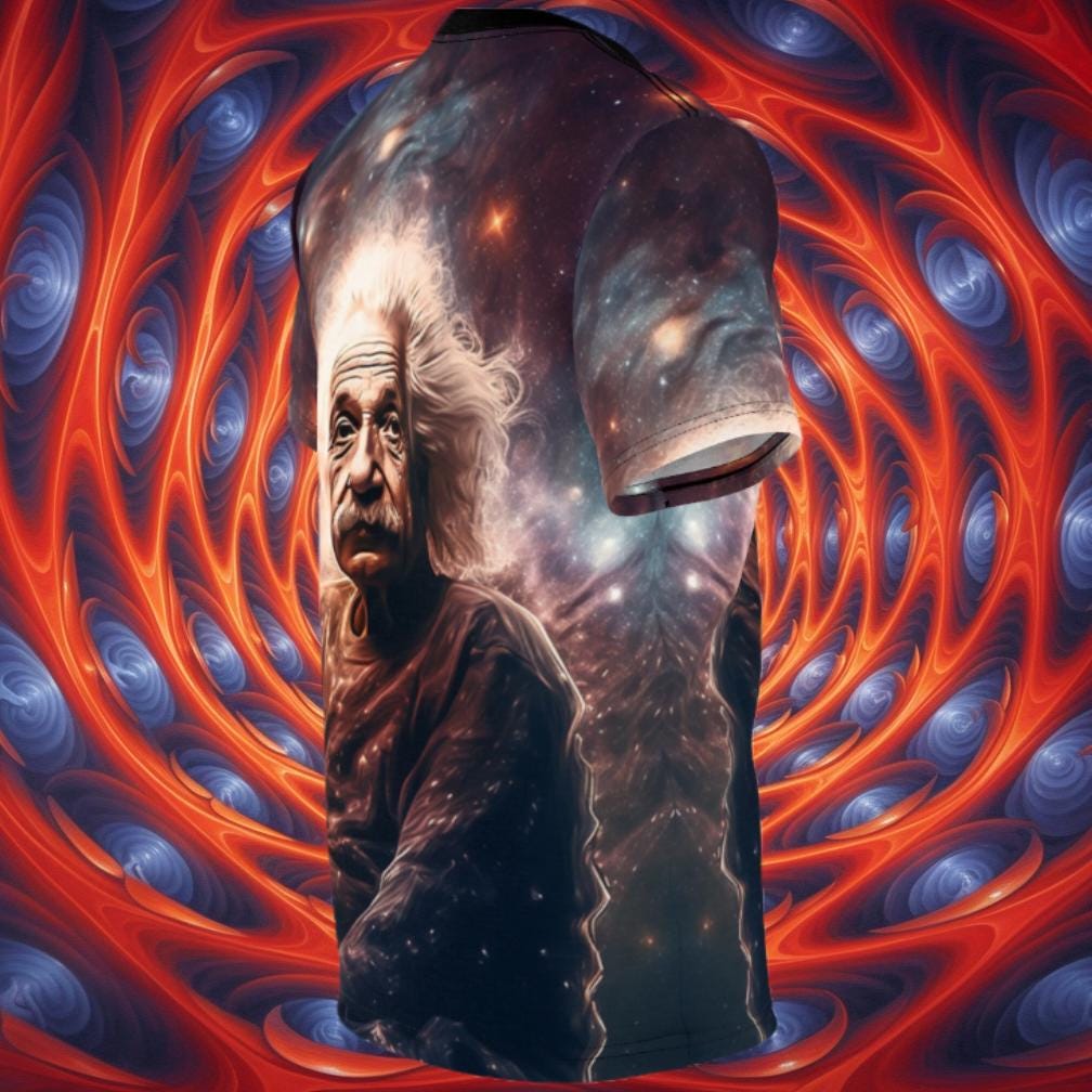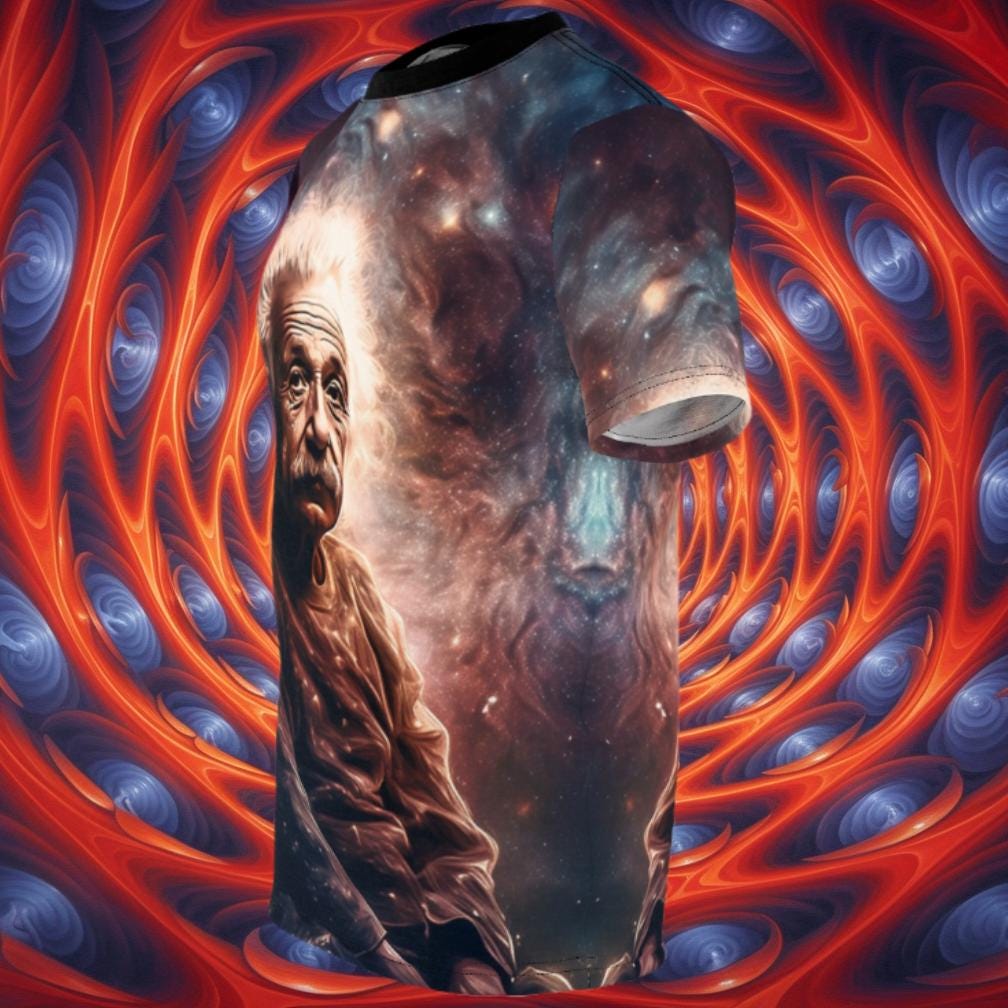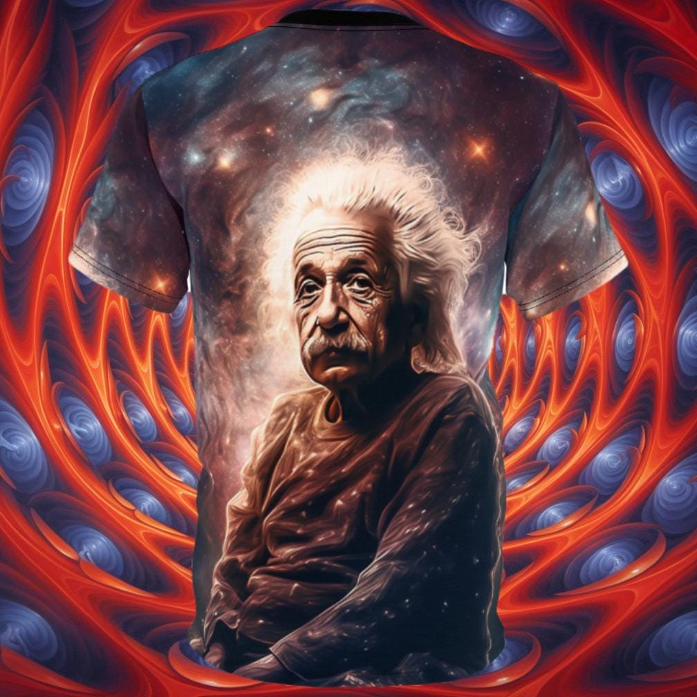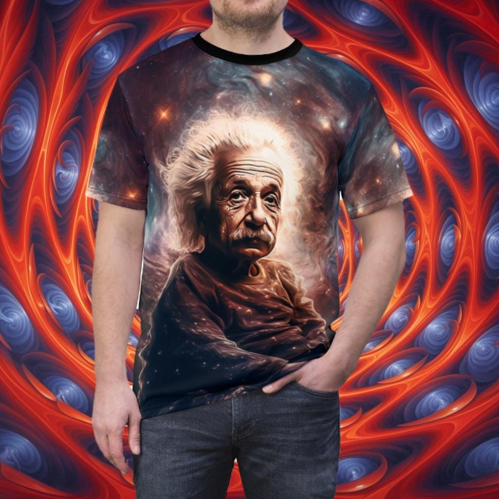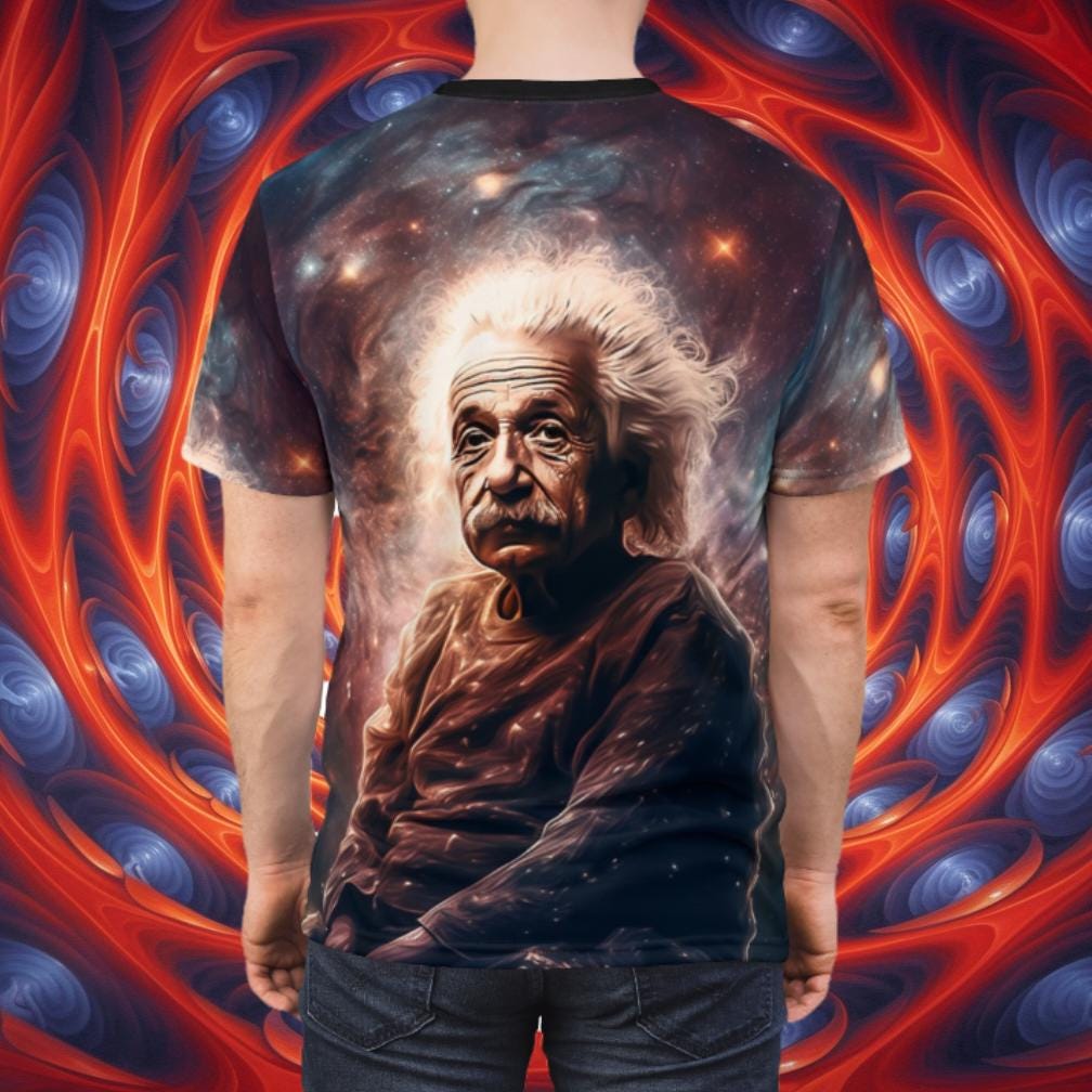Elevate your casual style with our all-over print Albert Einstein tee, a fusion of comfort and intellectual flair. Crafted for versatility, this shirt boasts a uniquely textured, thick, microfiber-knit fabric that not only feels premium but also ensures breathability – making it an ideal choice for both scorching days and fashionable layering.
