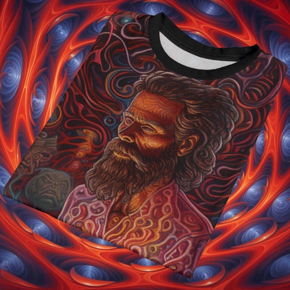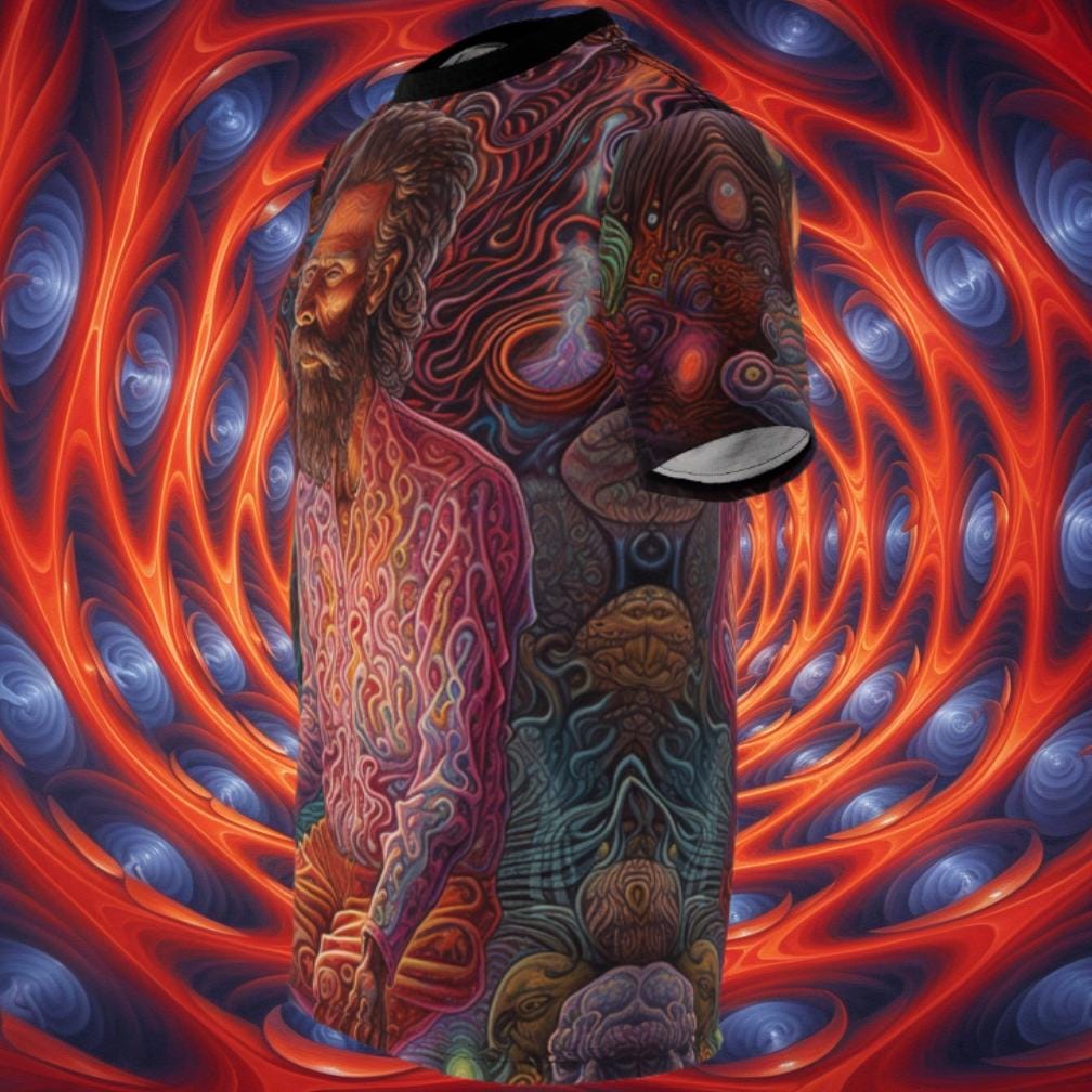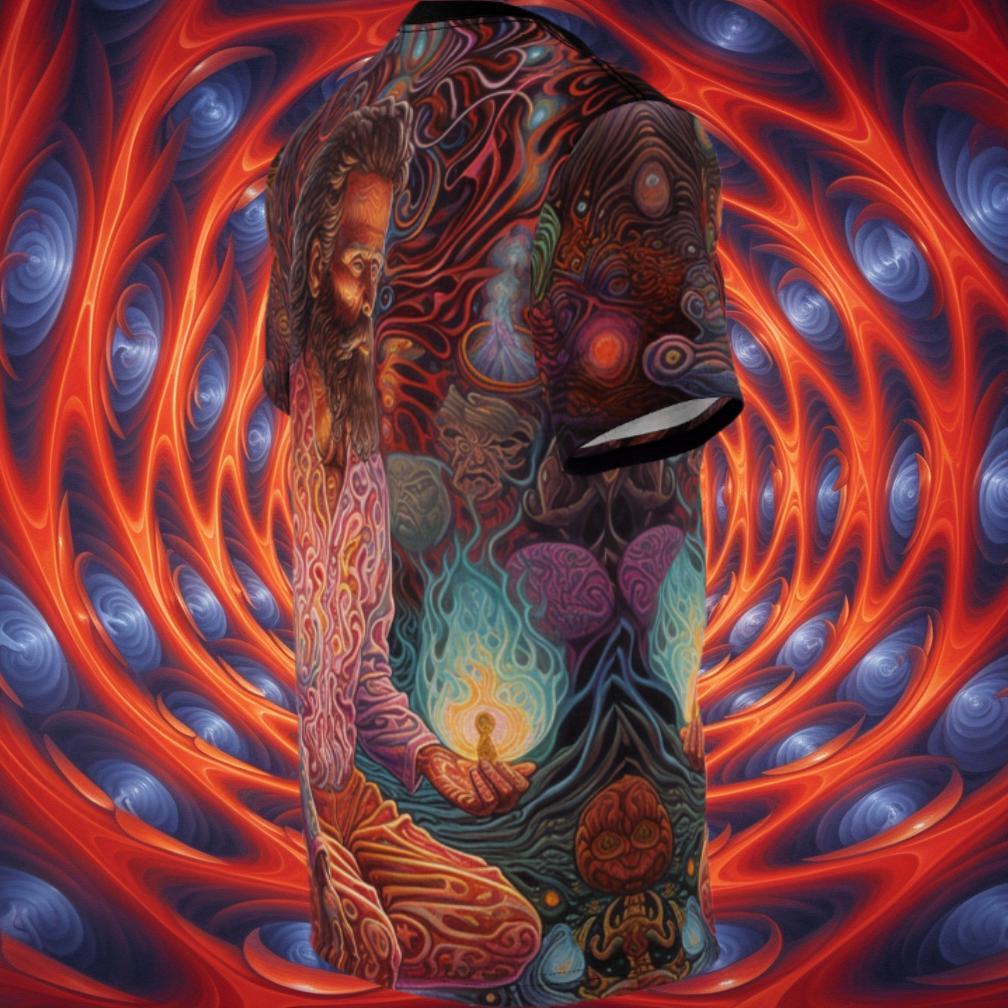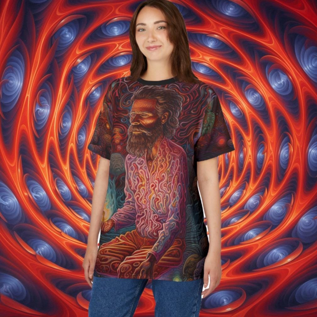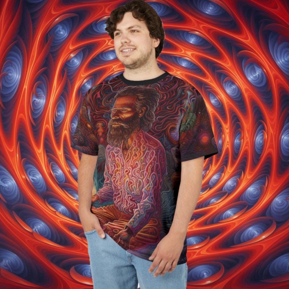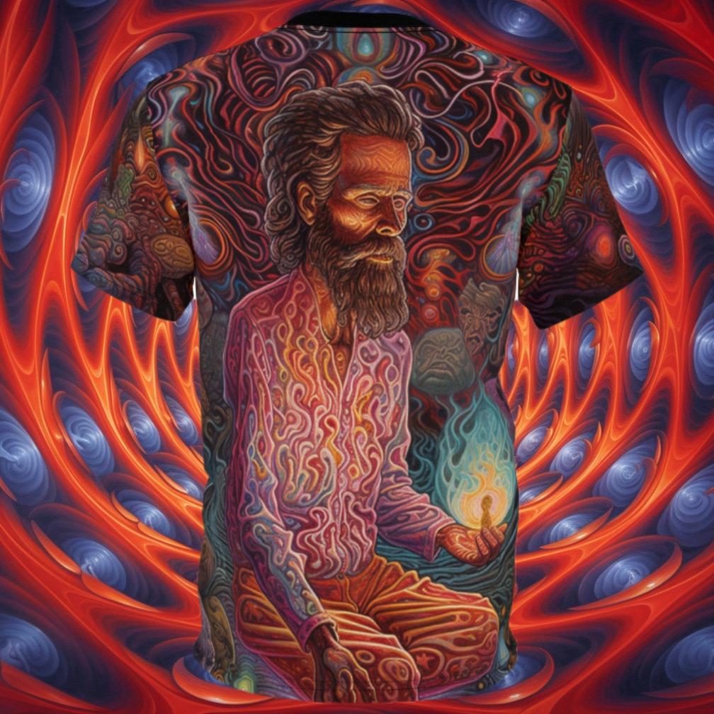 Embark on a mind-bending journey with our "Psychonaught" All Over Print Tee, where the realms of consciousness and art collide. This psychedelic masterpiece features a bearded guru sitting in contemplation, holding the flame of enlightenment. The intricately detailed, seamless design wraps around the entire shirt, creating a visual experience that's as unique as your consciousness exploration.