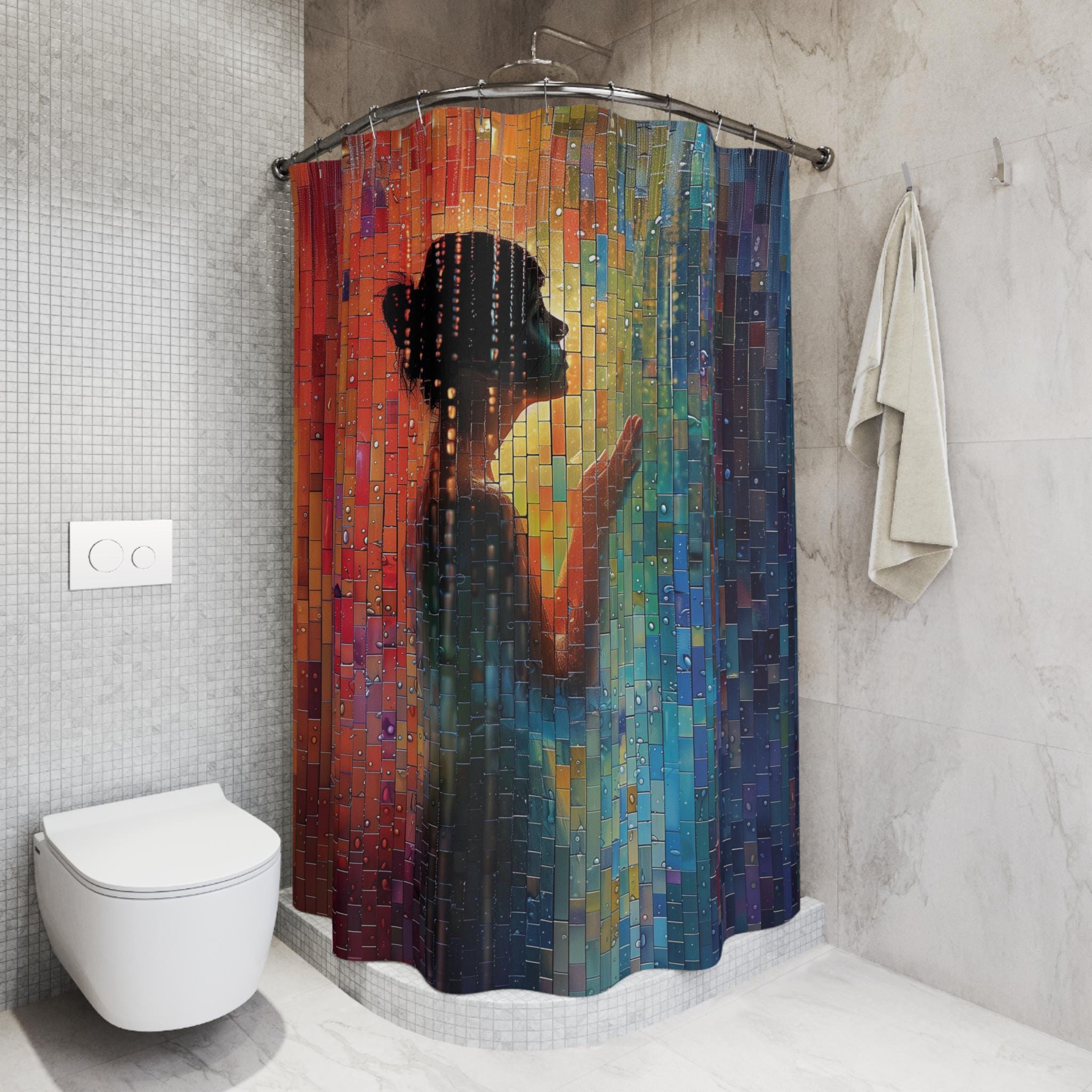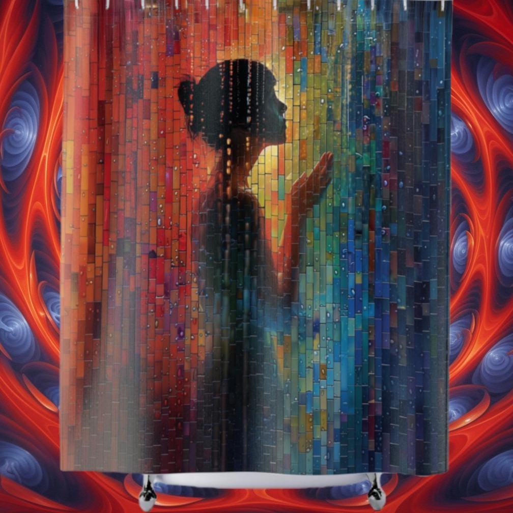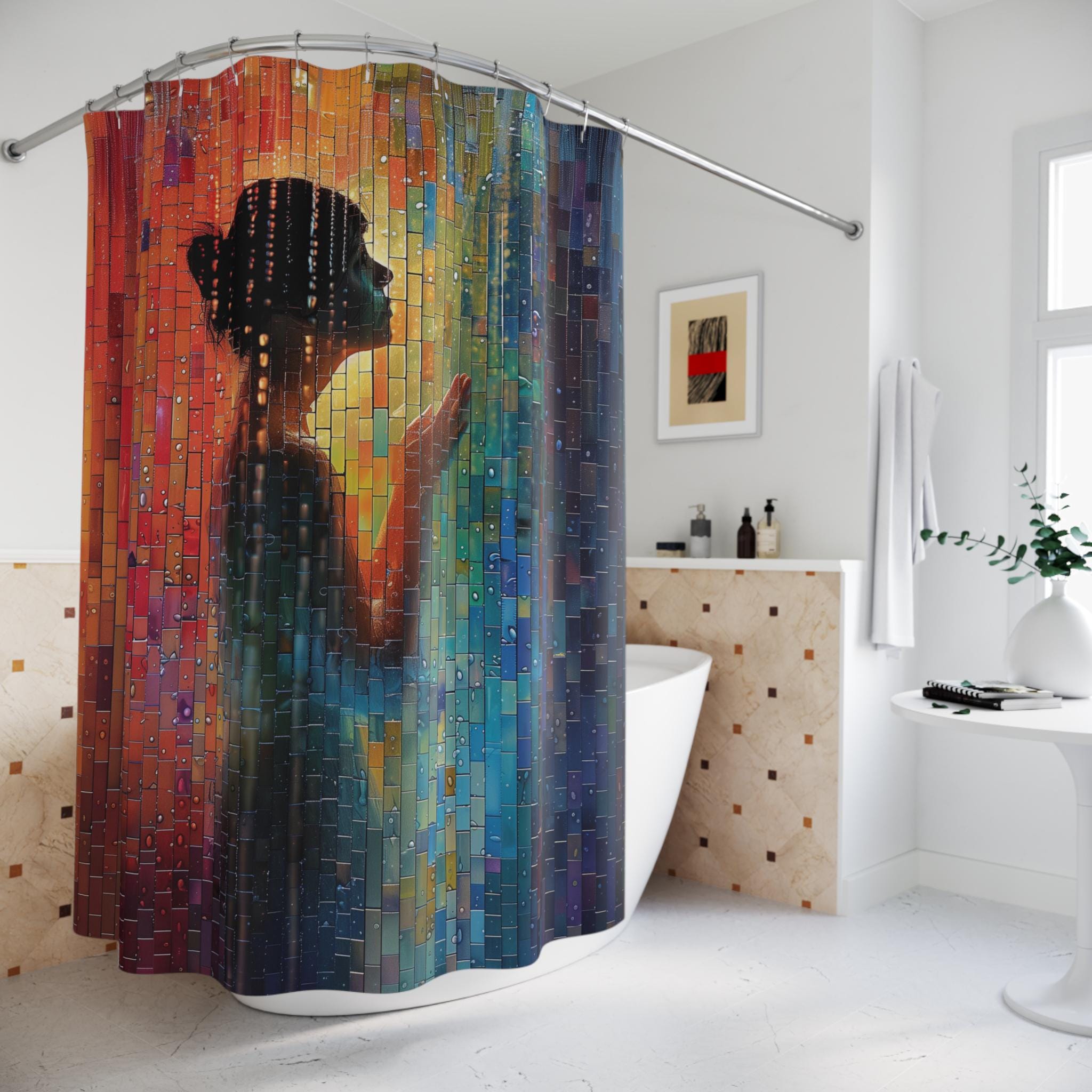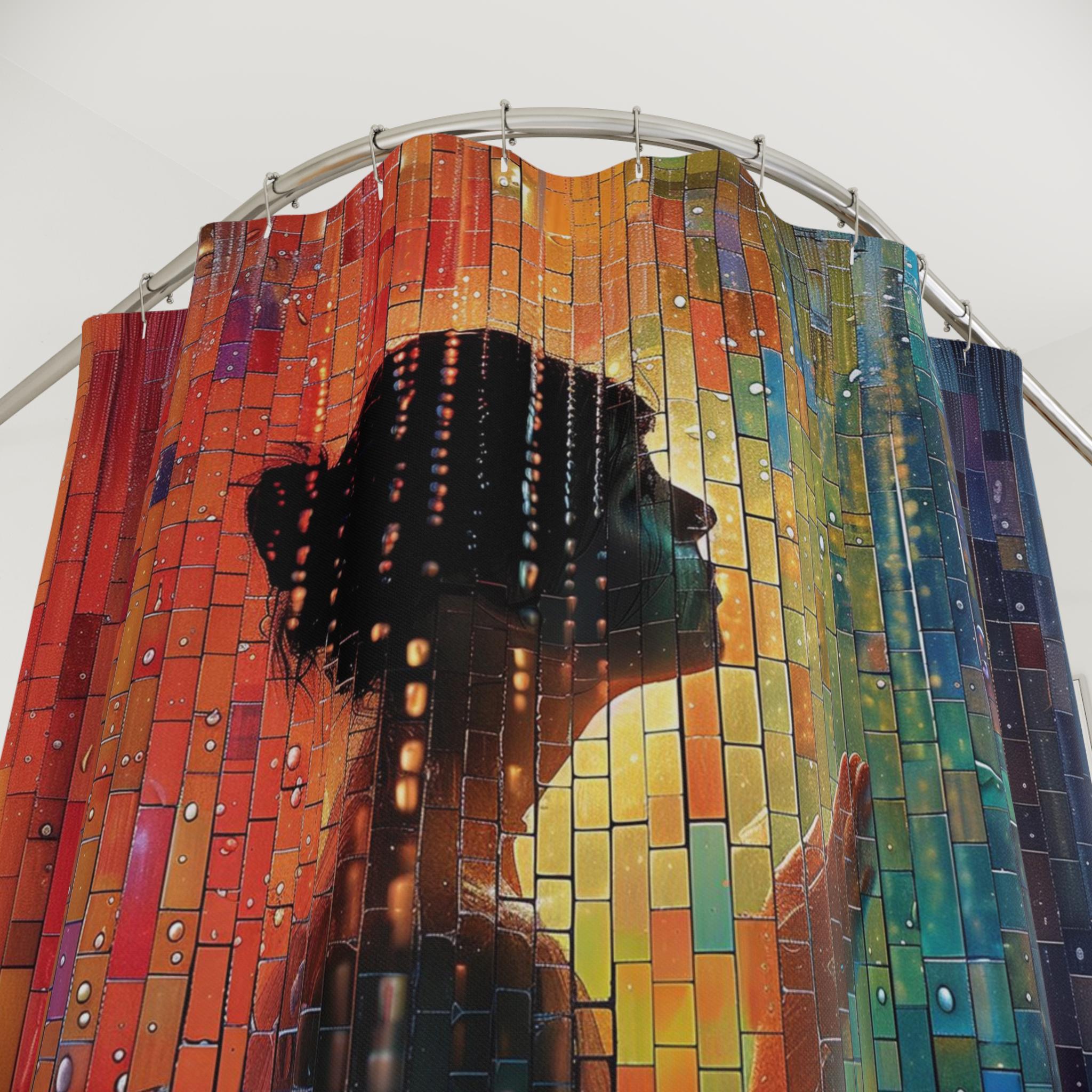 Introducing our captivating shower curtain, where elegance meets artistry. Adorned with the silhouette of a woman enjoying a refreshing shower against a backdrop of stunning multicolored mosaic tiles, this curtain adds a touch of sophistication to any bathroom.