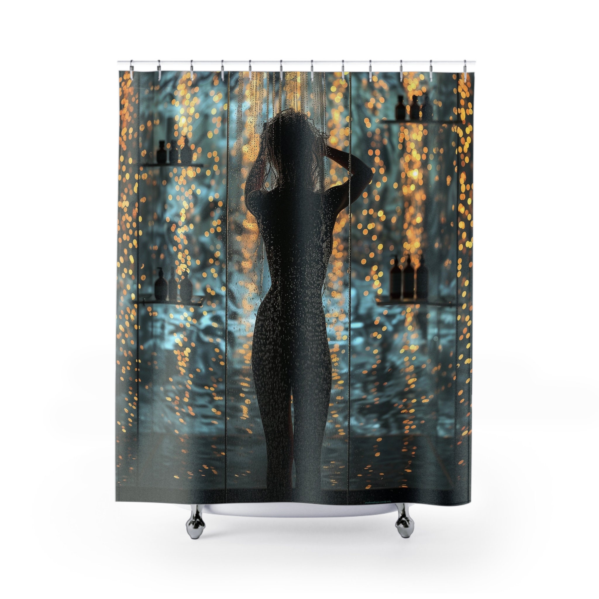 Transform your bathroom into a serene sanctuary with our luxurious shower curtain. Crafted to evoke the mesmerizing play of light on sparkling water, this curtain features a stunning depiction of a silhouette figure amidst opulent drapery. The design creates an ambiance of tranquility and elegance, elevating your bathing experience to new heights.