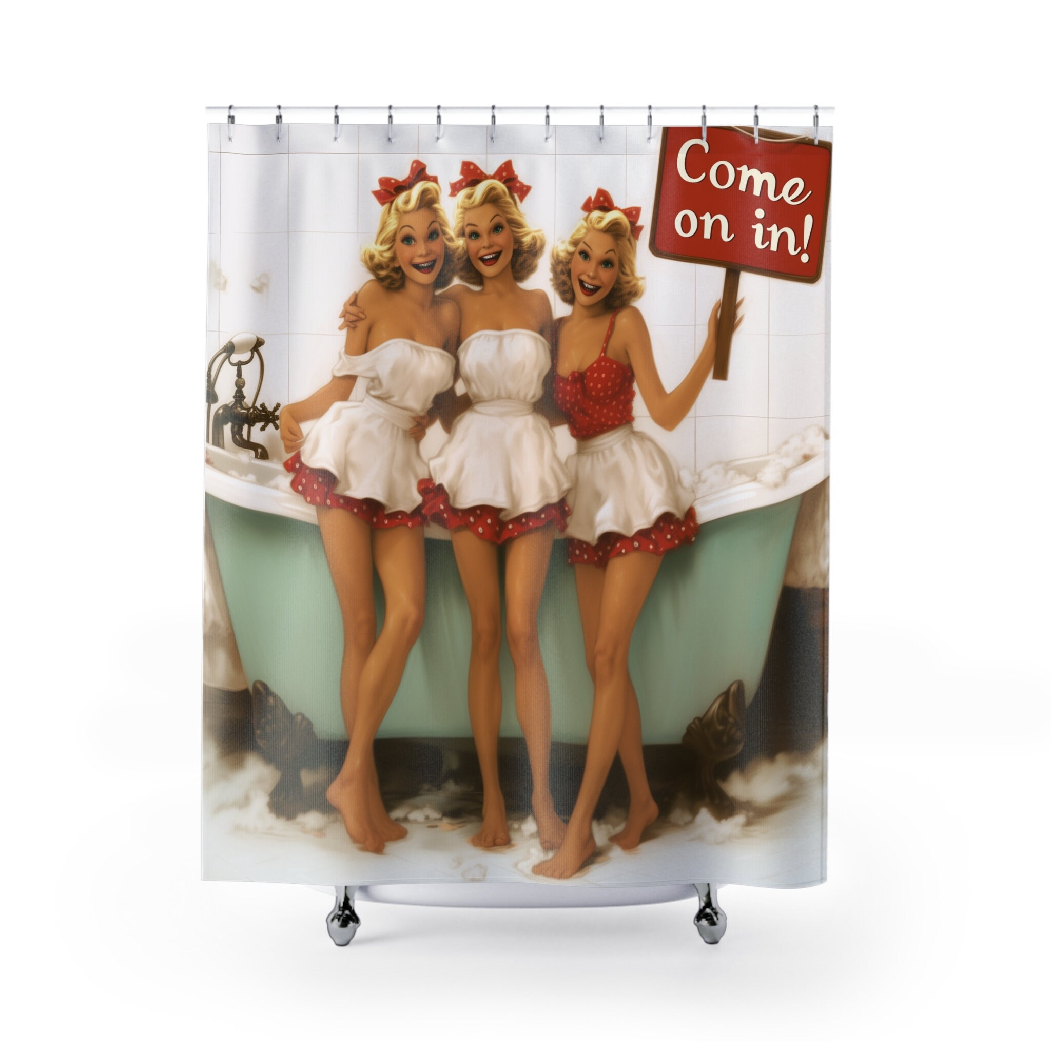 Add a touch of vintage glamour to your bathroom with our Pin-Up Girls Shower Curtain, featuring three stunning ladies beckoning you to "Come on in!" This unique design adds a playful and inviting atmosphere to your space, perfect for a touch of retro charm.