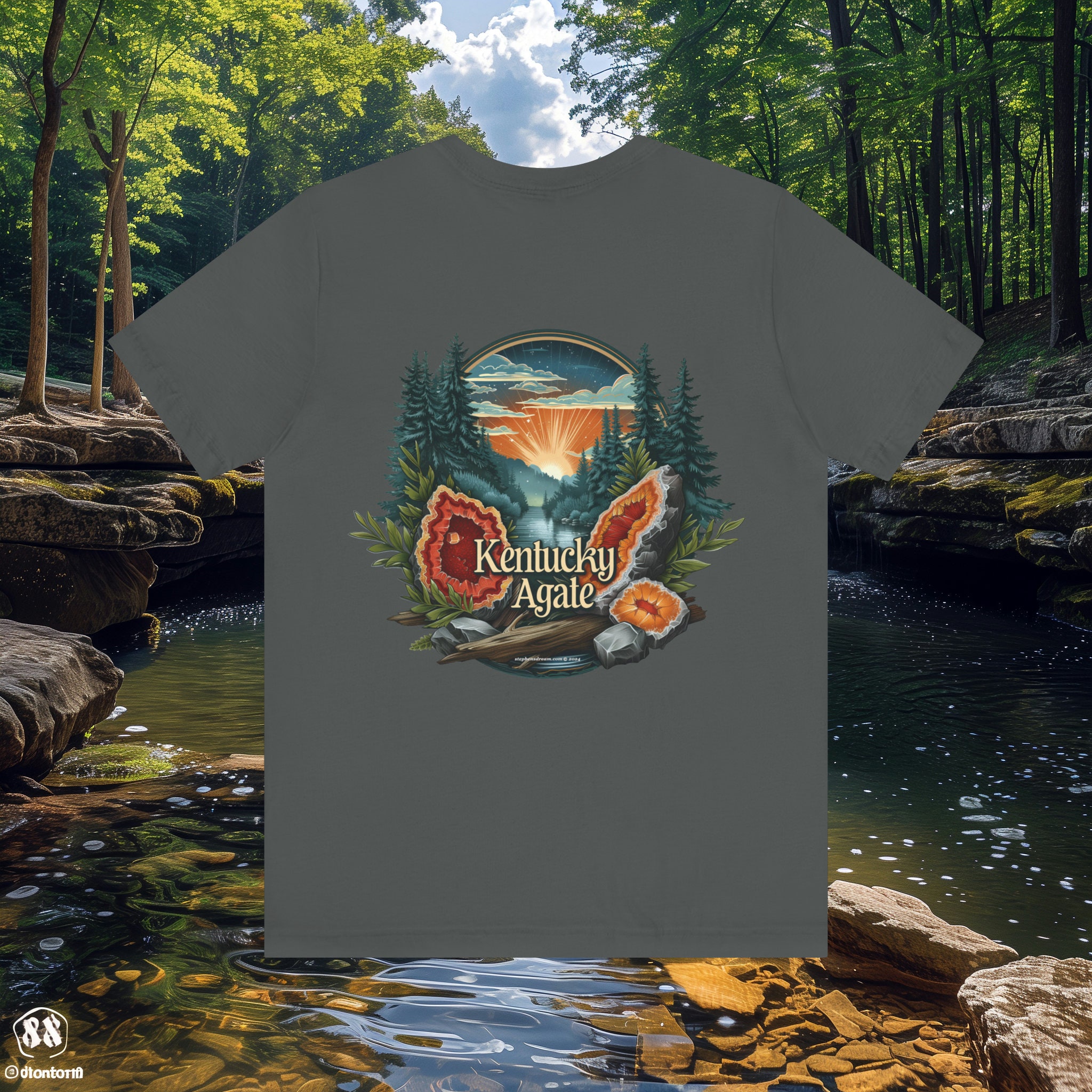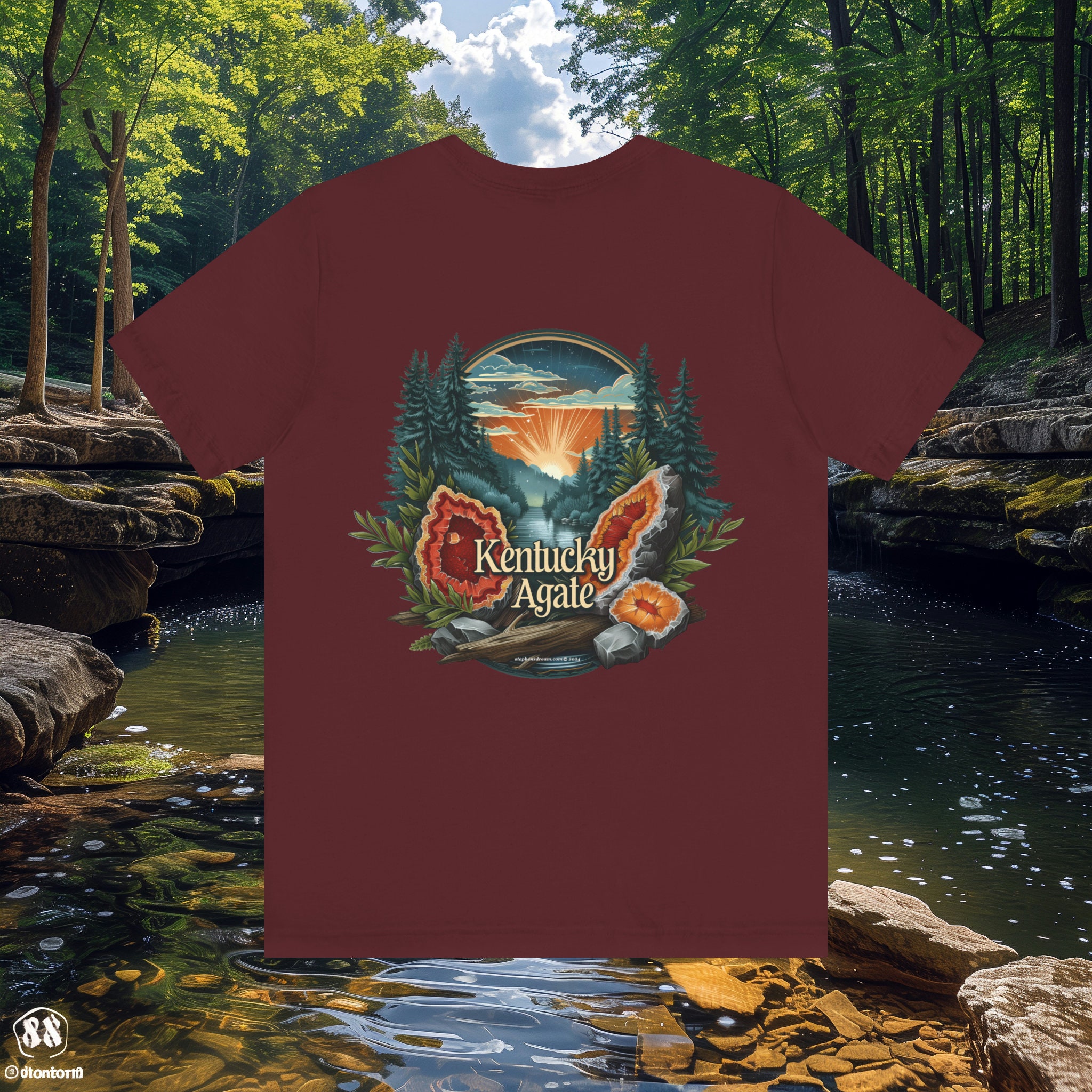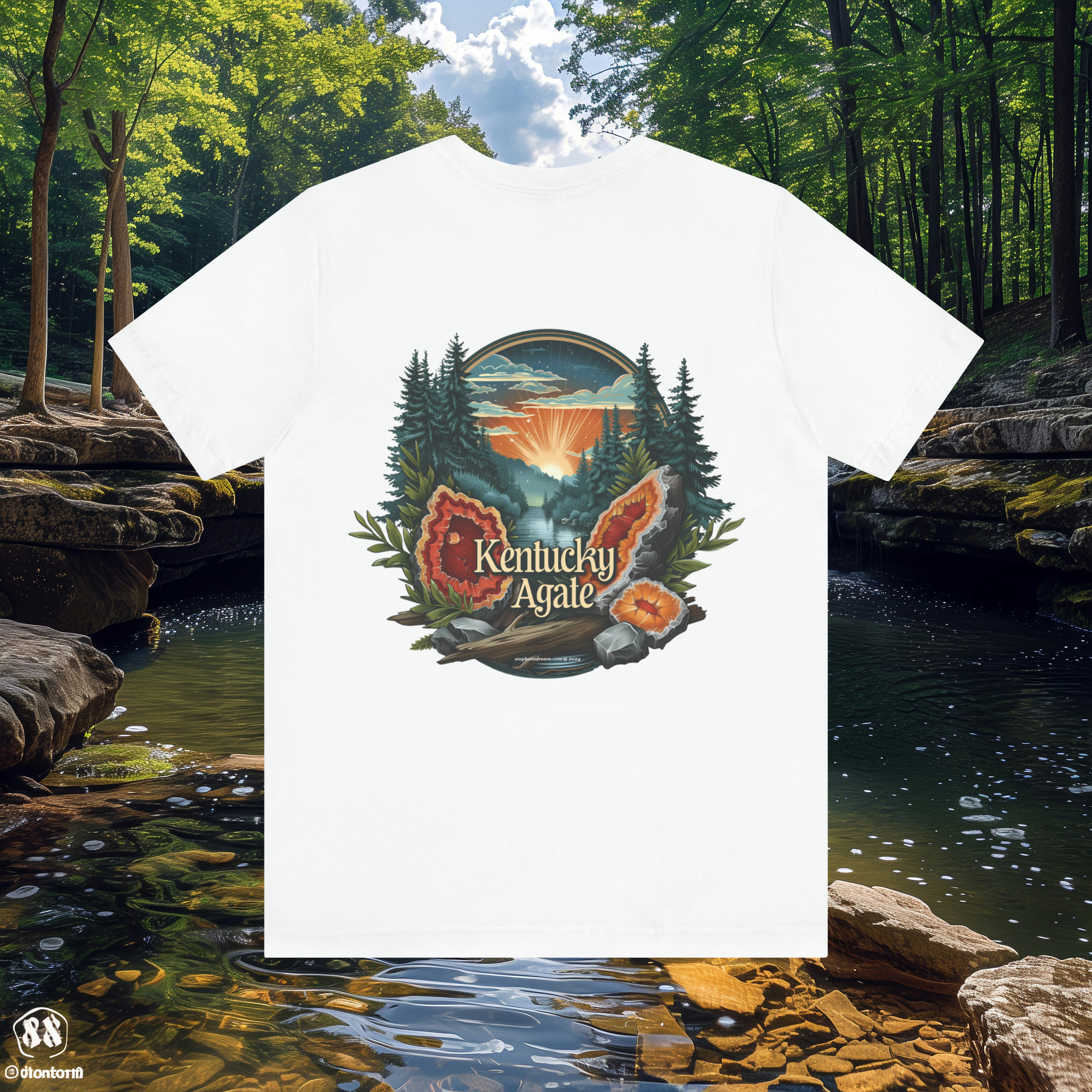 Back: Immerse yourself in the captivating beauty of Kentucky Agate with our stunning scene of agate geodes nestled beside a tranquil creek and lush trees. This mesmerizing design captures the essence of Kentucky's natural splendor, inviting you to uncover its hidden treasures.