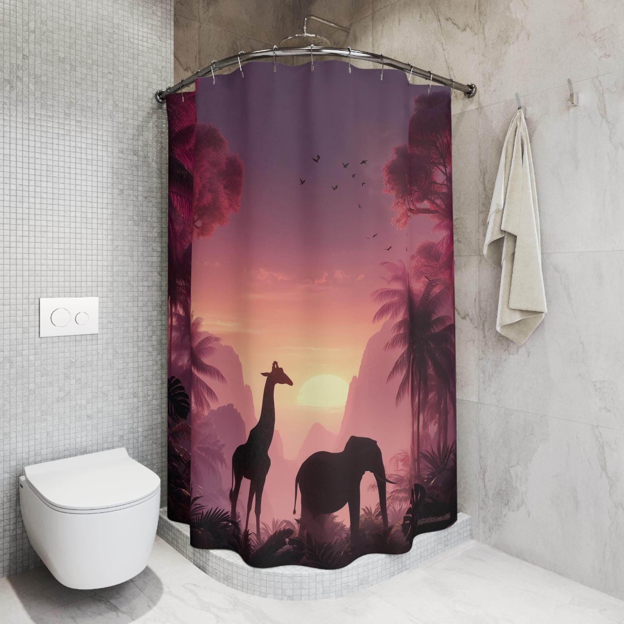 Transform your bathroom with this stunning shower curtain featuring a dreamy, tropical design! The artwork captures a magical sunset with a vibrant pink and purple sky, silhouetting a giraffe and elephant amidst lush palm trees, exotic foliage, and distant mountains. Birds soar above, adding to the serene, wild atmosphere. Crafted from 100% highly durable polyester, this shower curtain retains its shape, dries quickly, and provides a perfect canvas for the vivid print, staying like new for years. It includes 12 buttonholes at the top for easy hook placement. Please note: While polyester offers adequate water resistance, a liner may be necessary for full waterproofness.