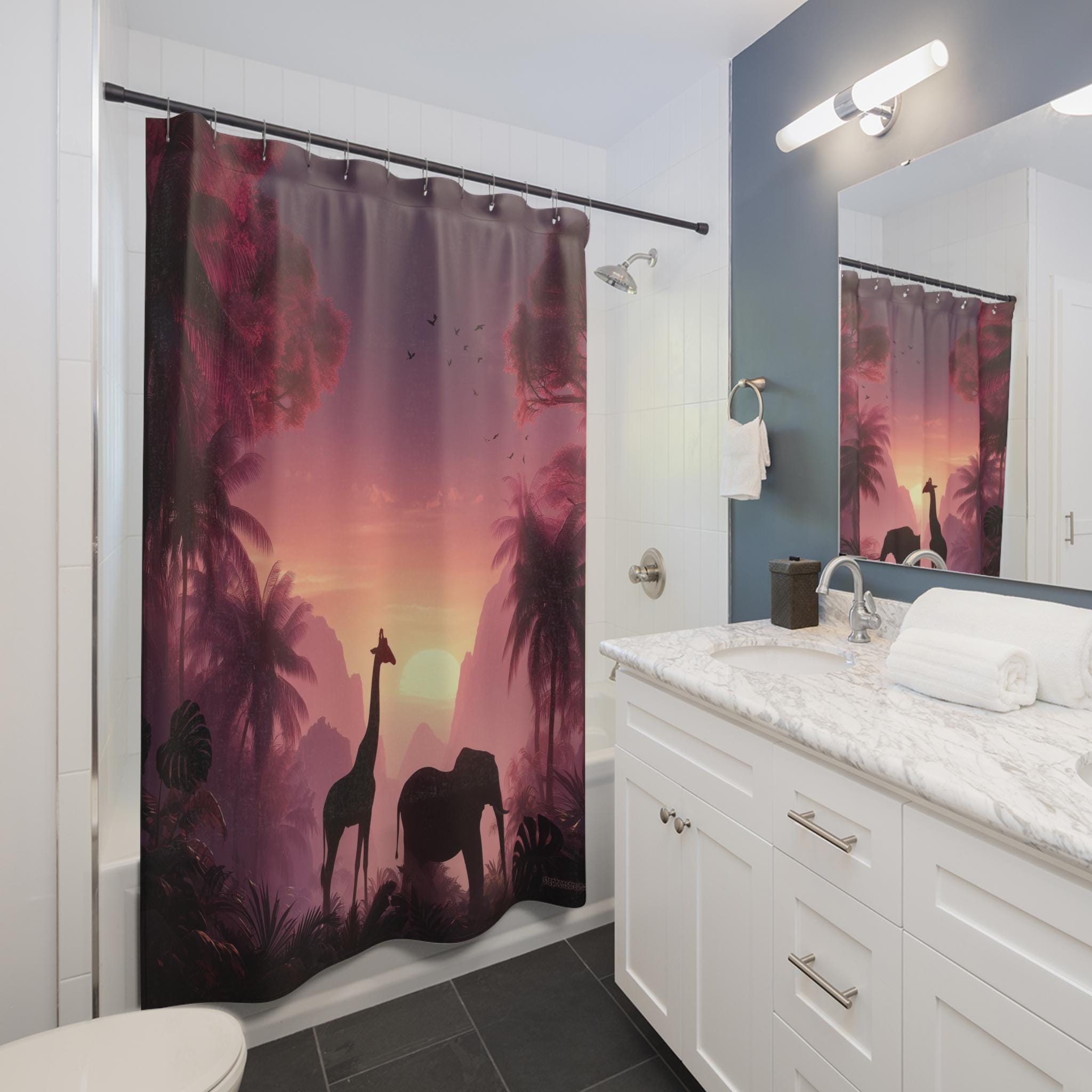 Transform your bathroom with this stunning shower curtain featuring a dreamy, tropical design! The artwork captures a magical sunset with a vibrant pink and purple sky, silhouetting a giraffe and elephant amidst lush palm trees, exotic foliage, and distant mountains. Birds soar above, adding to the serene, wild atmosphere. Crafted from 100% highly durable polyester, this shower curtain retains its shape, dries quickly, and provides a perfect canvas for the vivid print, staying like new for years. It includes 12 buttonholes at the top for easy hook placement. Please note: While polyester offers adequate water resistance, a liner may be necessary for full waterproofness.