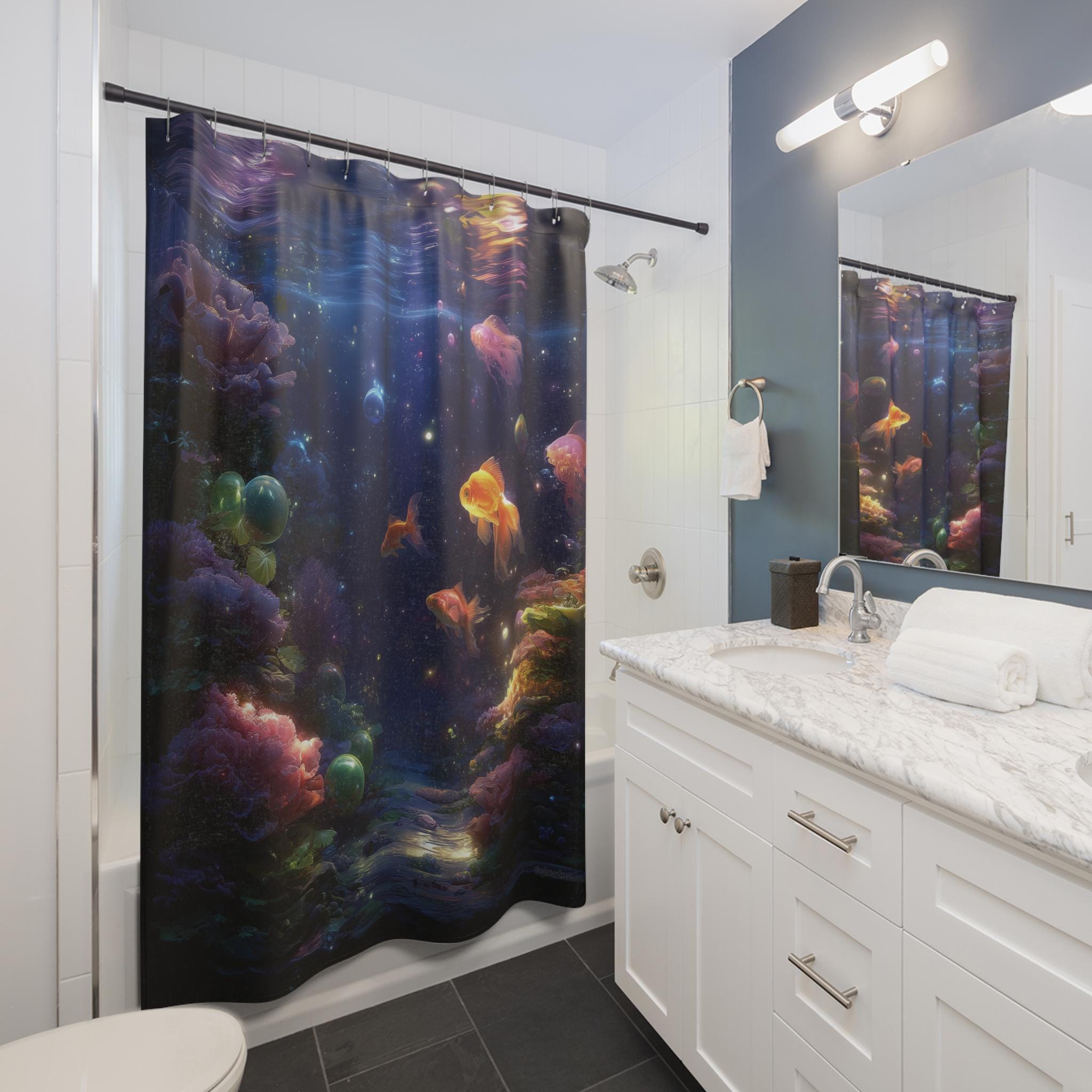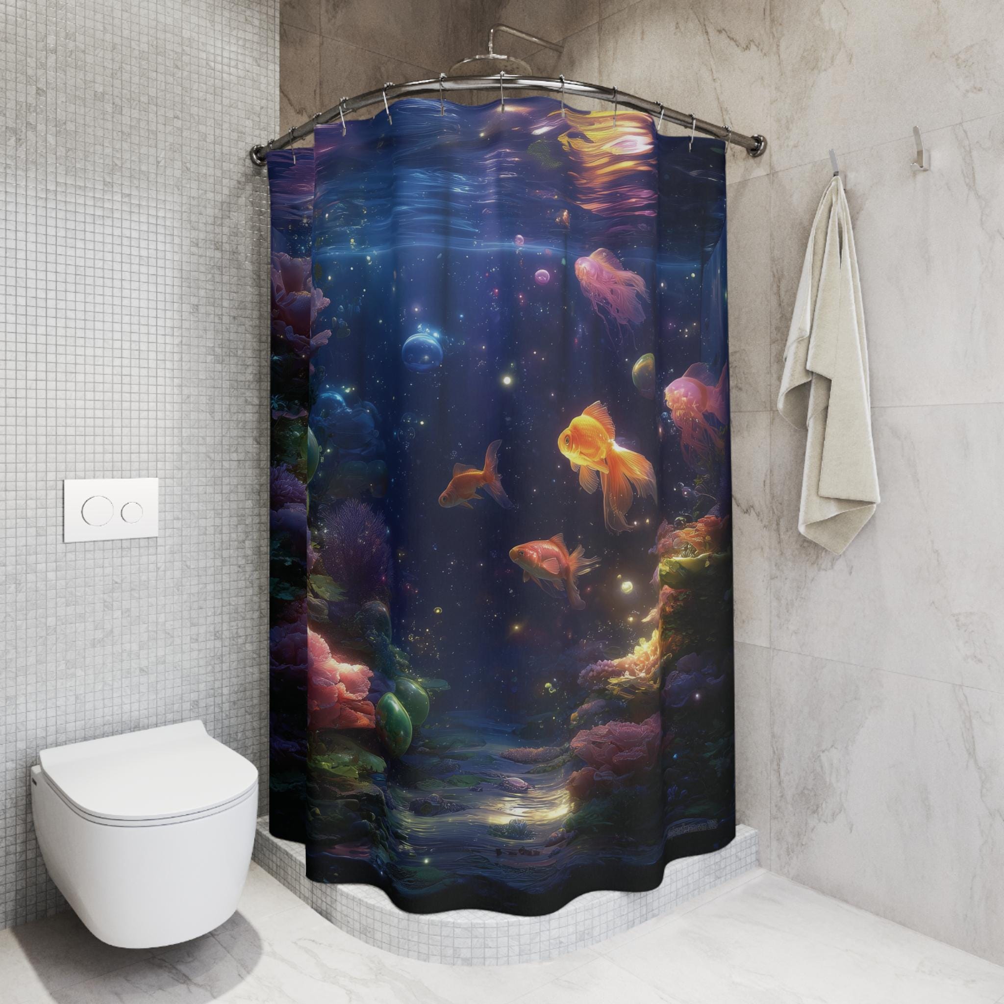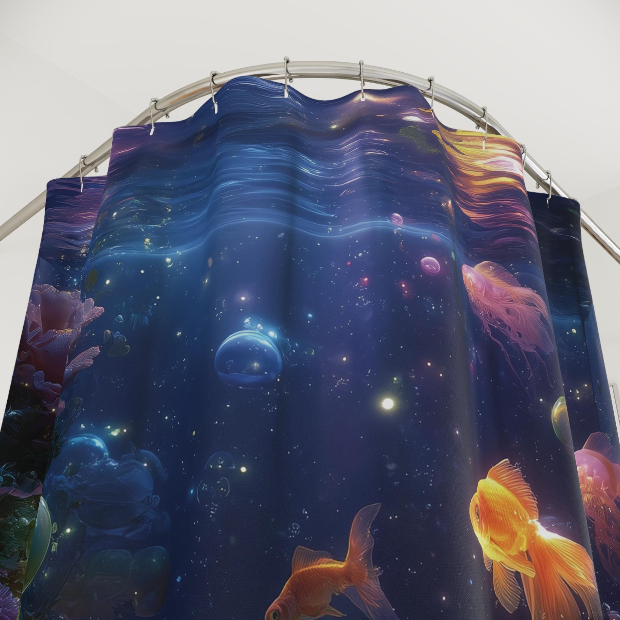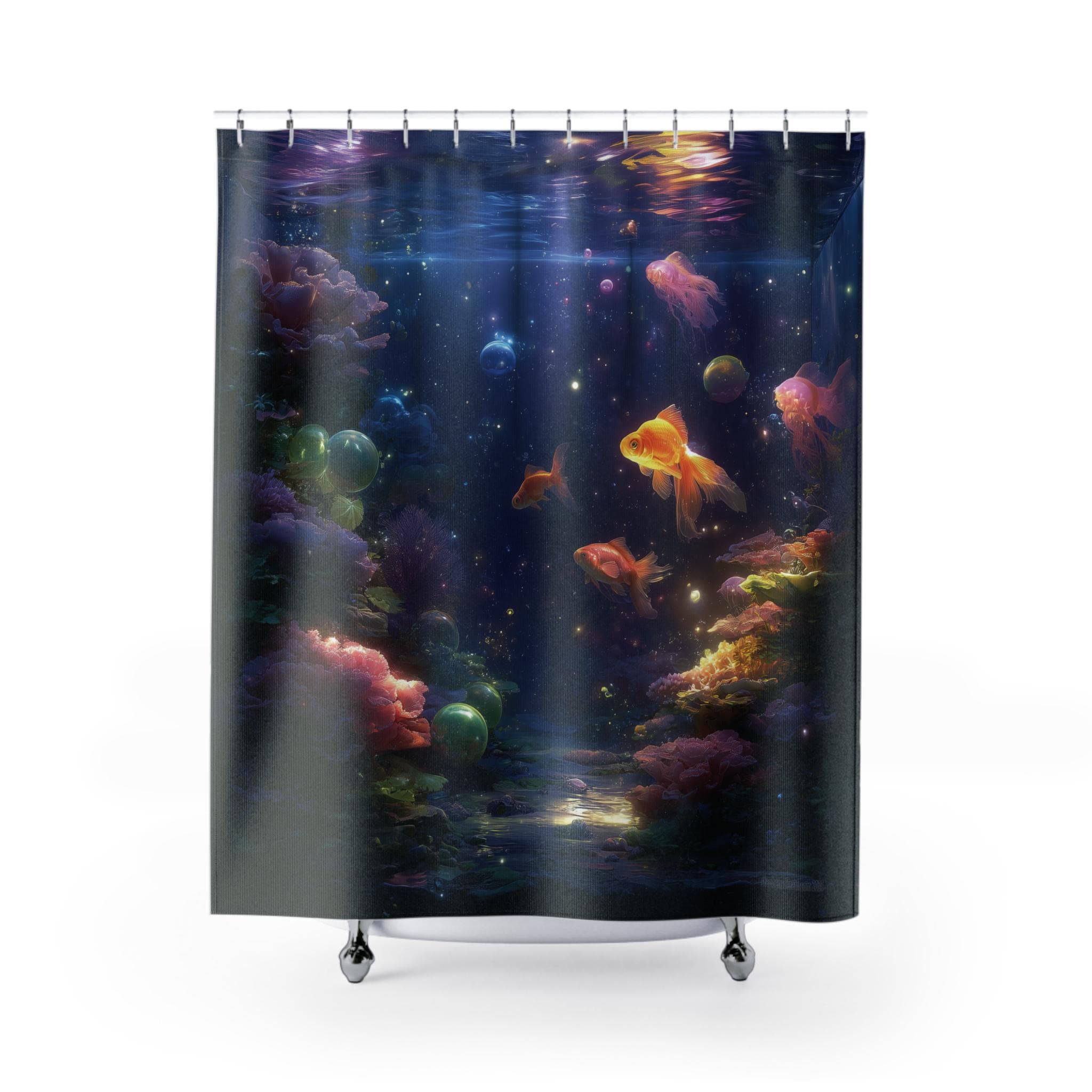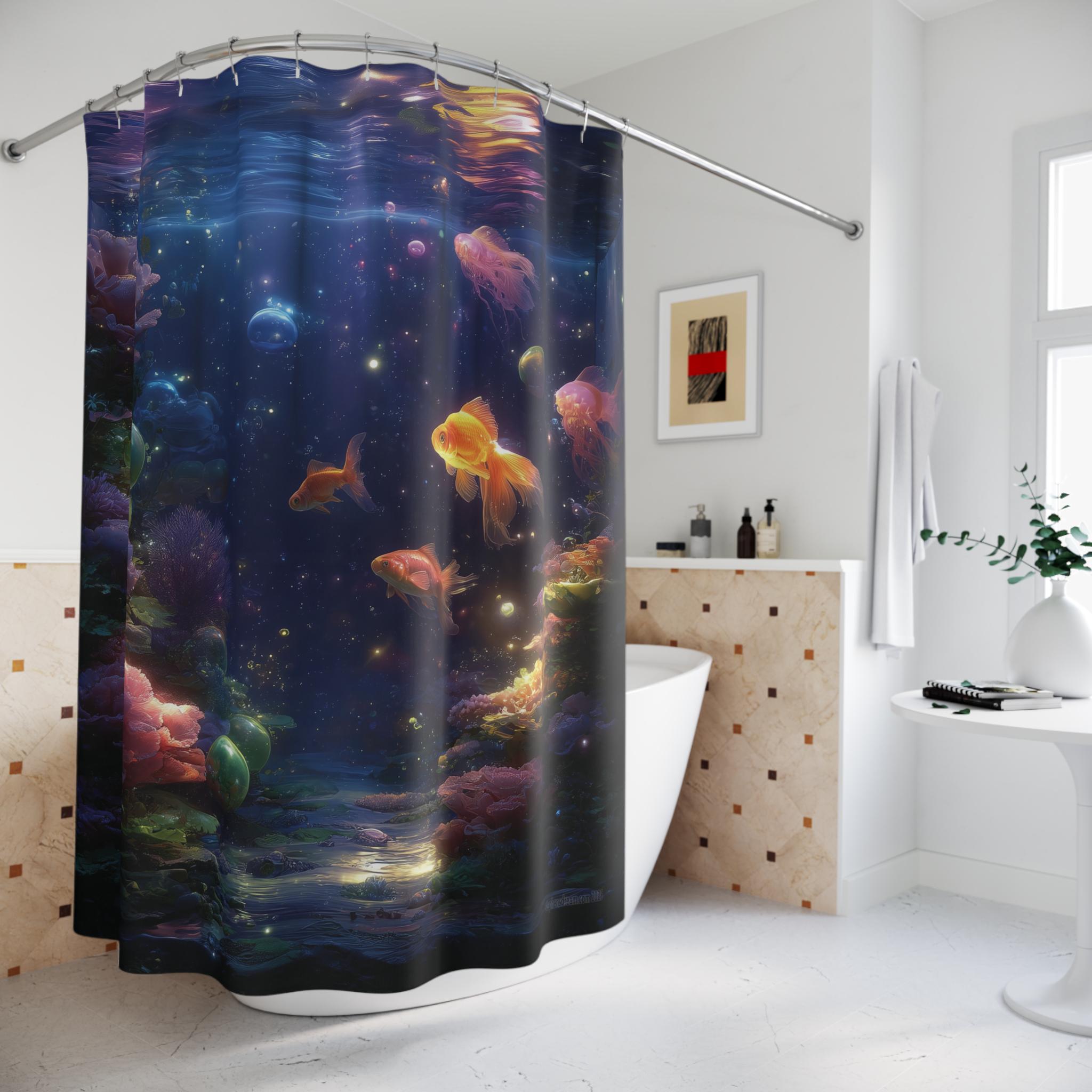 Turn your daily rinse into a magical escape with this Cosmic Aquarium Shower Curtain – where glowing goldfish drift through a dreamlike galaxy of bubbles, corals, and stardust. The scene is rich with deep blues, luminous light trails, and surreal underwater textures that blend the beauty of space and sea into one mesmerizing design.