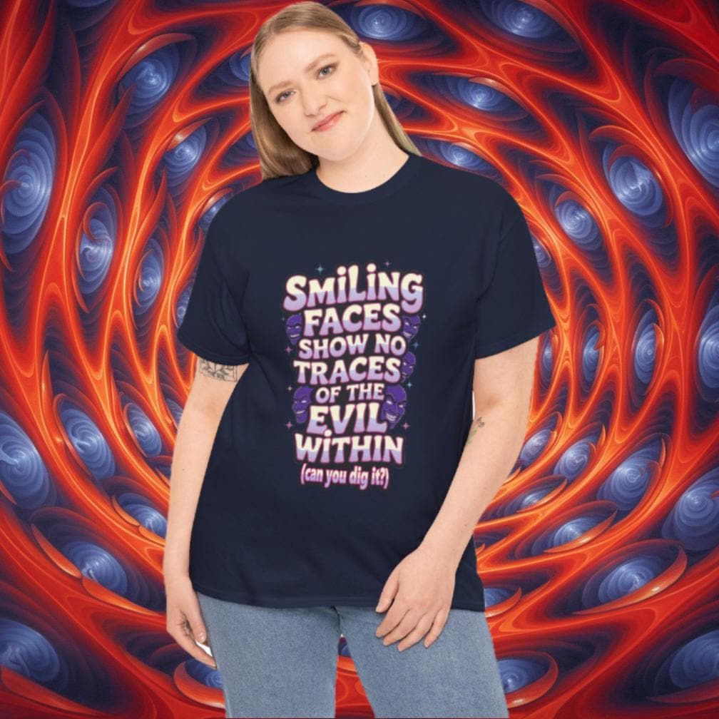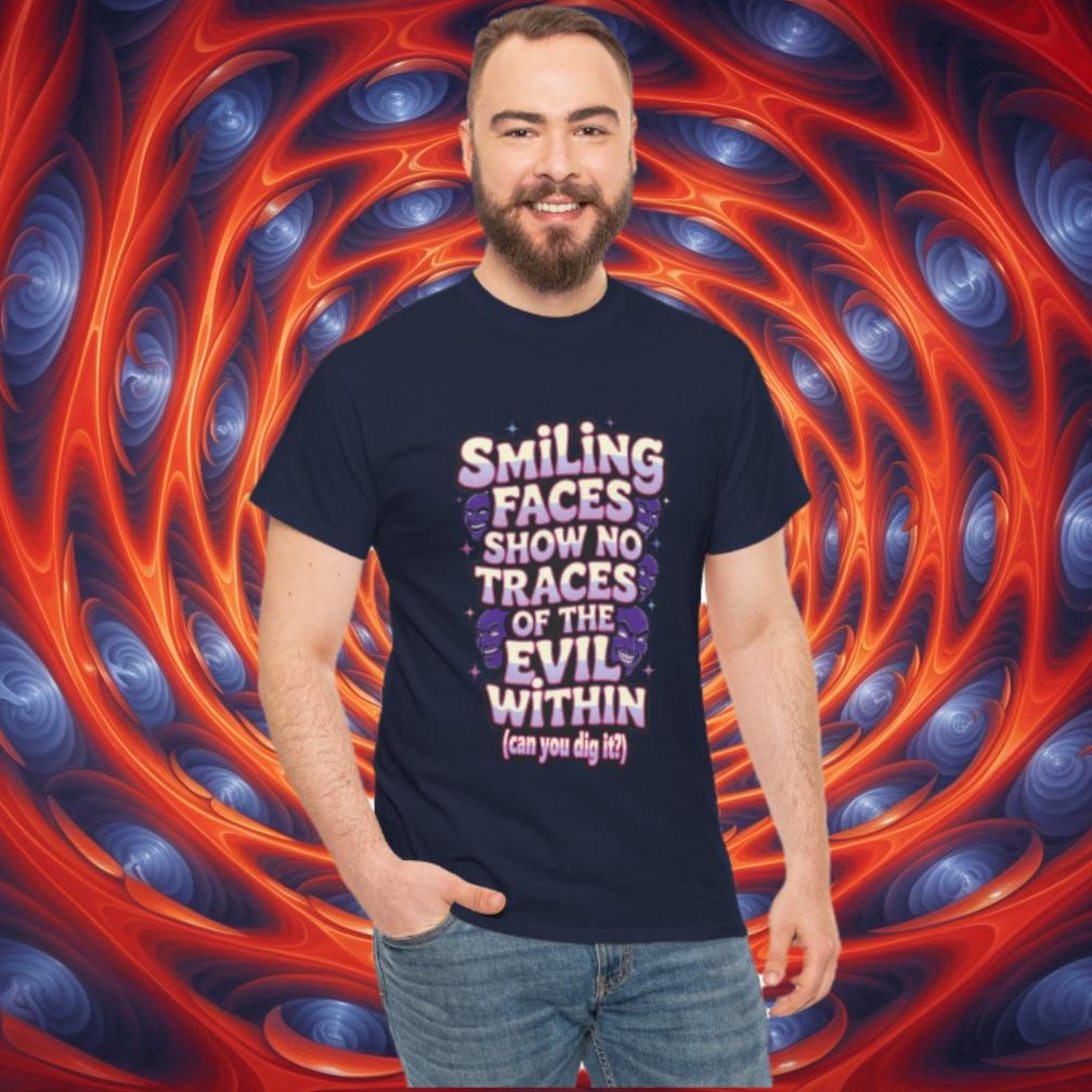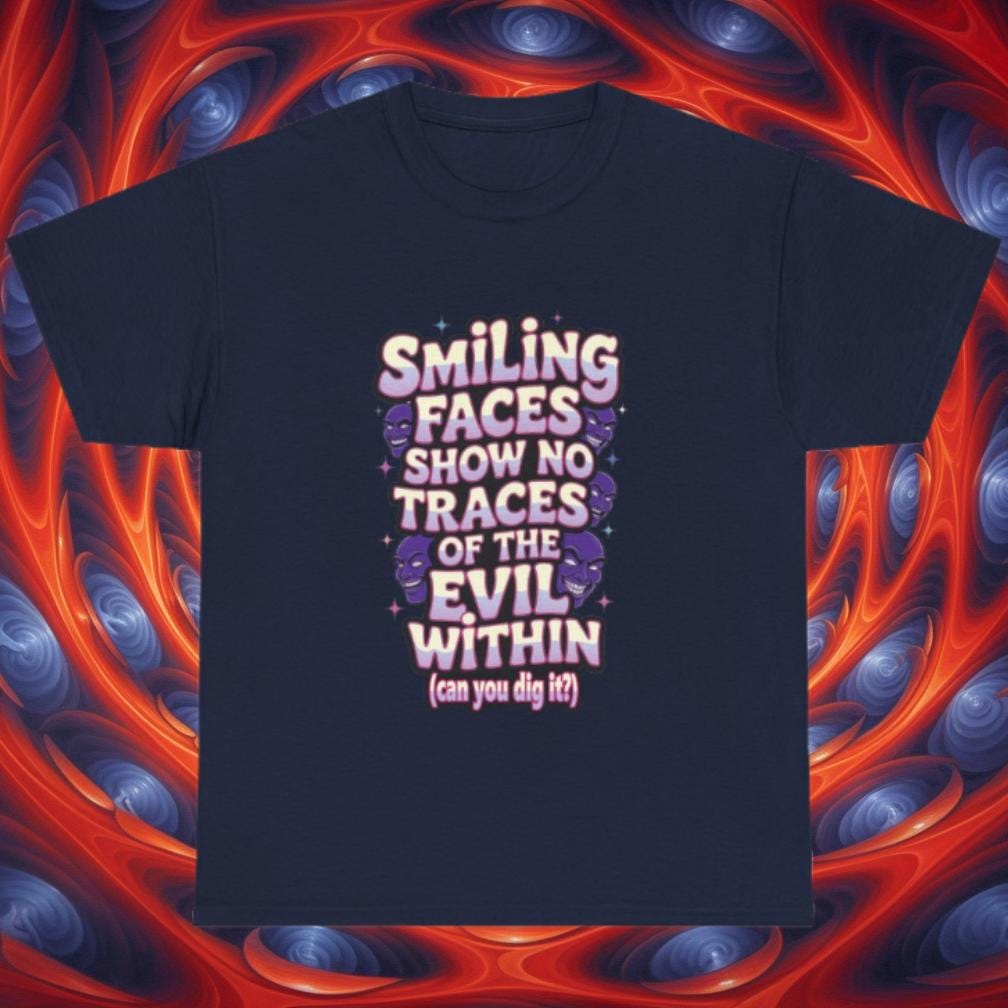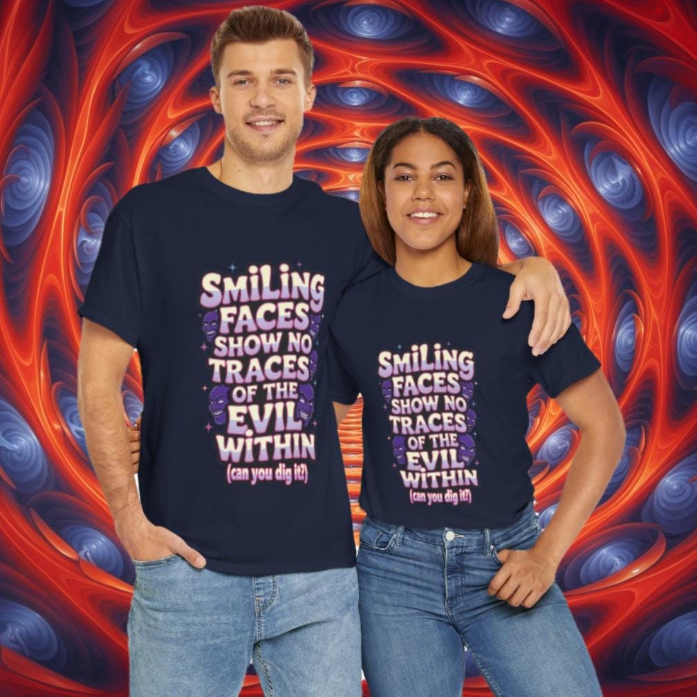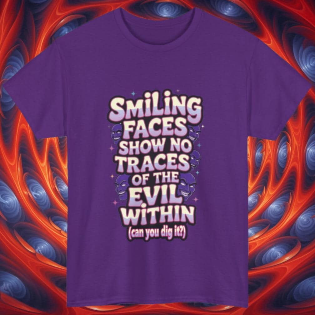 Not all smiles are friendly… some hide a darker side. This bold graphic tee says it all: “Smiling Faces Show No Traces of the Evil Within (Can You Dig It?)”. Featuring sinister grinning faces in glowing purple and white lettering, this shirt is perfect for anyone who loves a little wicked humor with their wardrobe.