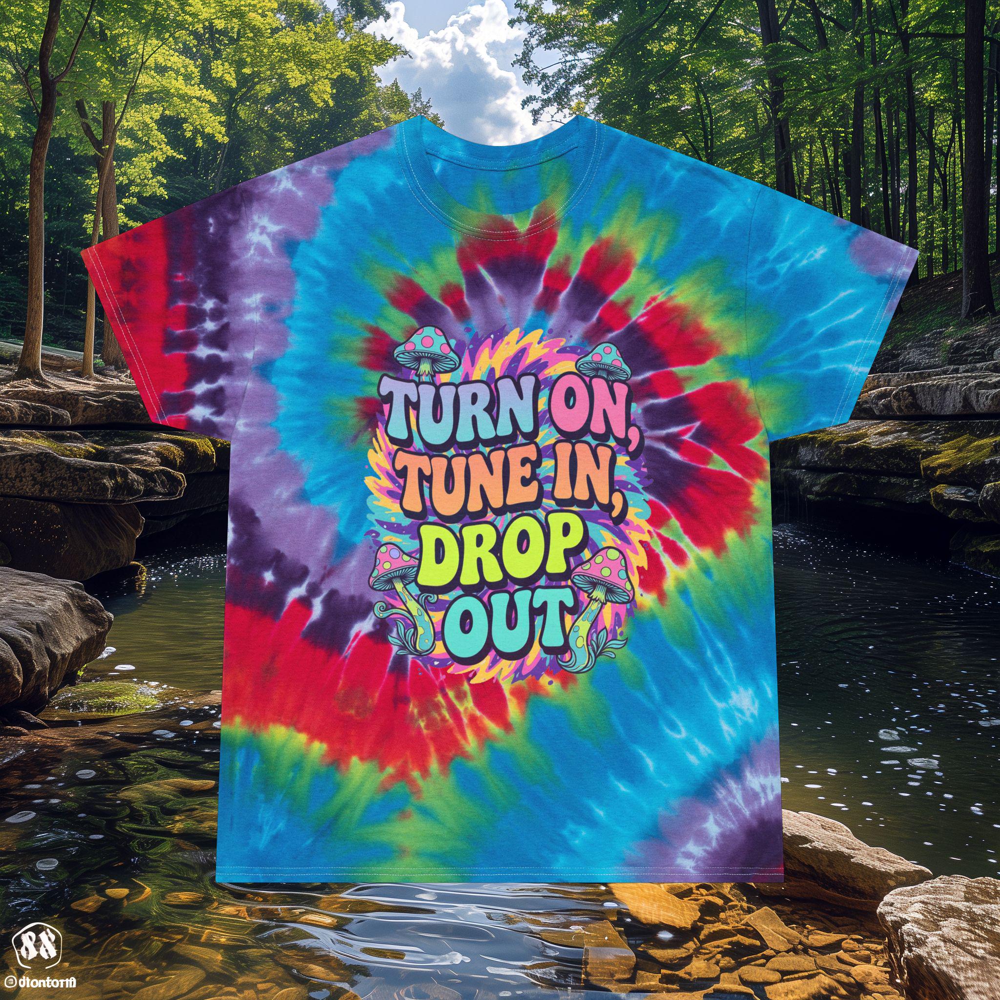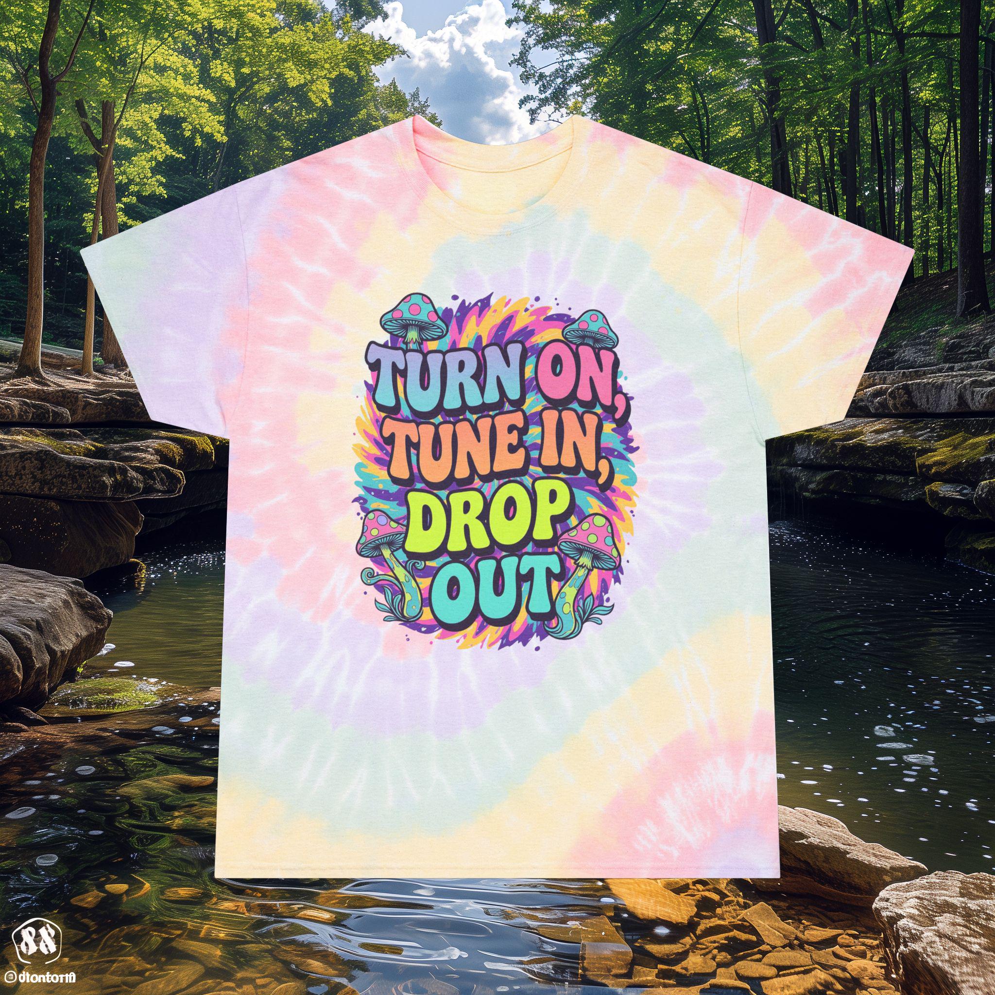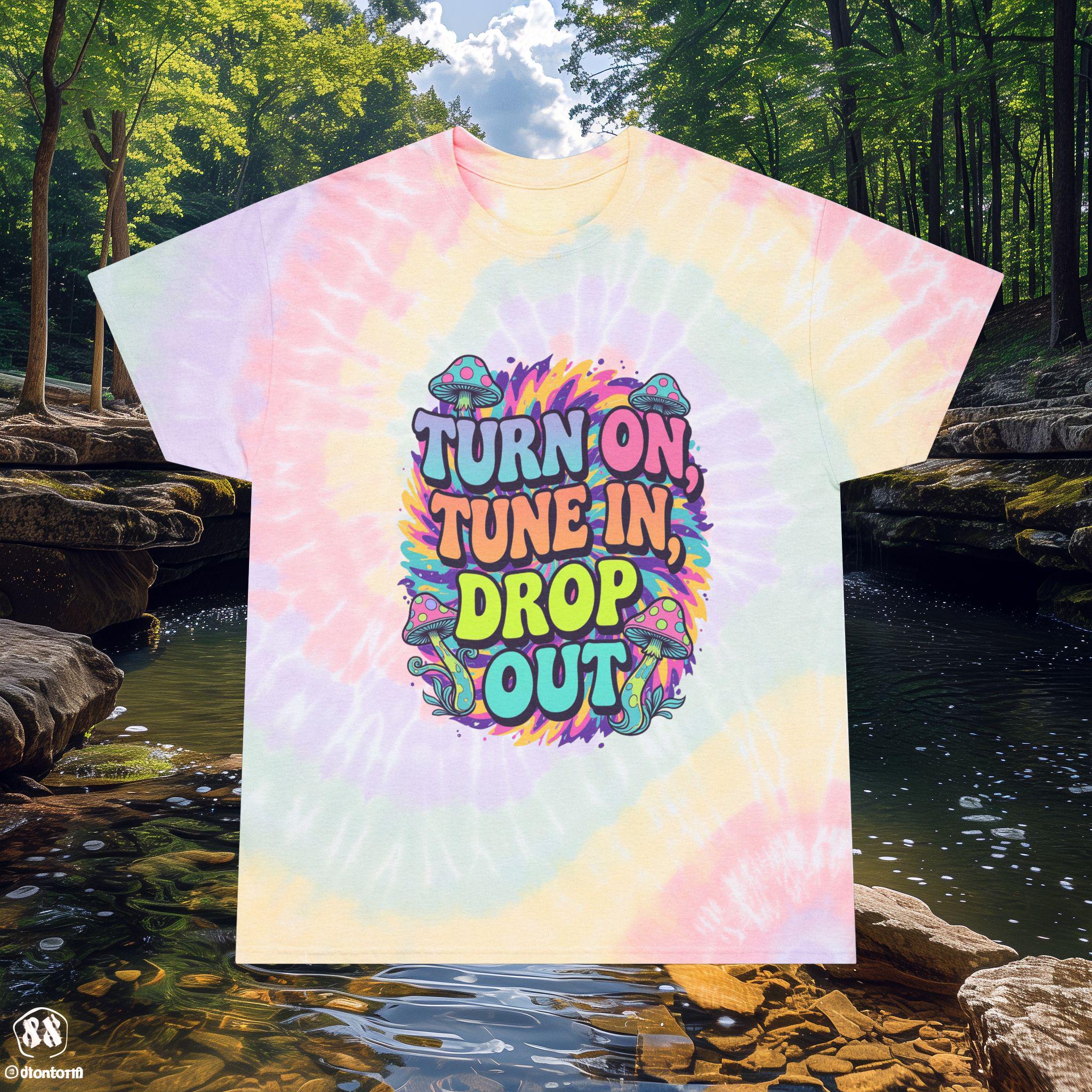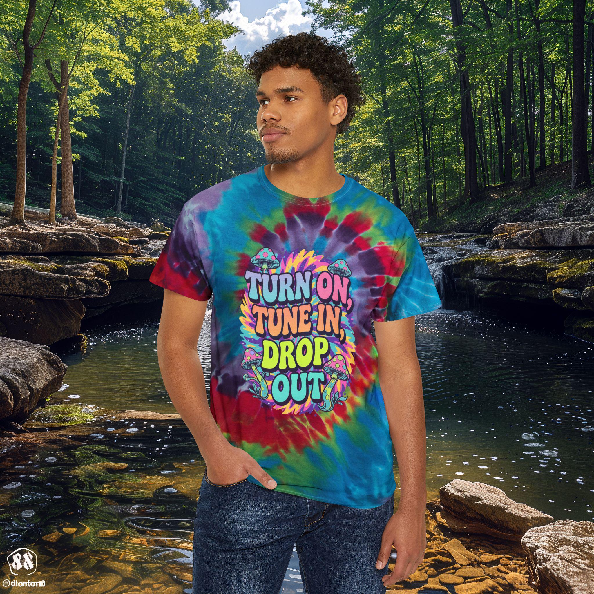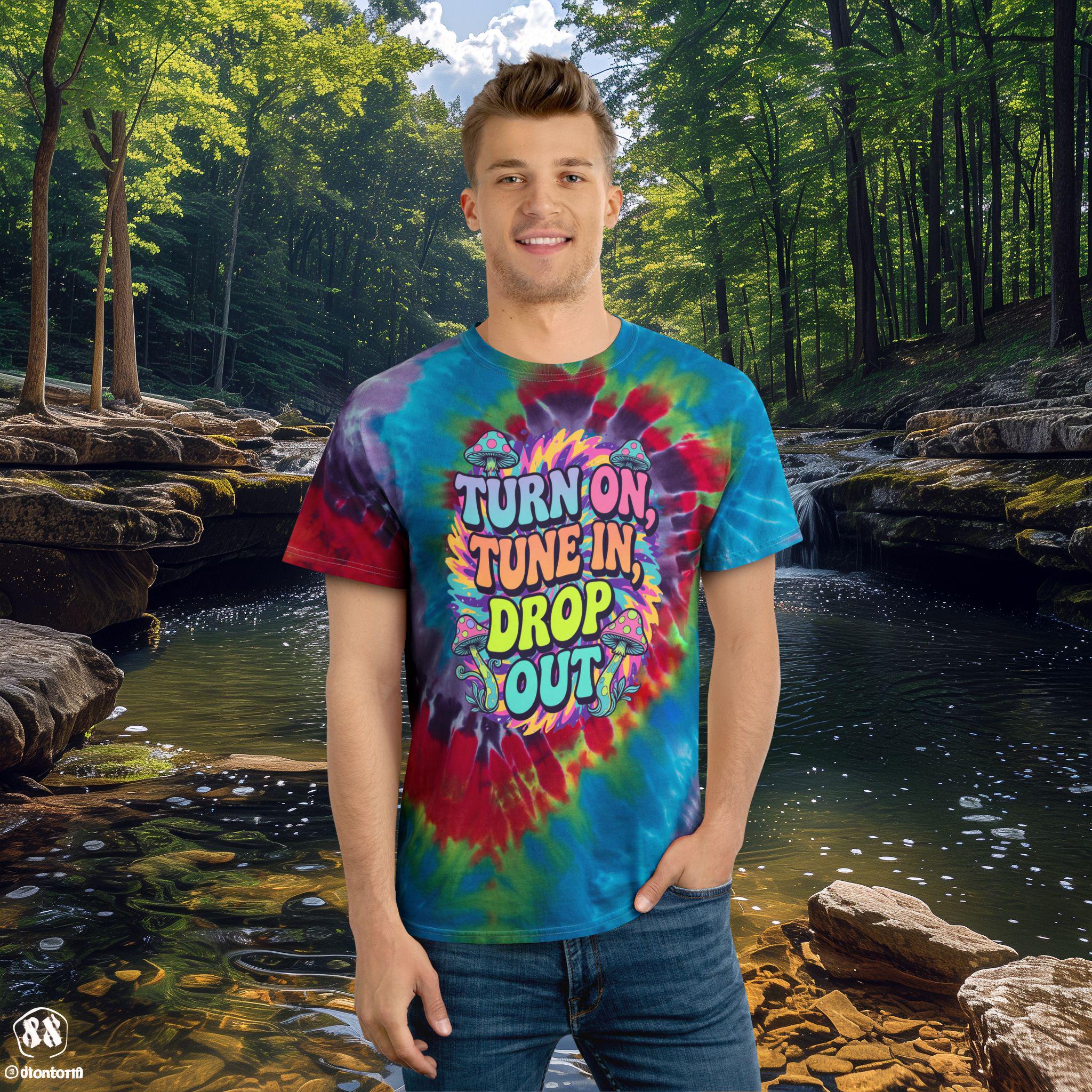 Turn on, tune in, drop out tie-dyed tee shirt that gives off a laid-back and retro vibe. Perfect for those who love vintage fashion and want to stand out. Ideal for music festivals, summer parties, and casual outings.