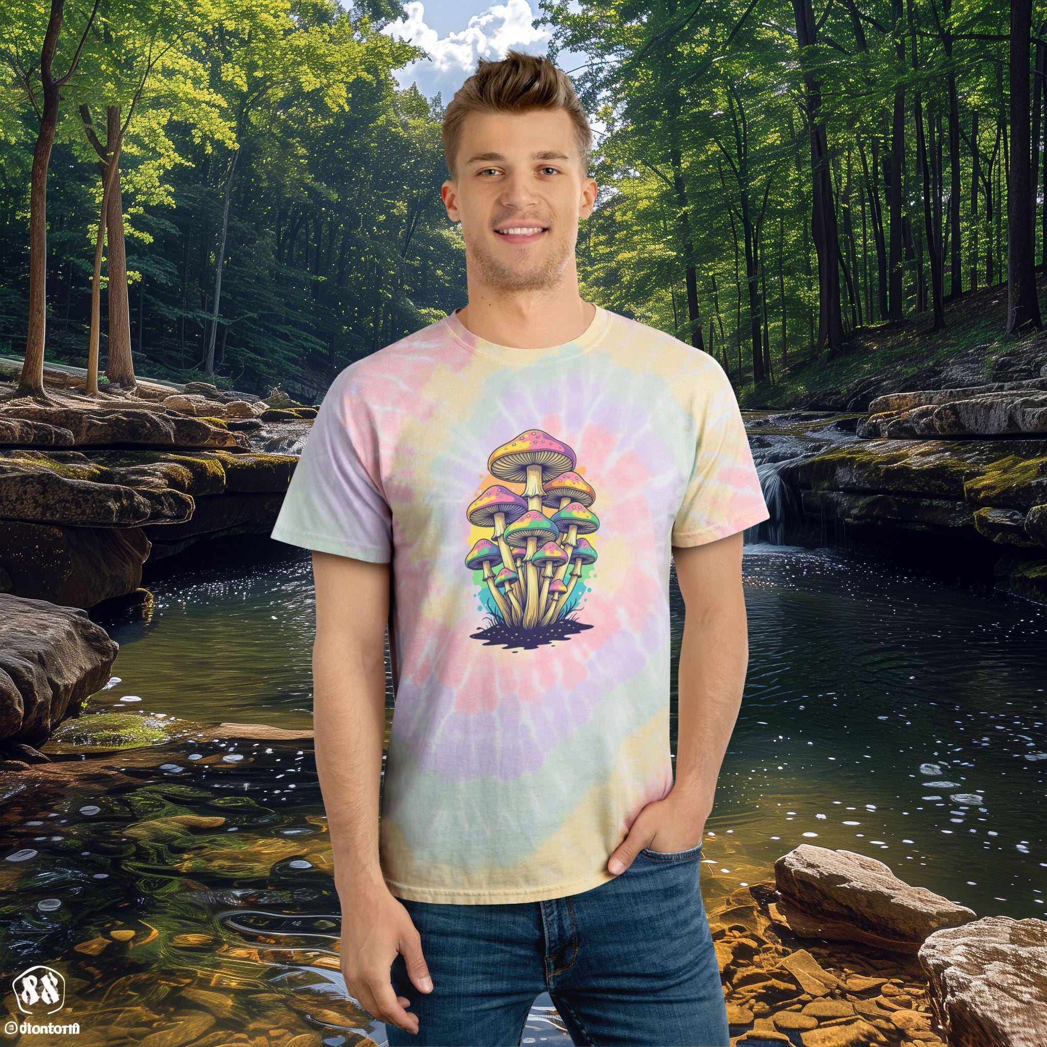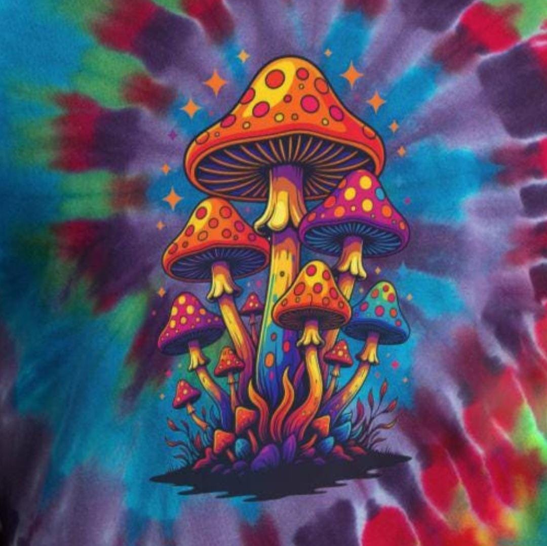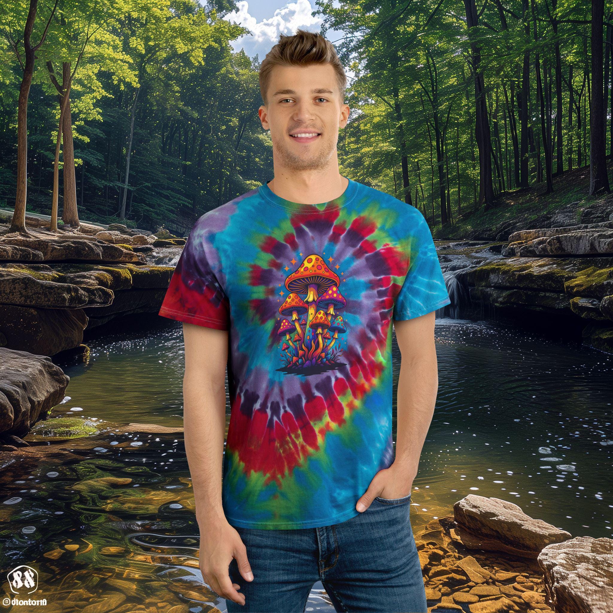 A psychedelic tie-dye shirt featuring a group of colorful mushrooms, perfect for those who love a retro and whimsical vibe. This Tee is ideal for festival-goers, hippie souls, or anyone looking to add a pop of fun to their wardrobe. Great for music festivals, hippie gatherings, or casual days out.