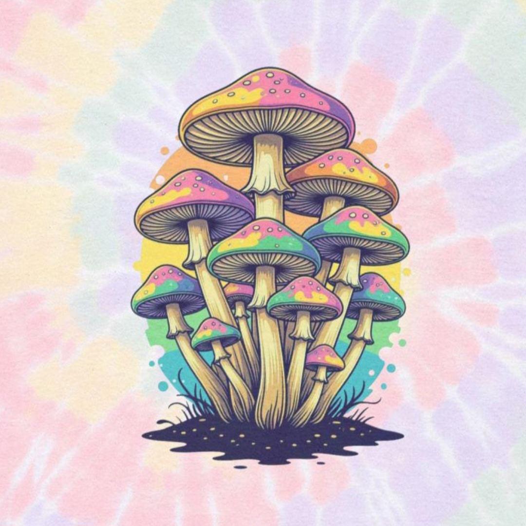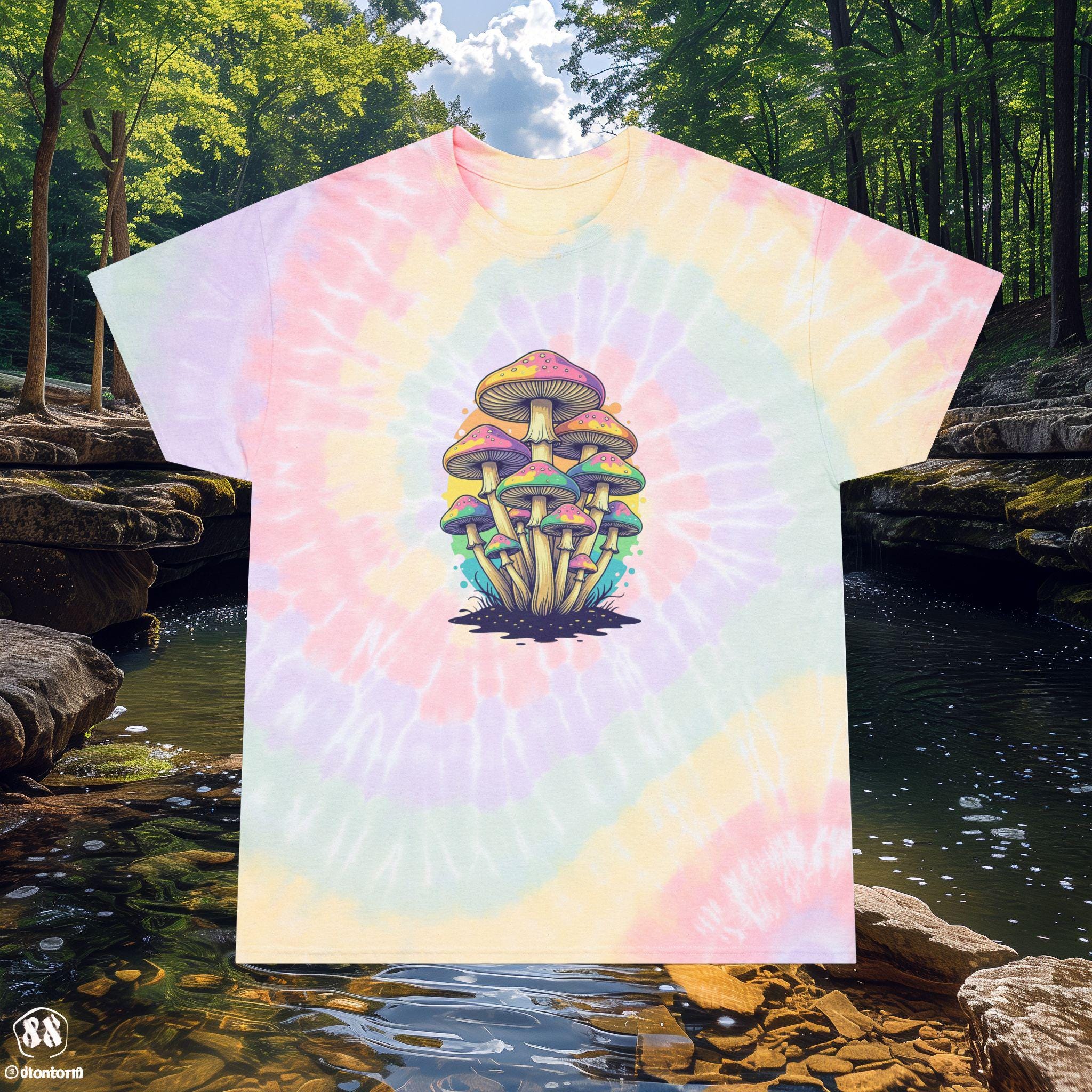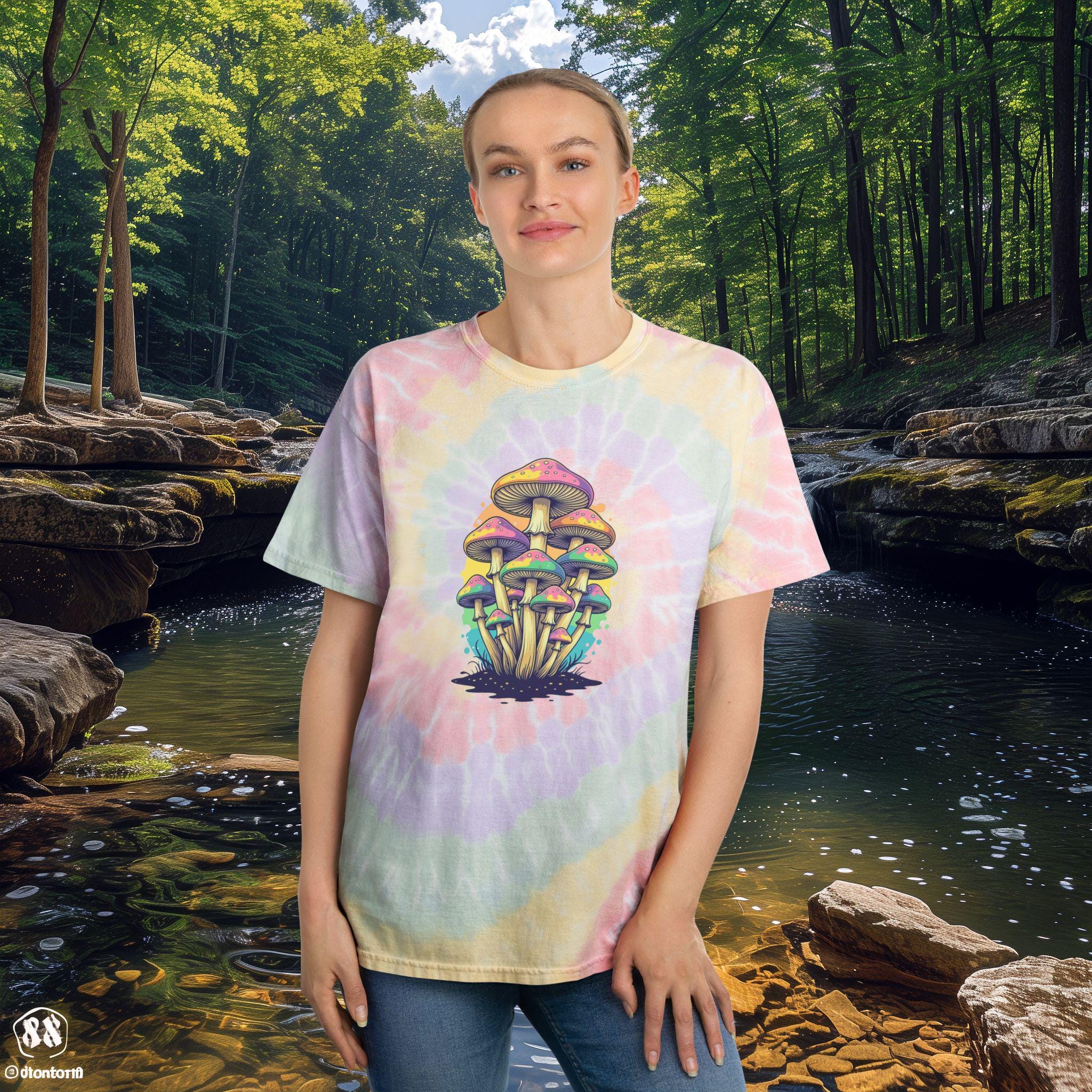 A psychedelic tie-dye shirt featuring a group of colorful mushrooms, perfect for those who love a retro and whimsical vibe. This Tee is ideal for festival-goers, hippie souls, or anyone looking to add a pop of fun to their wardrobe. Great for music festivals, hippie gatherings, or casual days out.