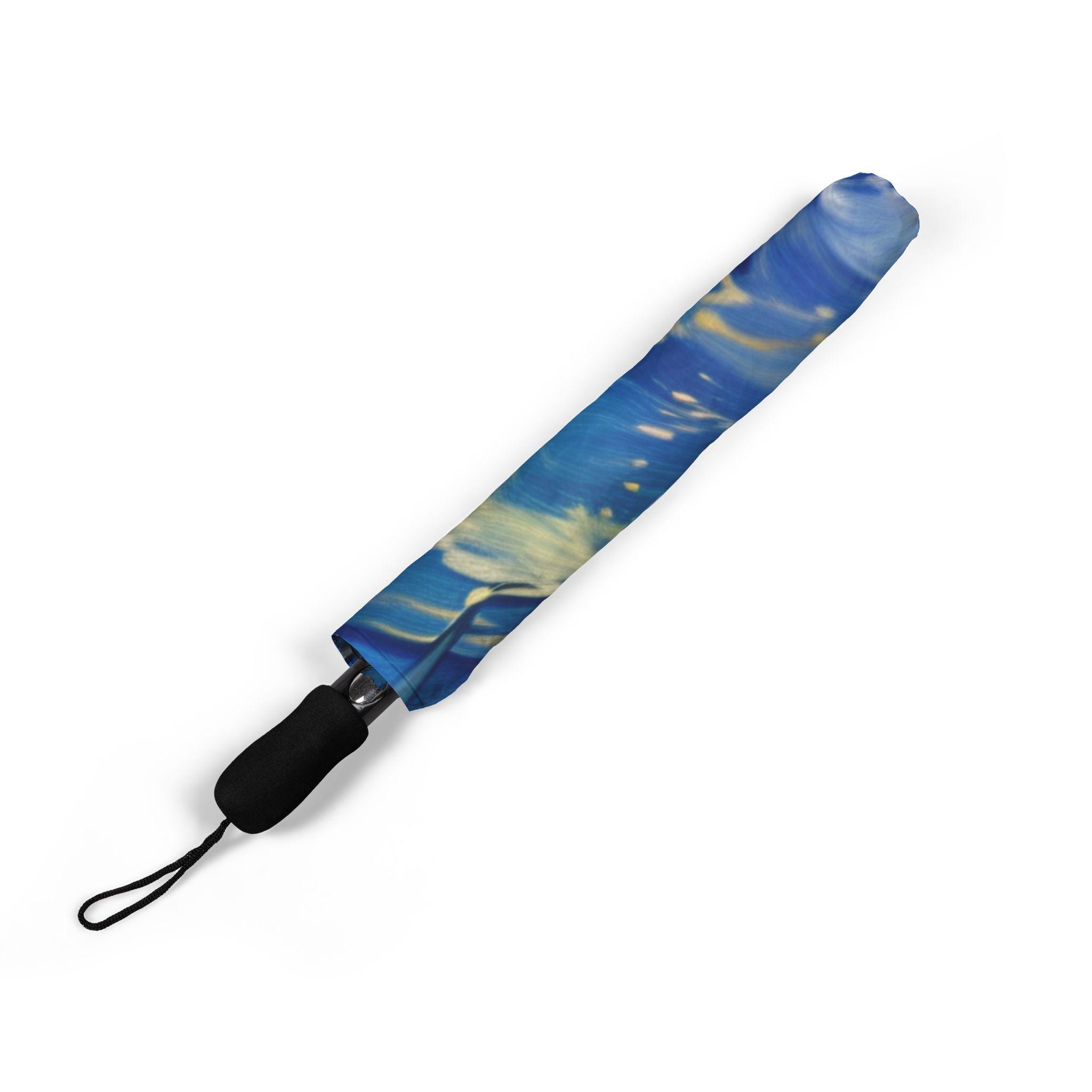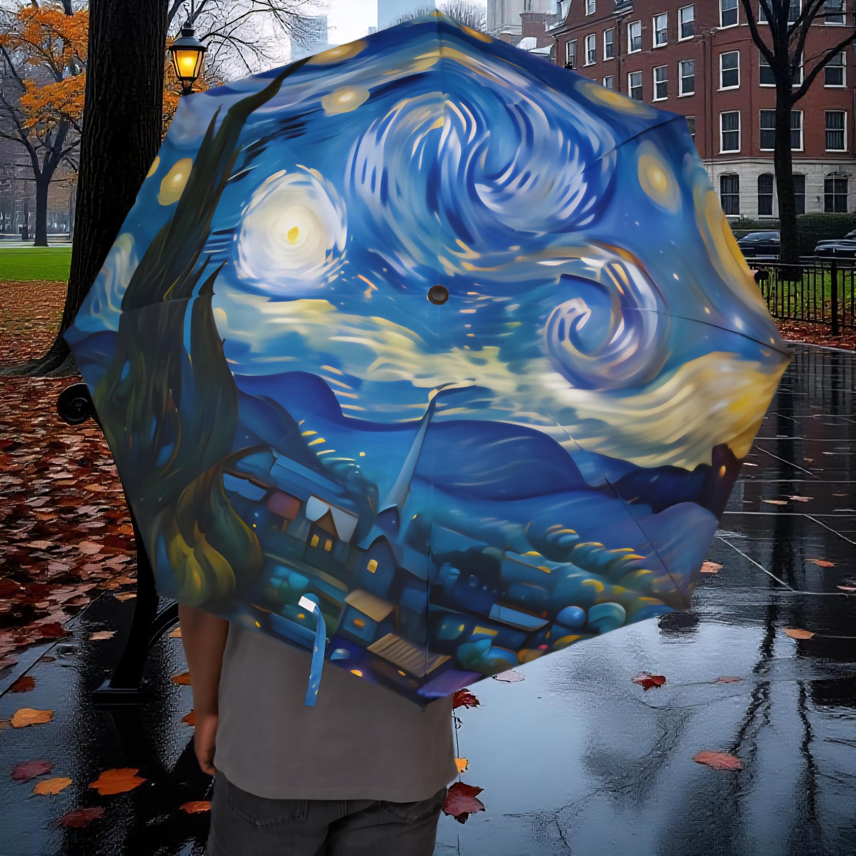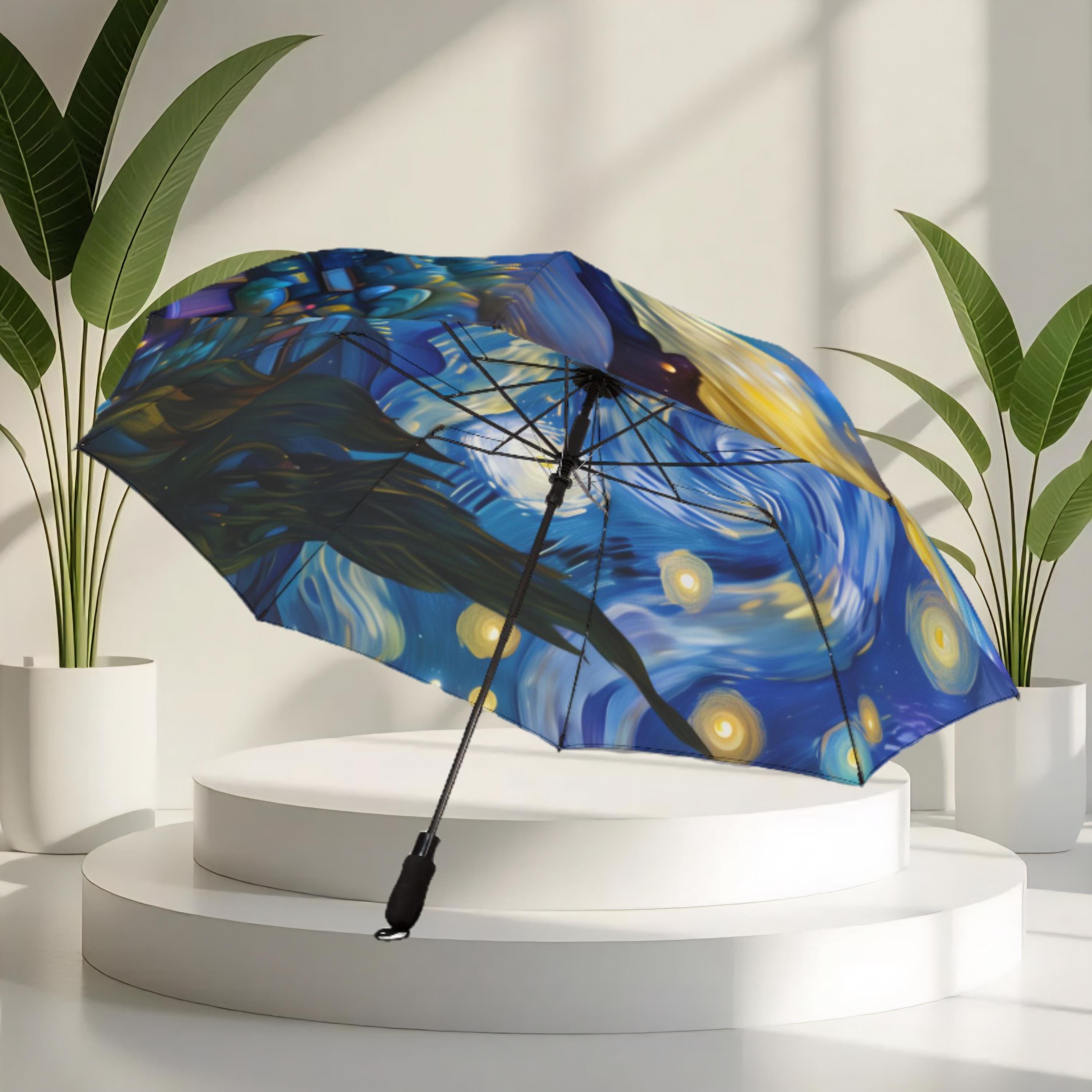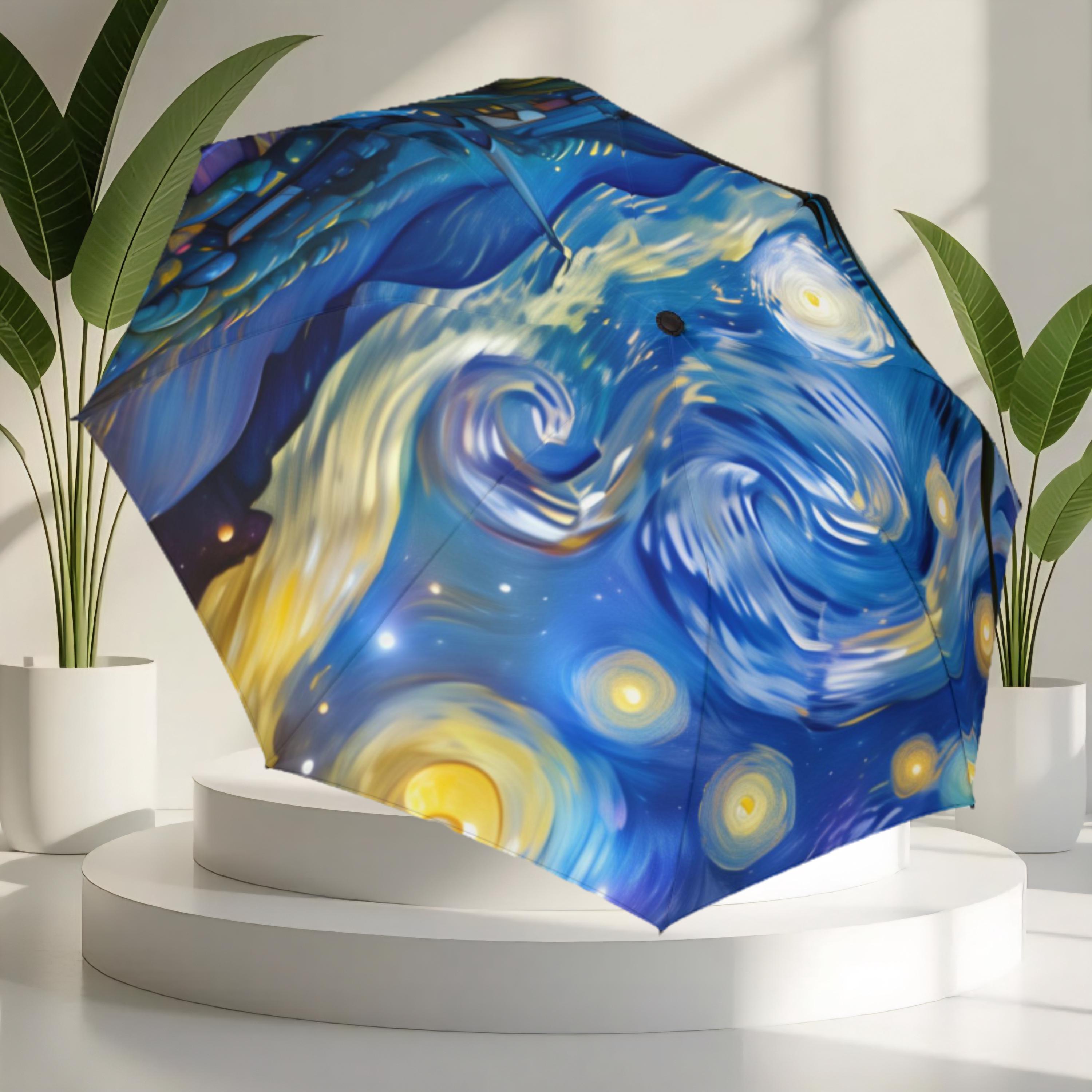 Stay dry in style with this starry night style umbrella. Made from 100% polyester pongee waterproof fabric, this umbrella features a comfortable and sturdy rubber handle for easy grip. The semi-automatic operation allows for quick and easy opening, making it perfect for on-the-go use. This umbrella comes with a sleeve, wrist strap, and velcro closure for convenient storage.