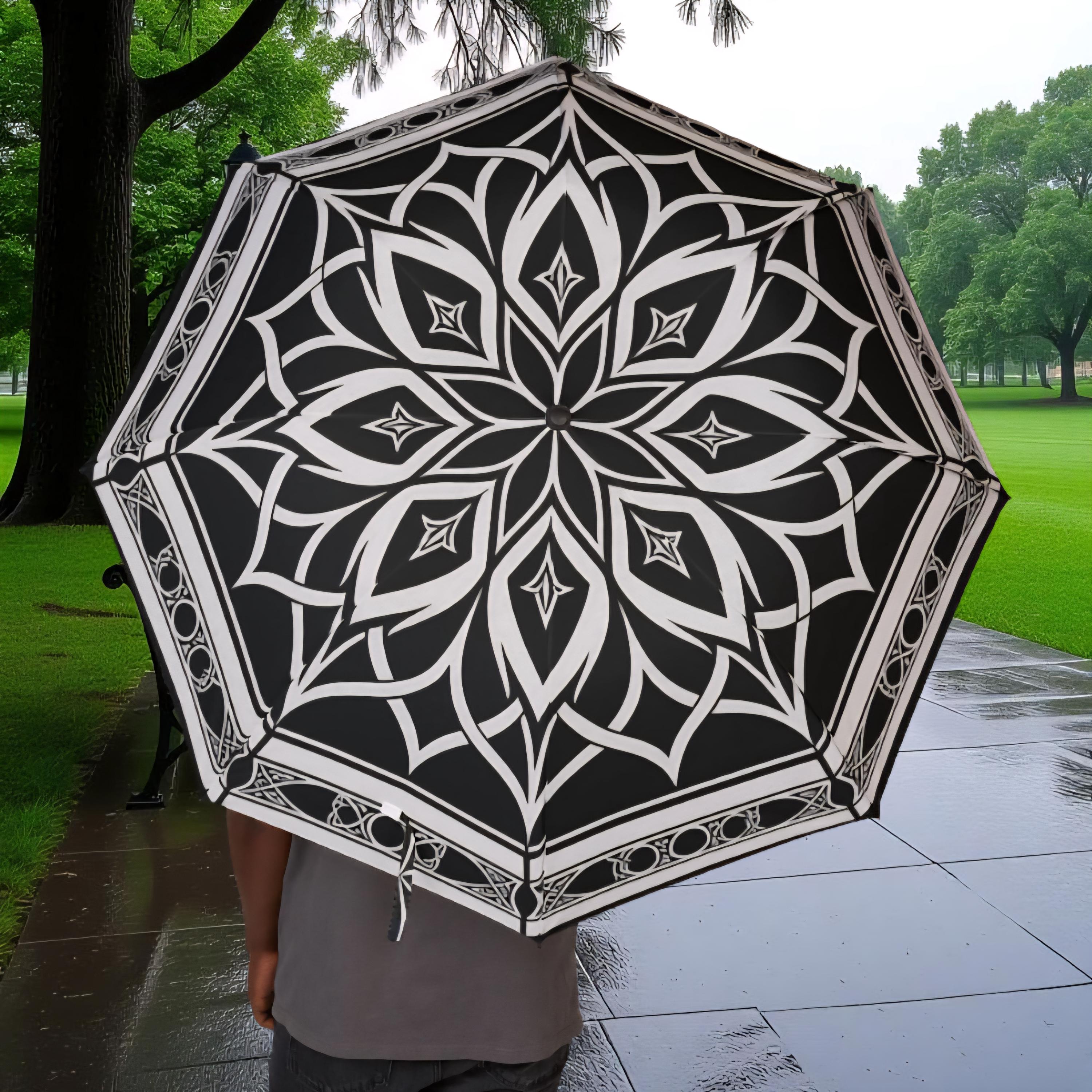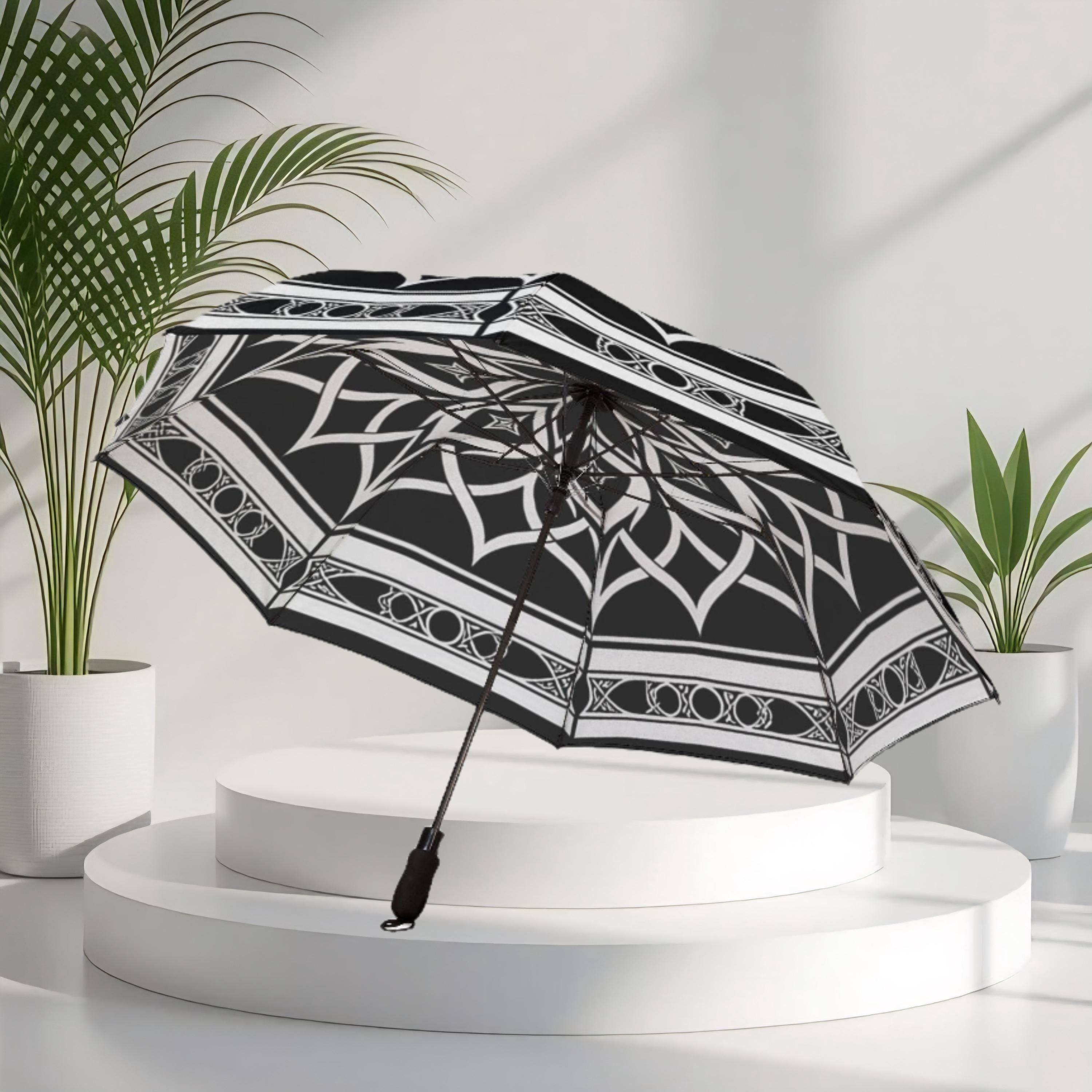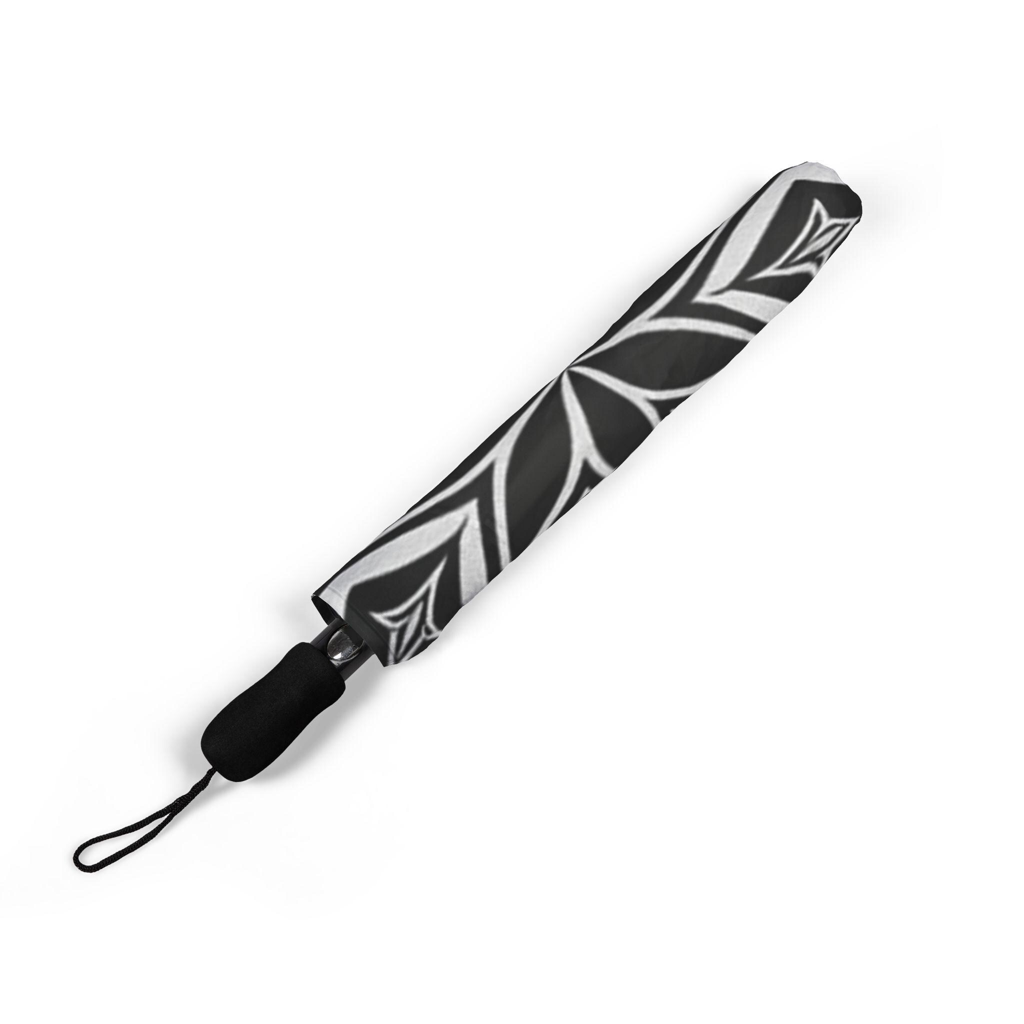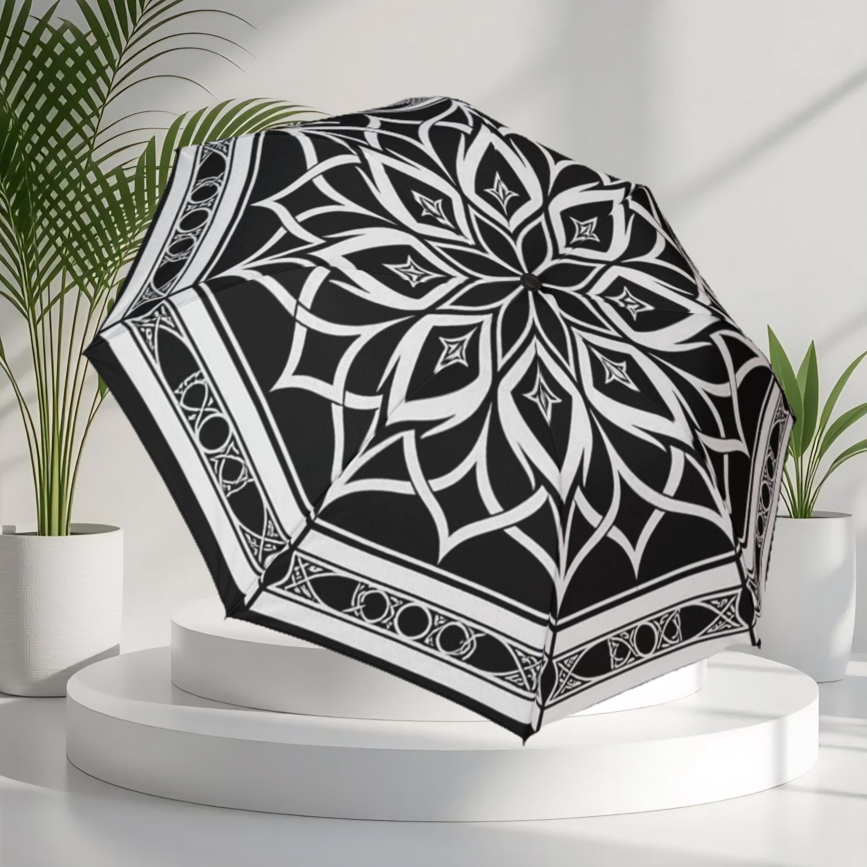 A stylish umbrella featuring a geometric black lotus on a white background. This umbrella exudes sophistication and elegance, perfect for those who appreciate unique designs. Ideal for rainy days or sunny walks, this umbrella is a practical accessory that adds a touch of flair to any outfit. Perfect for individuals who enjoy standing out from the crowd and expressing their personality through their accessories. Suitable for gifting on birthdays, holidays, or any special occasion.