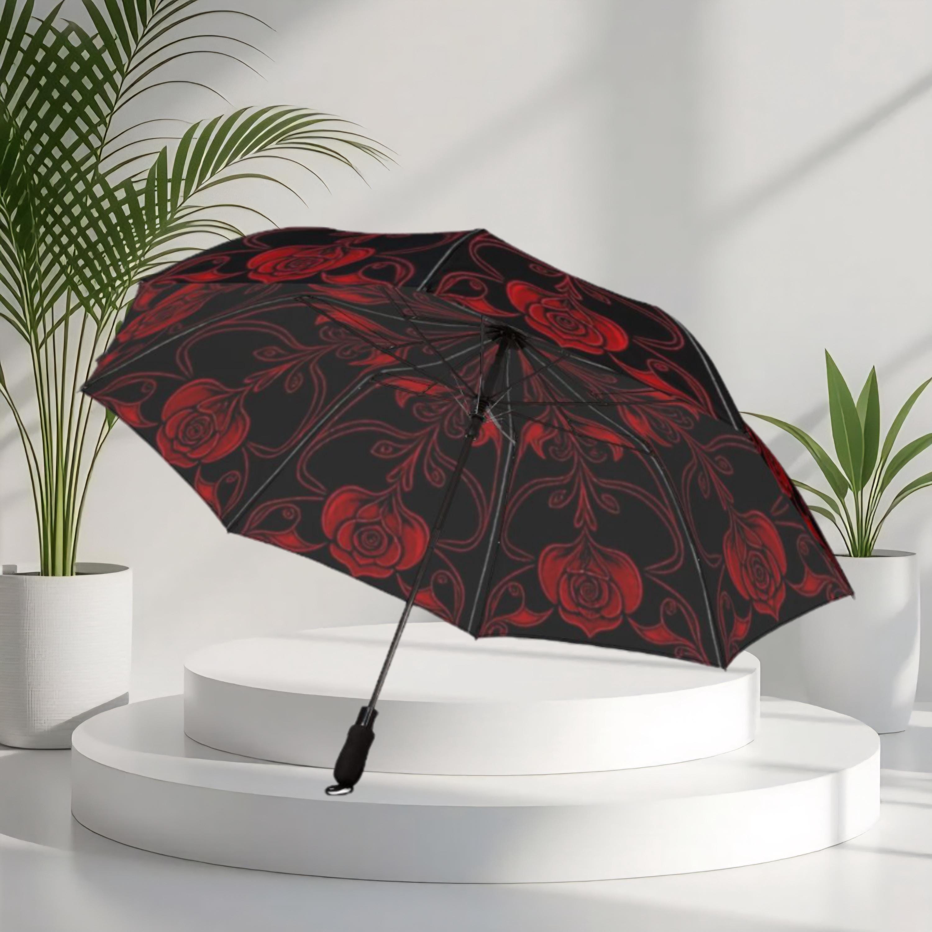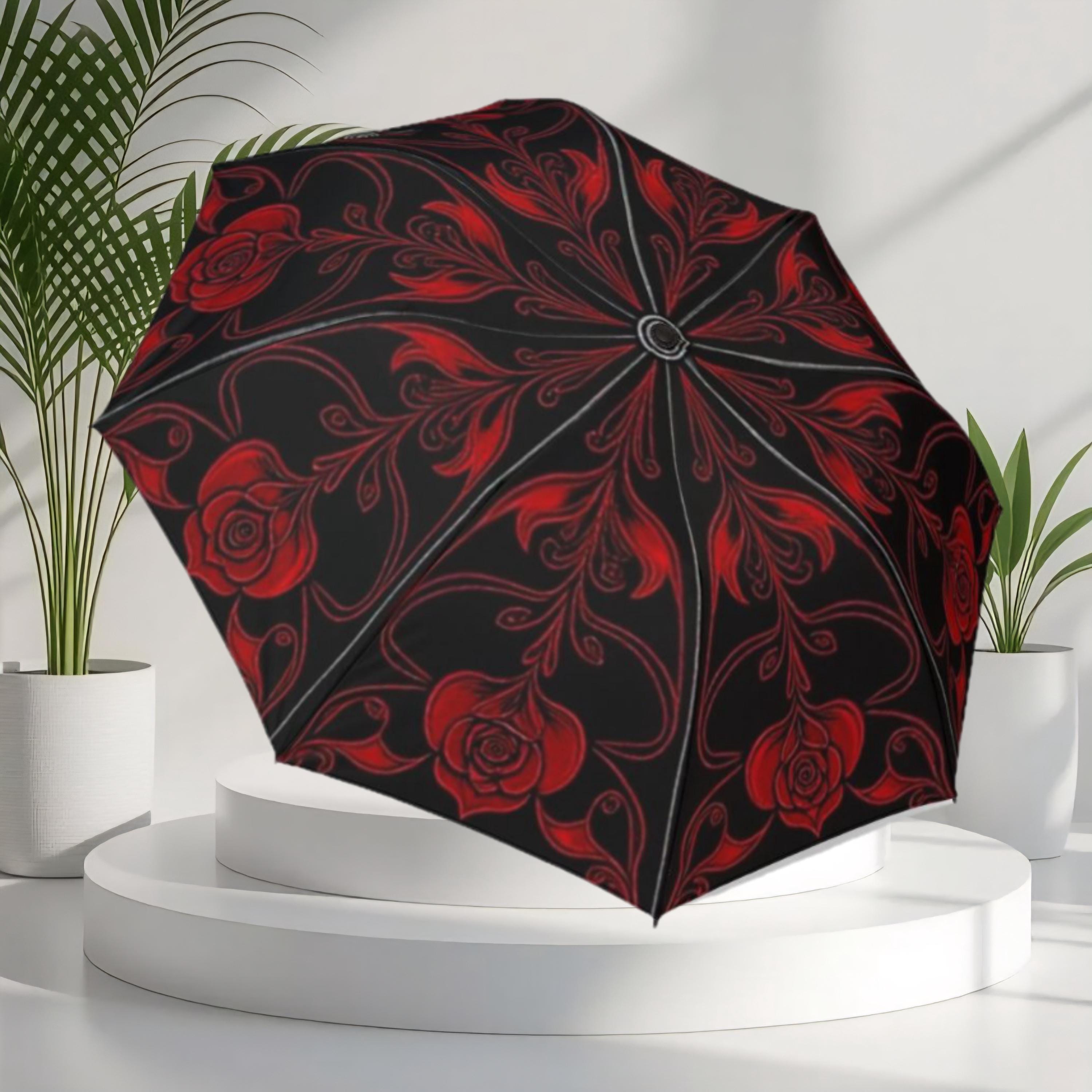Step out in style with the Crimson Thorns Umbrella, where dark elegance meets bold design. Featuring a dramatic pattern of deep red roses and flowing thorn-like swirls against a jet-black backdrop, this umbrella is perfect for anyone who loves their accessories with a touch of gothic romance. Both striking and functional, it keeps you dry while turning rainy days into runway moments.