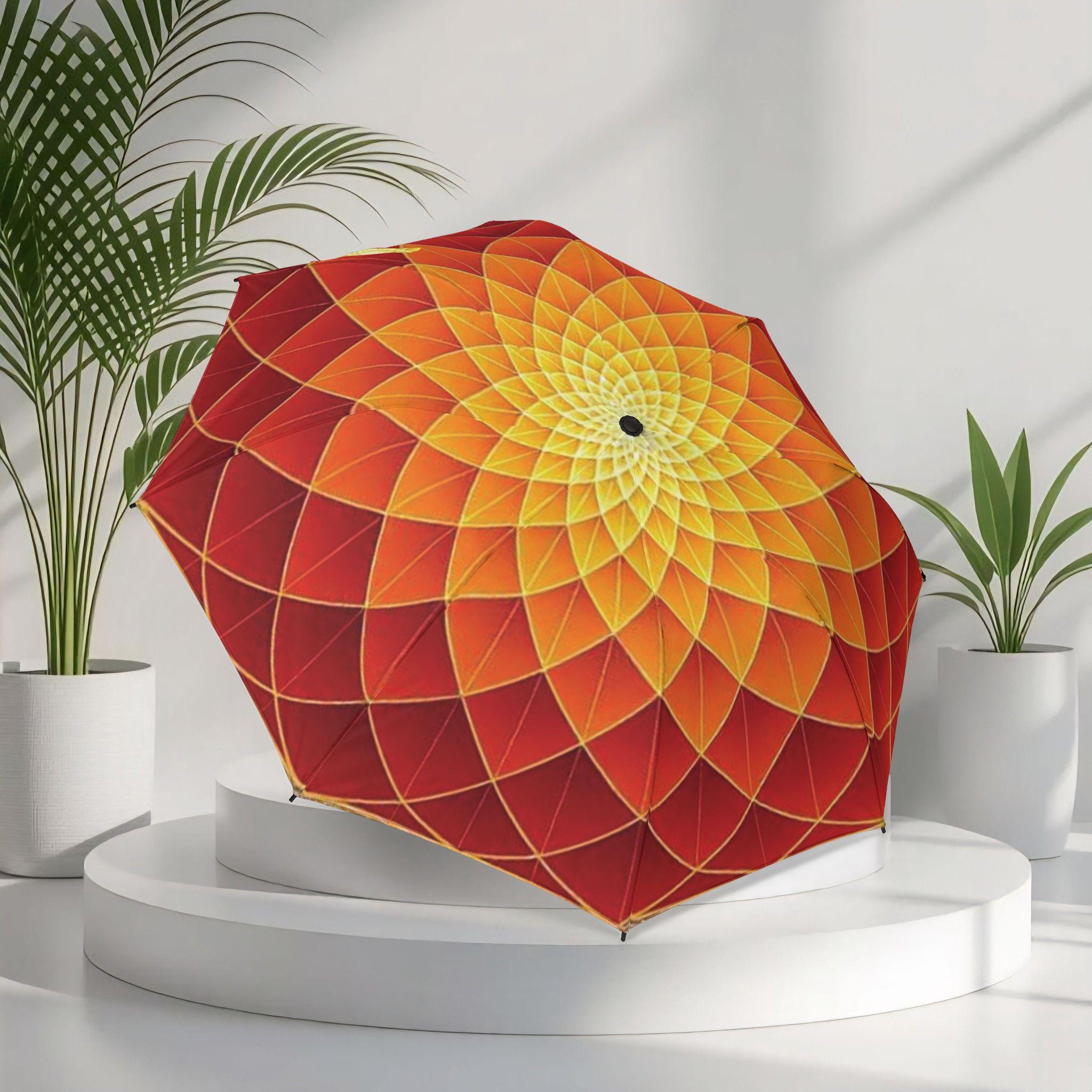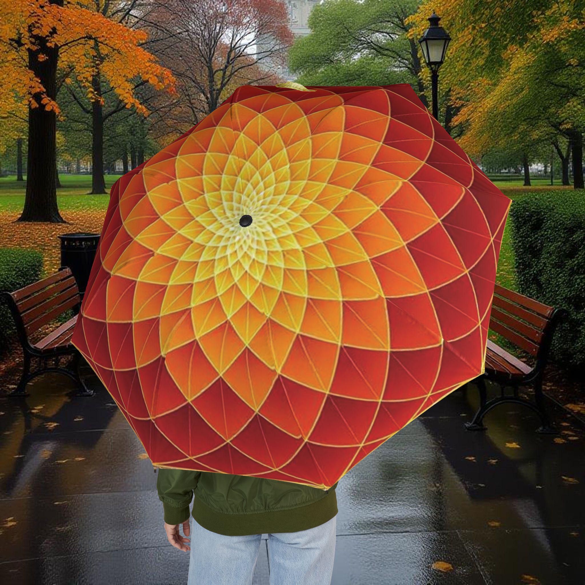 Brighten even the rainiest of days with the Sunburst Mandala Umbrella, a bold and uplifting design that radiates warmth and beauty. Its intricate, symmetrical pattern resembles a blooming flower or a radiant sun, glowing from golden yellow at the center to fiery orange and deep red at the edges. Both vibrant and elegant, this umbrella is perfect for those who love standing out in style.