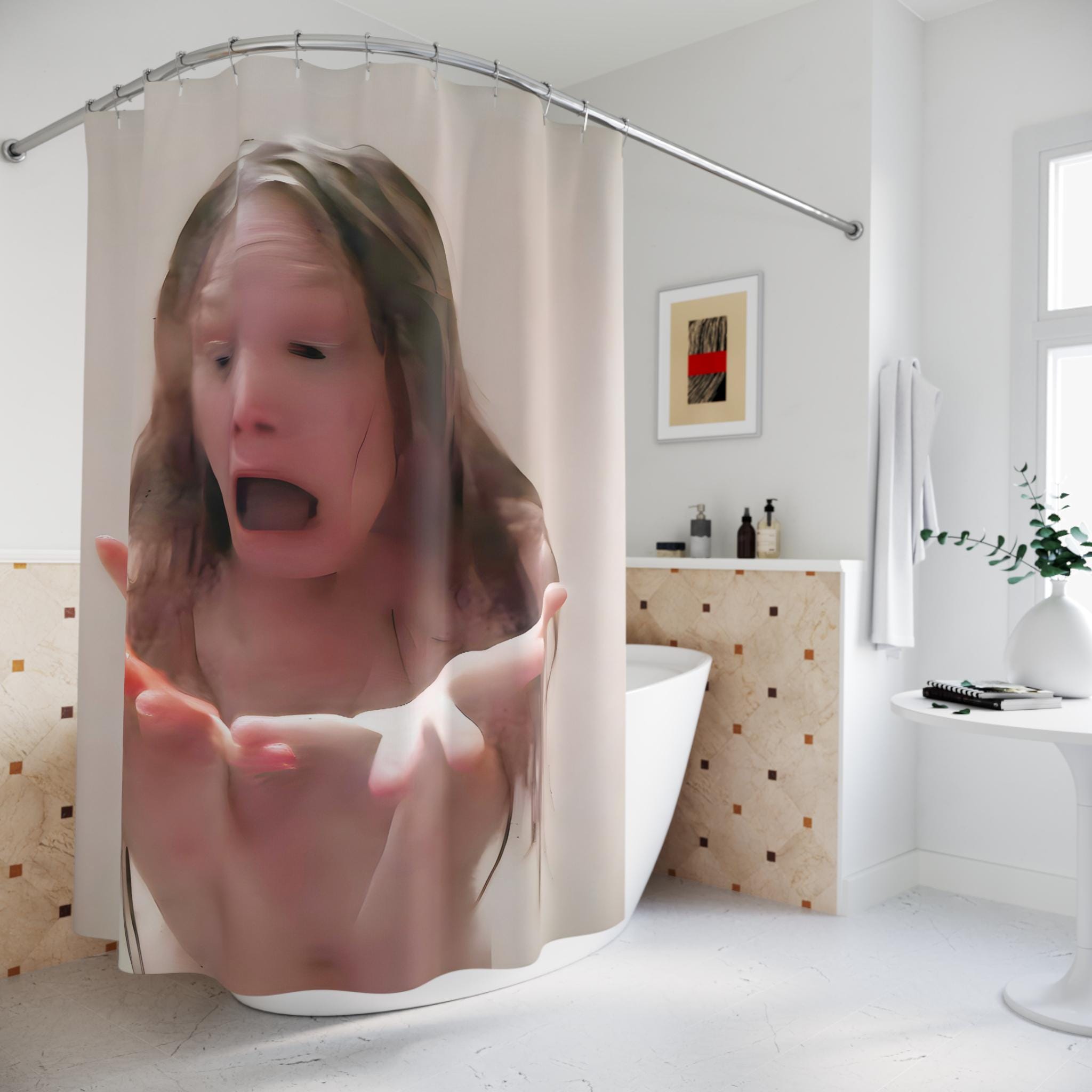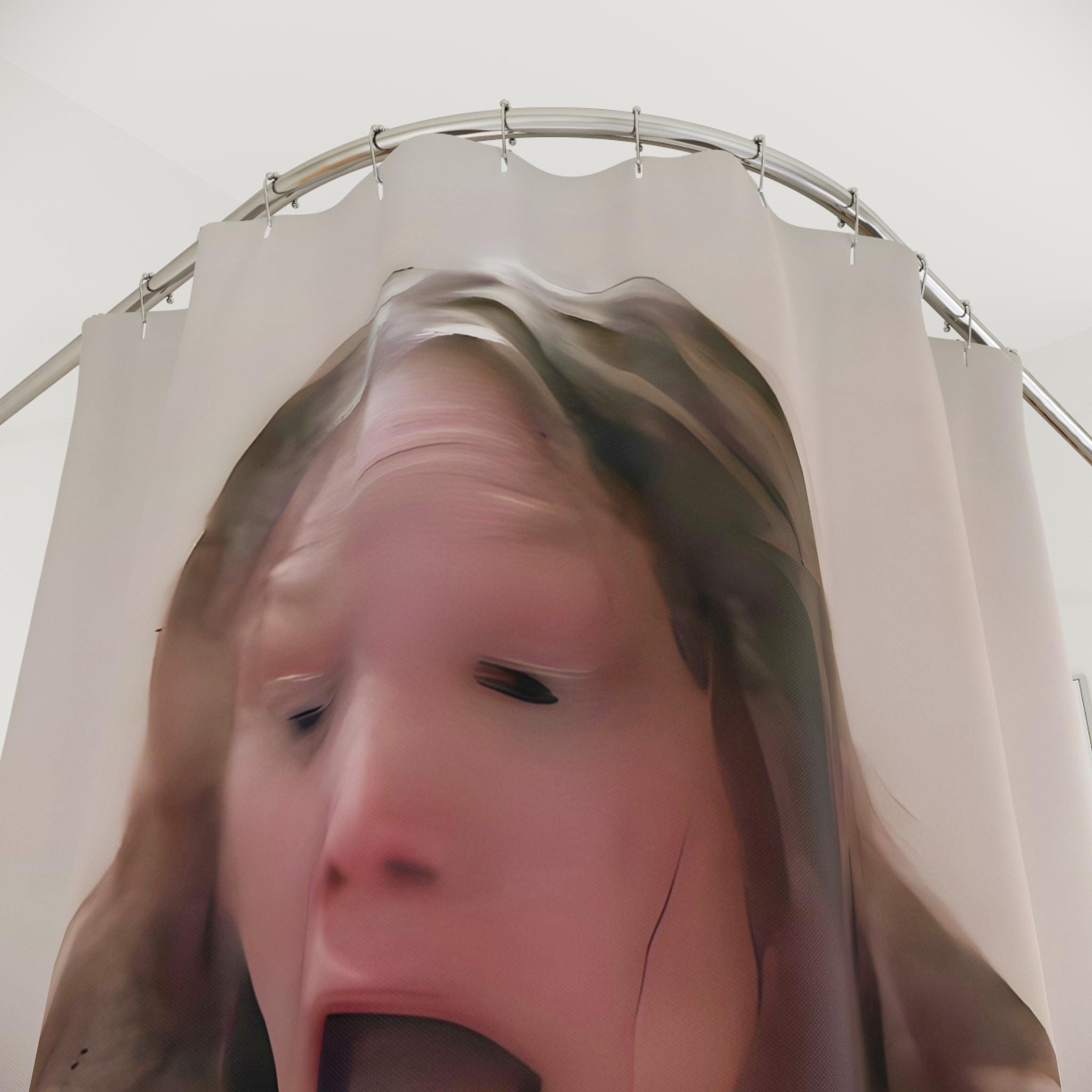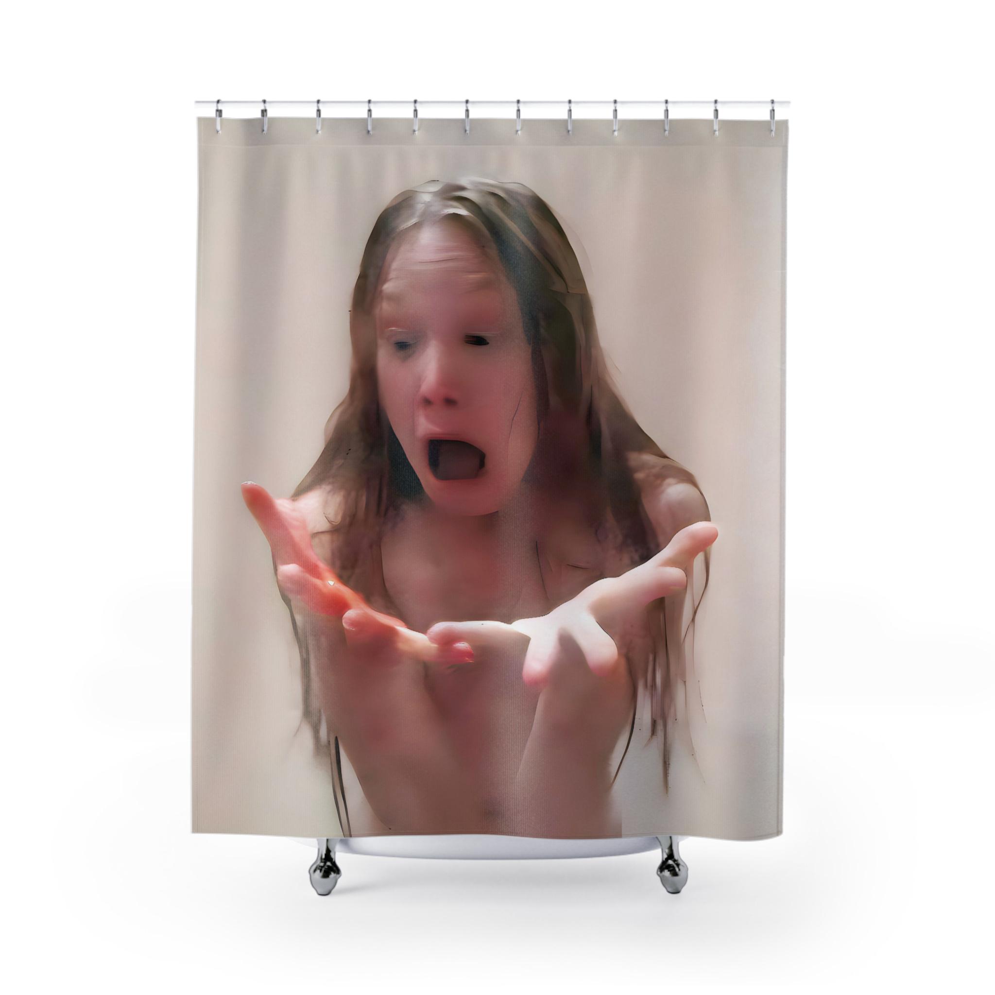 Add a touch of horror to your bathroom decor with this shower curtain featuring Sissy Spacek in a shower scene from the movie Carrie. Perfect for horror movie fans and Halloween enthusiasts, this one-sided print curtain is made of 100% Polyester for durability and quick drying. Suitable for adults only, with 12 buttonholes for easy hook placement.