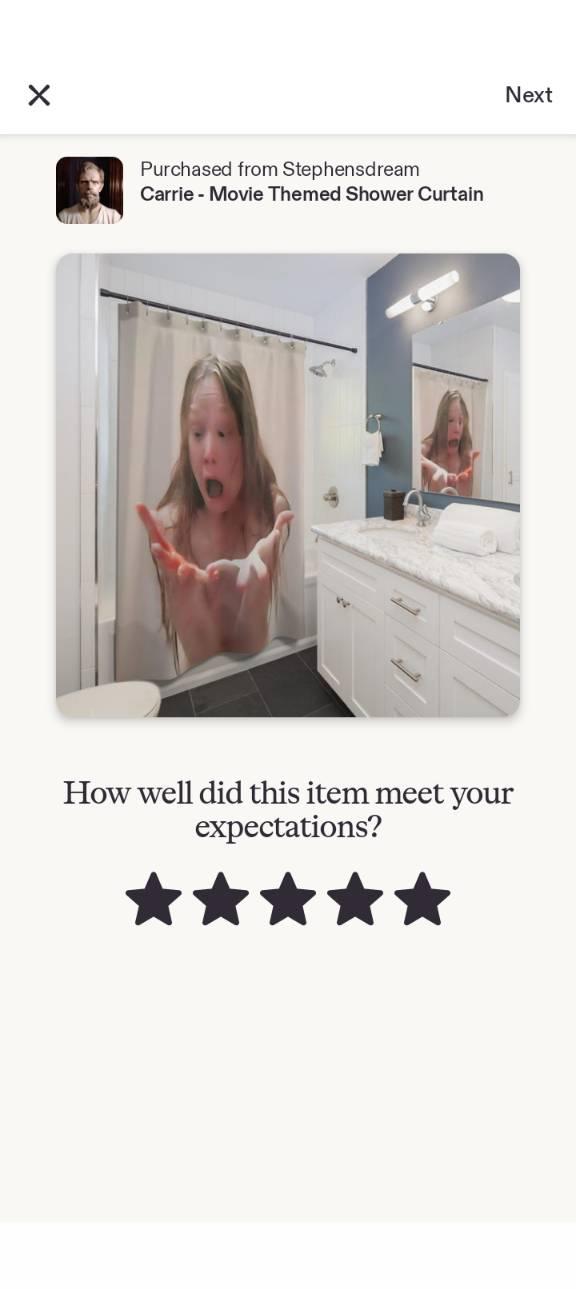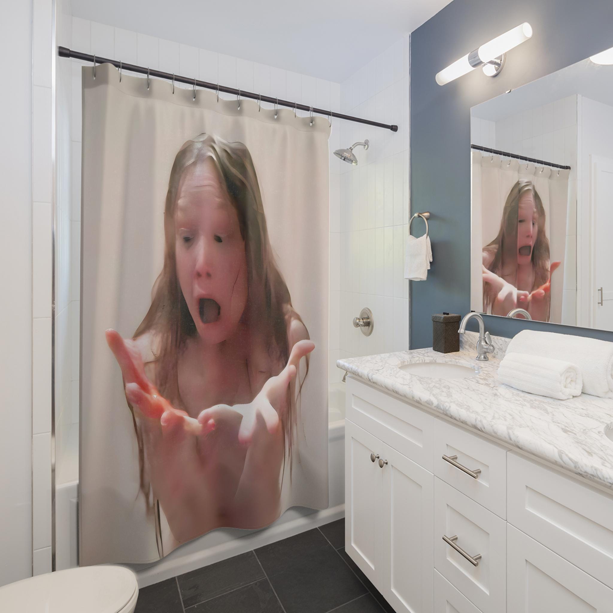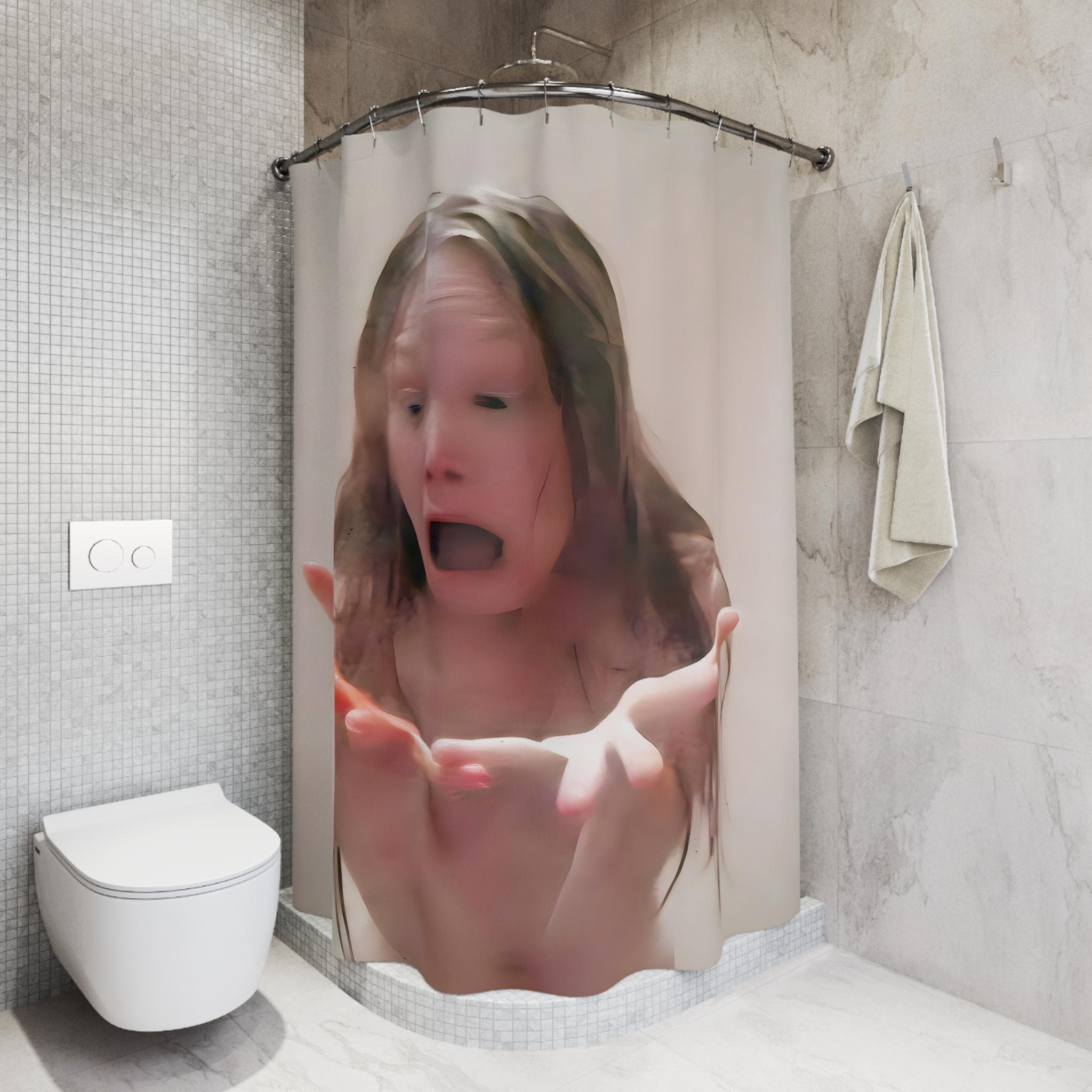 Add a touch of horror to your bathroom decor with this shower curtain featuring Sissy Spacek in a shower scene from the movie Carrie. Perfect for horror movie fans and Halloween enthusiasts, this one-sided print curtain is made of 100% Polyester for durability and quick drying. Suitable for adults only, with 12 buttonholes for easy hook placement.