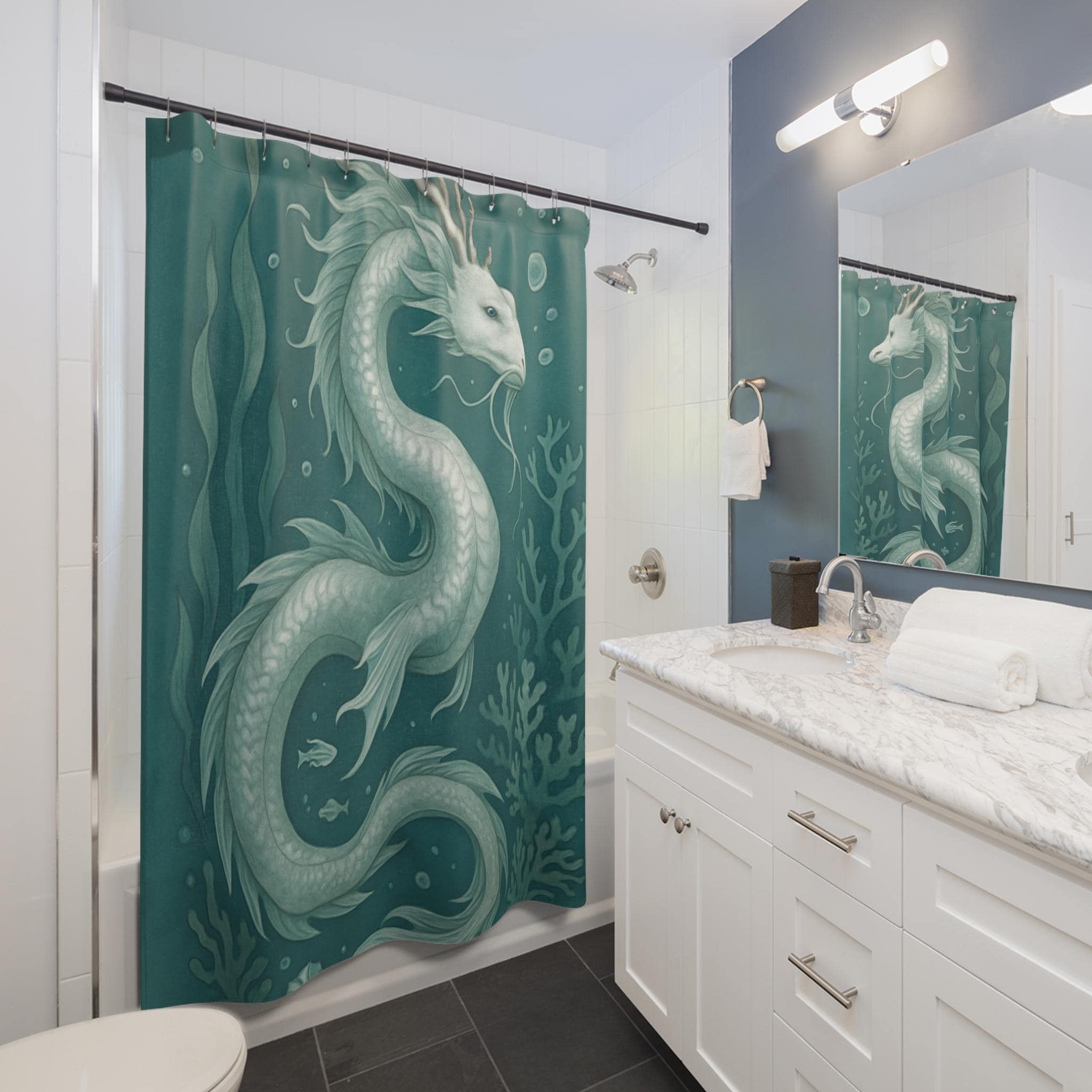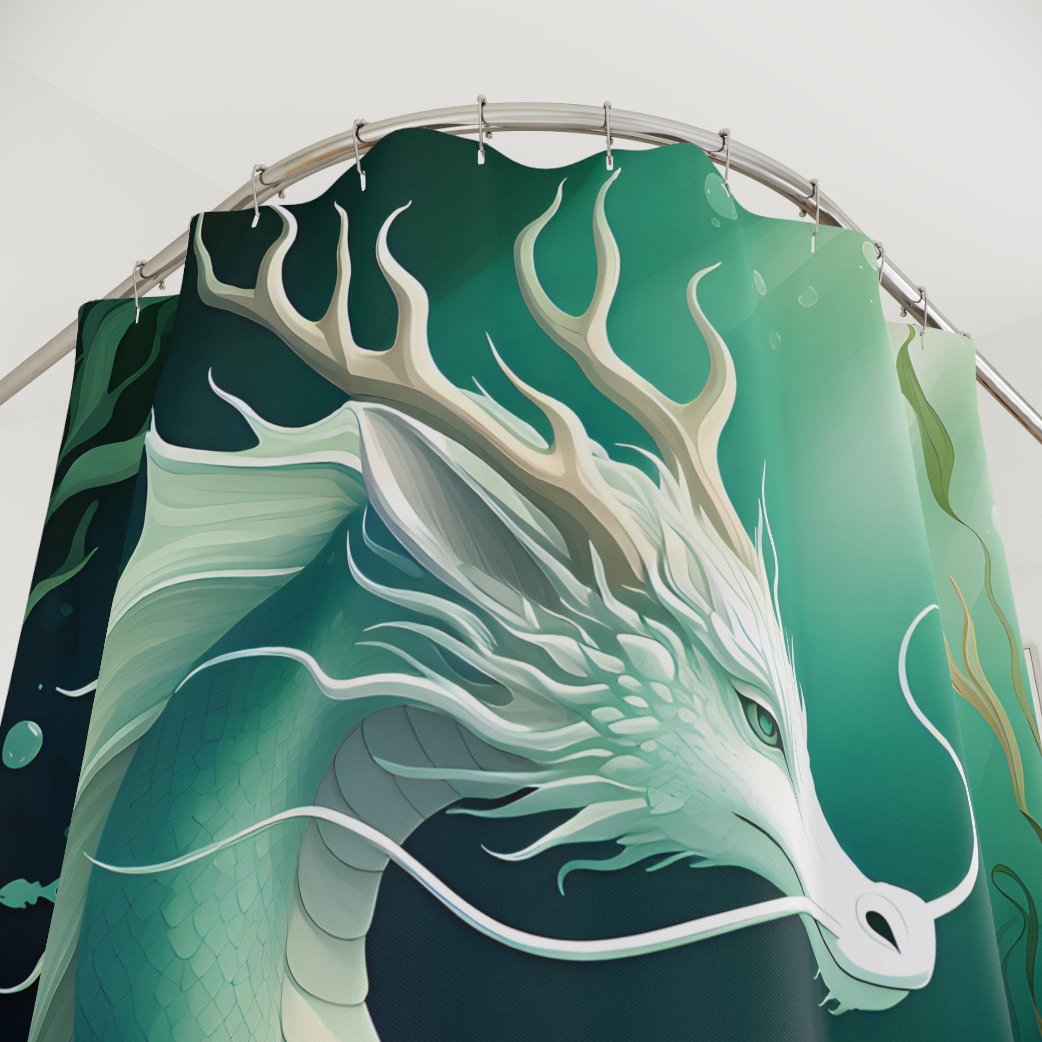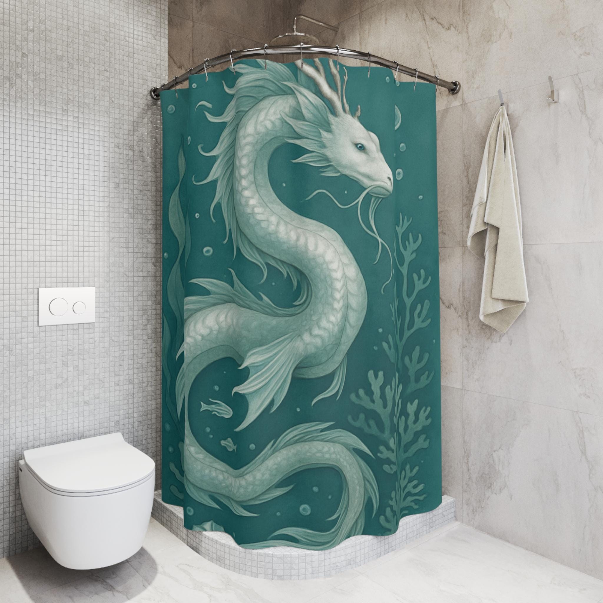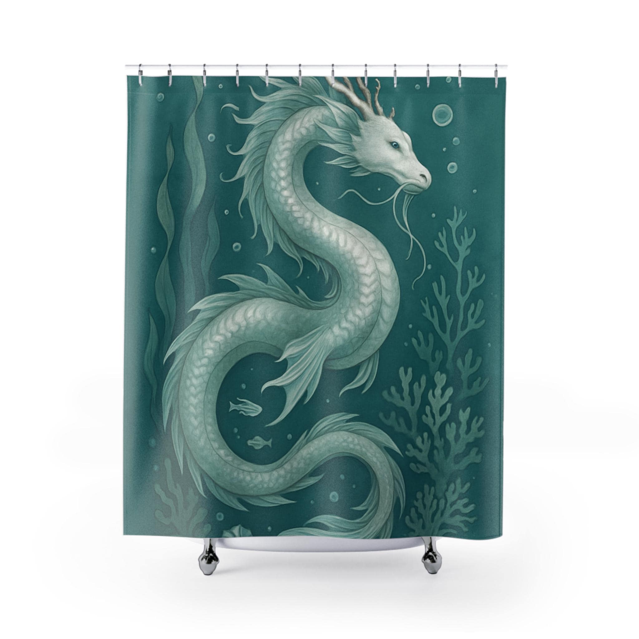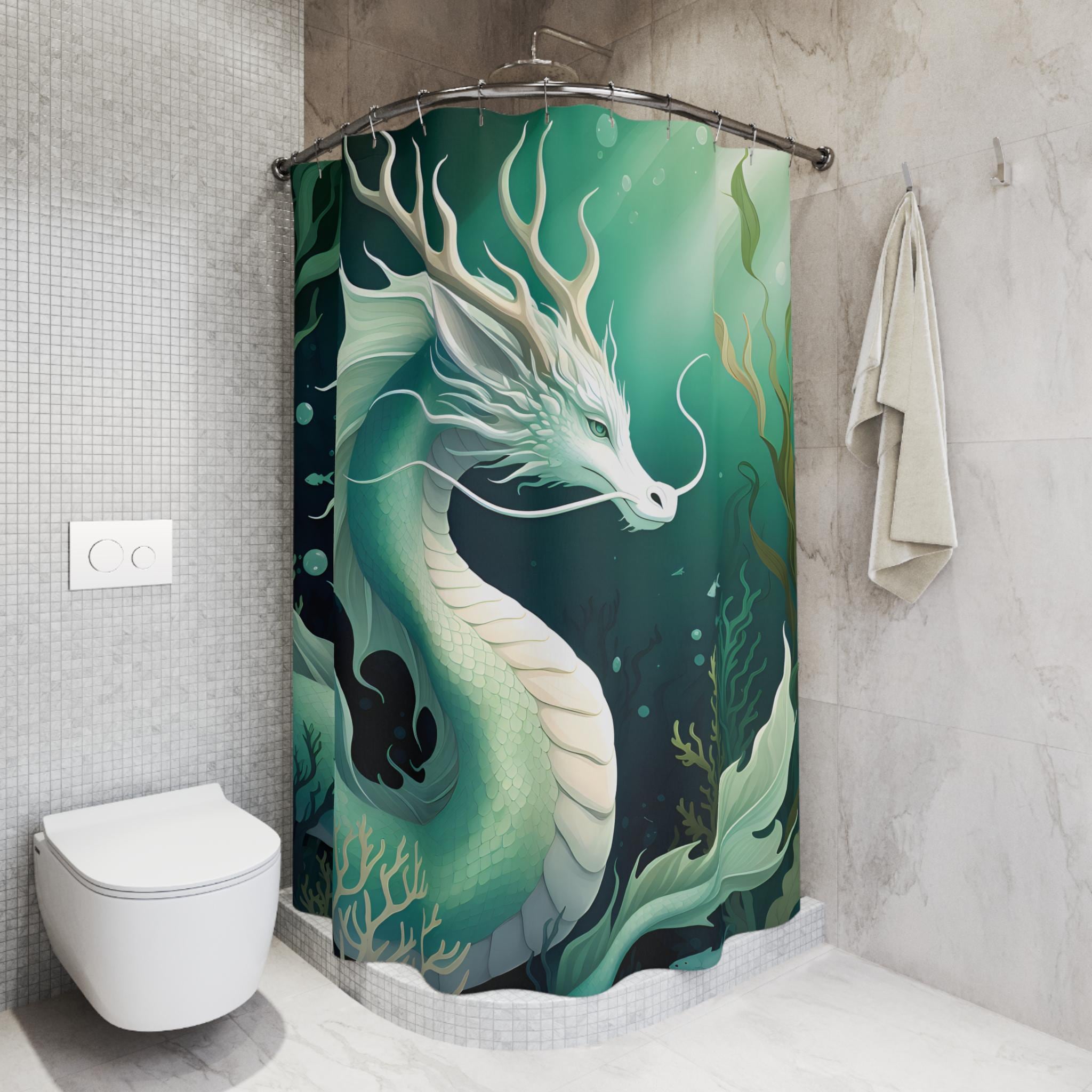 Bring a touch of aquatic magic into your bathroom with this water dragon themed shower curtain. Perfect for adults who love mystical creatures and ocean themes. Ideal for decorating your bathroom during Halloween, costume parties, or fantasy-themed events.