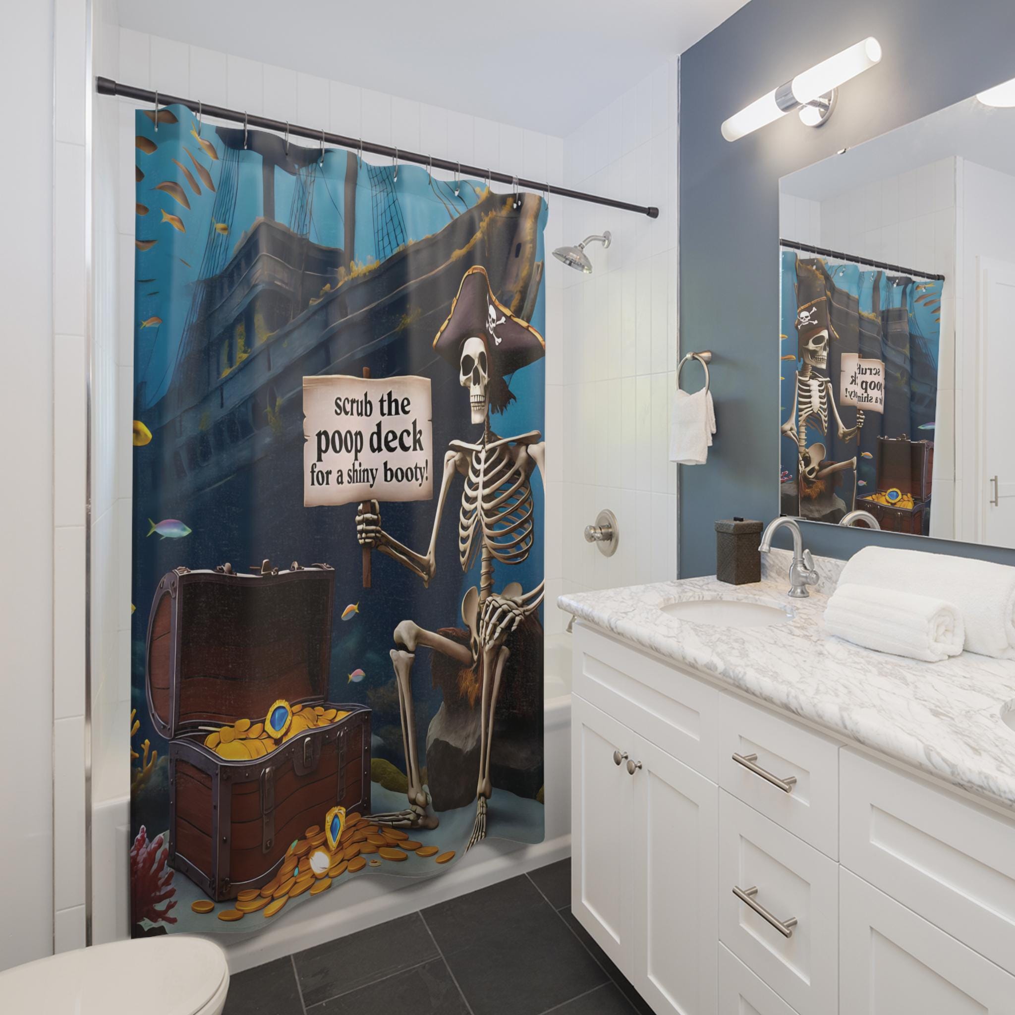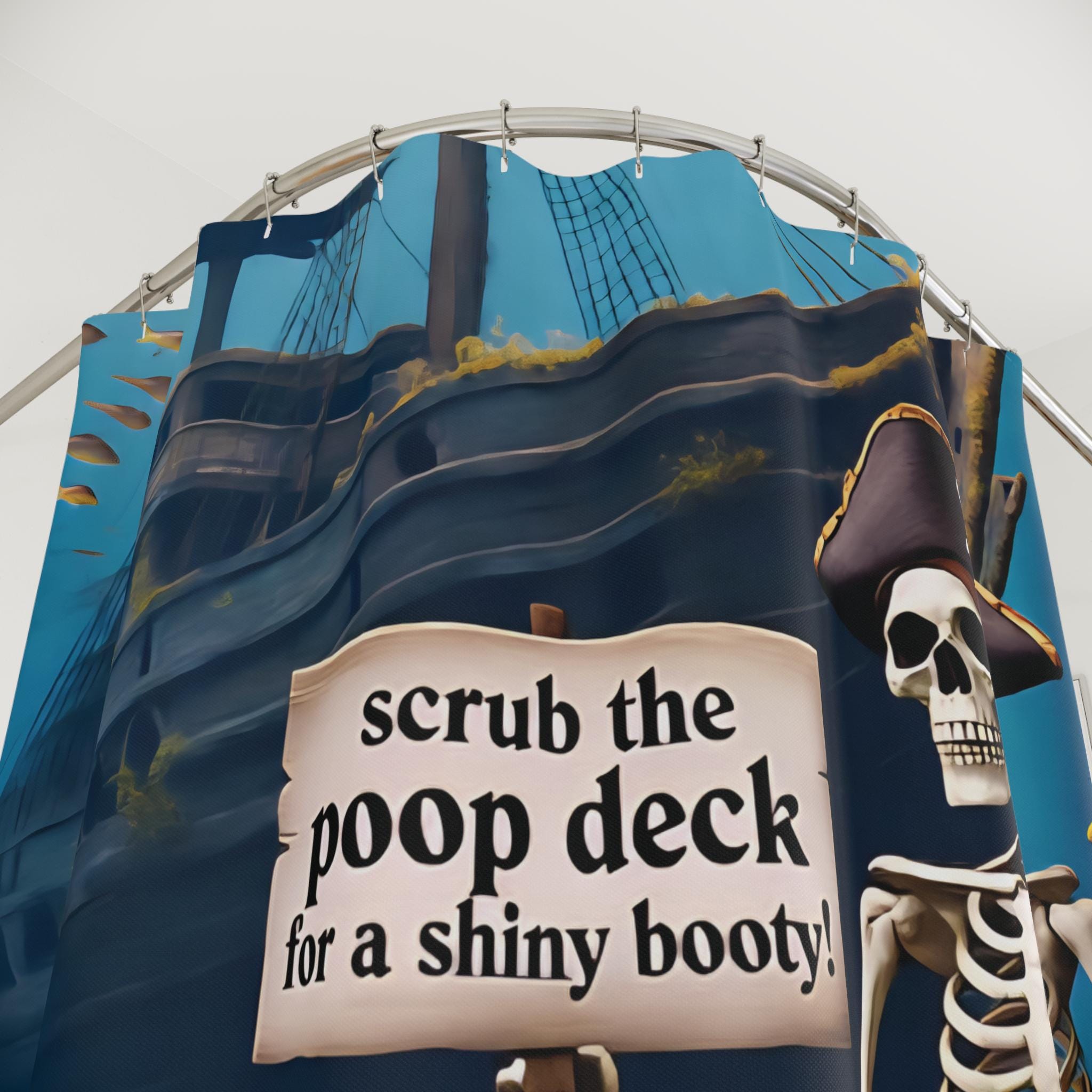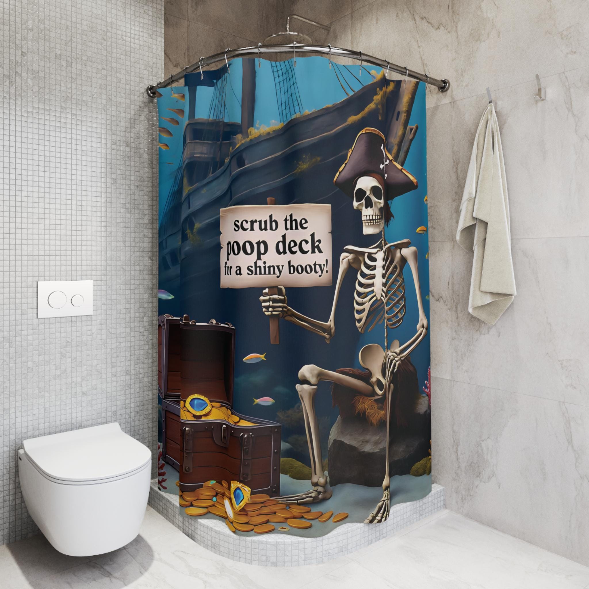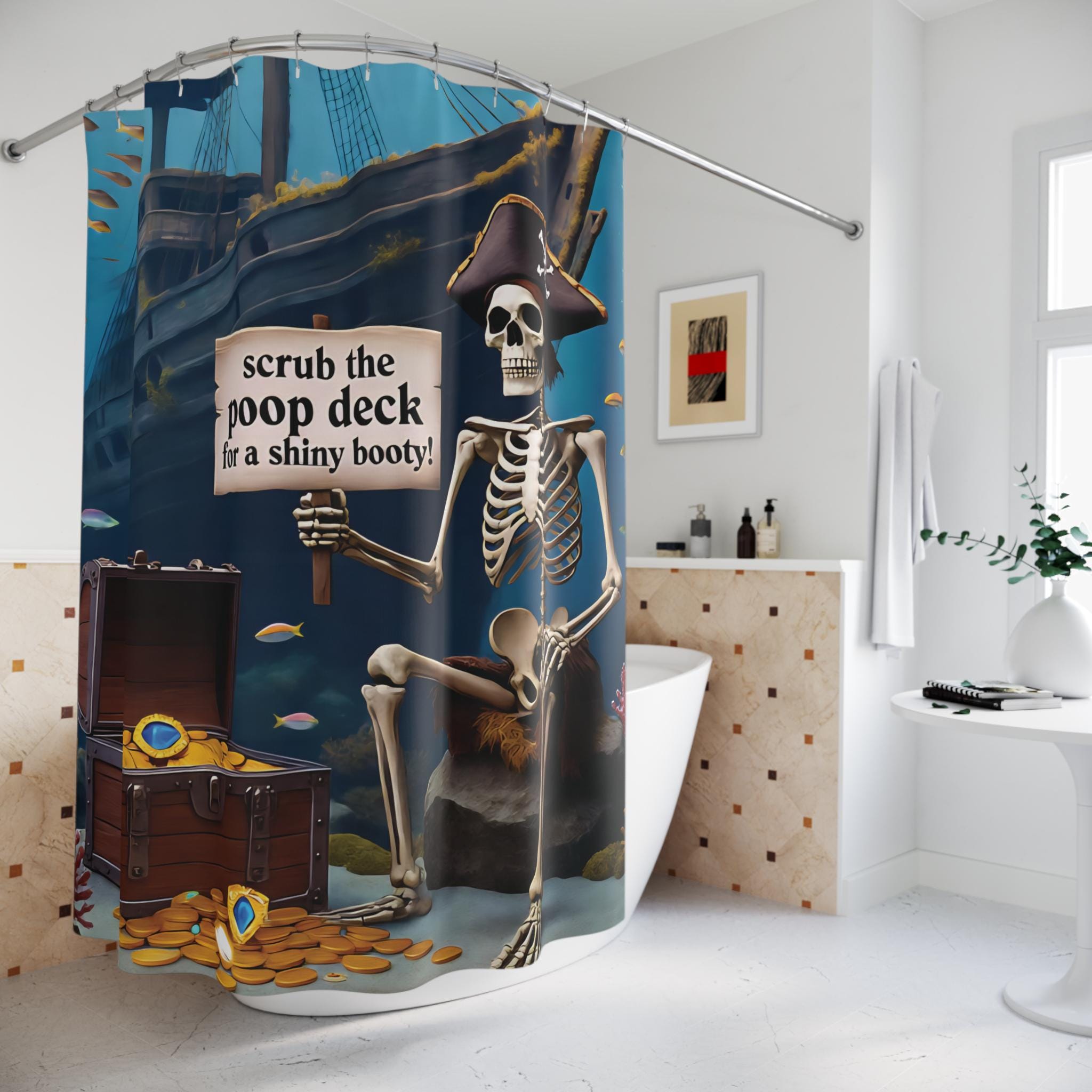 This pirate skeleton shower curtain brings a touch of adventure to your bathroom, with the playful quote 'scrub the poop deck for a shiny booty'. Perfect for adults who love quirky and unique decor. Ideal for Halloween, Talk Like a Pirate Day, or any pirate-themed event.