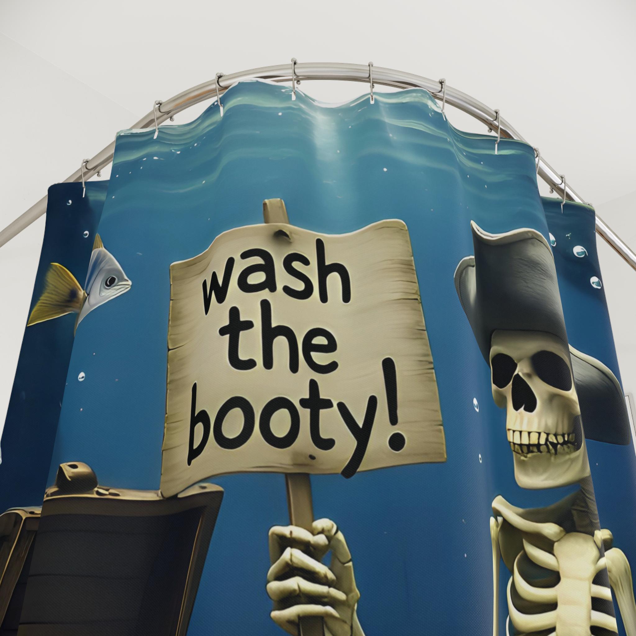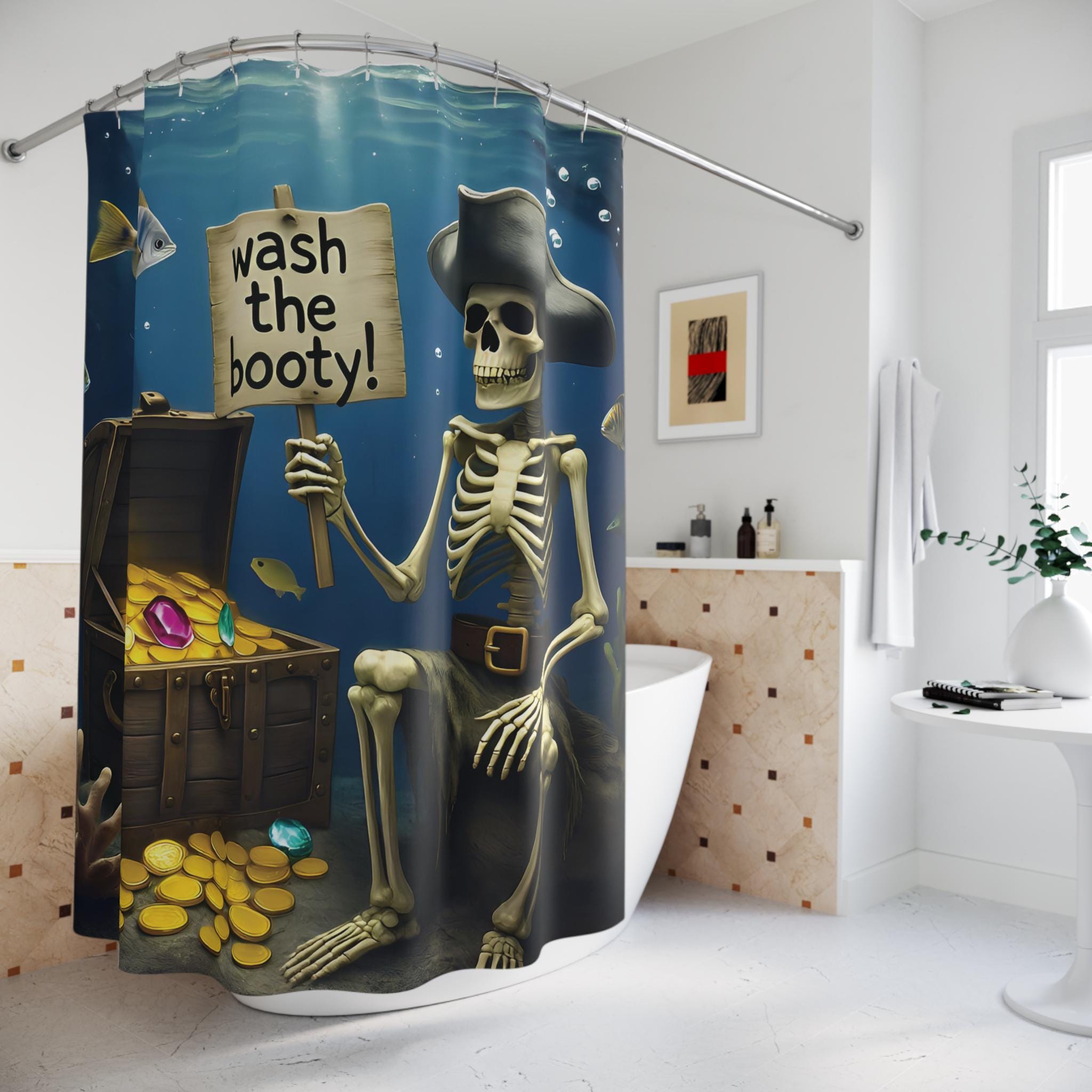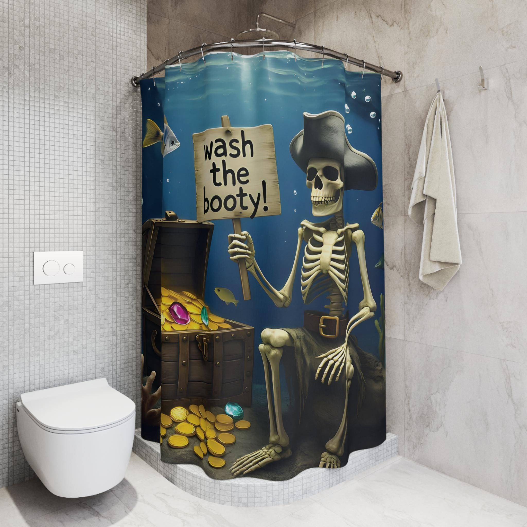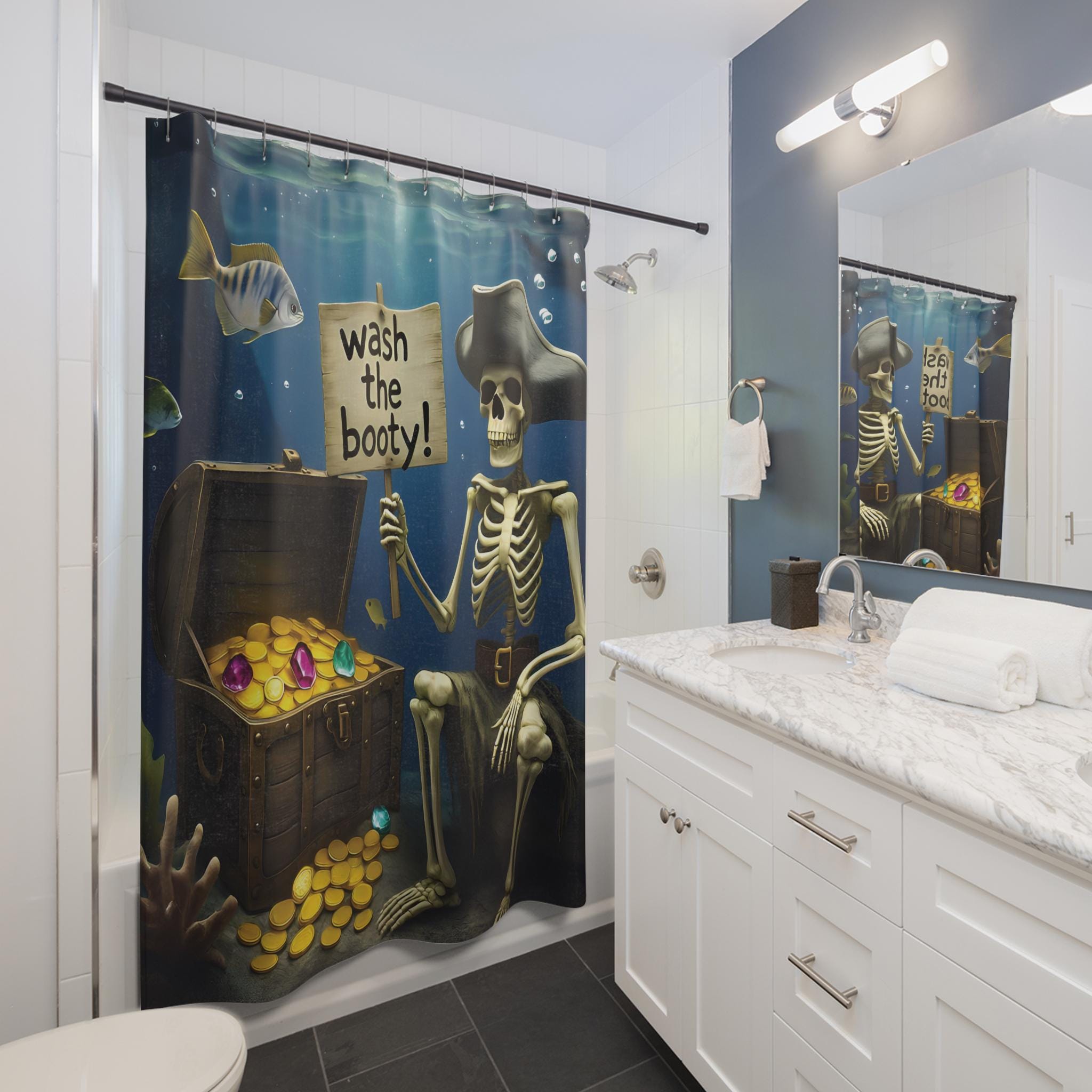 A unique Shower Curtain featuring an illustration of a skeleton pirate sitting beside sunken treasure, holding a sign that reads, 'Wash the booty'. The design adds a fun and adventurous vibe to your bathroom decor. Perfect for pirate enthusiasts or anyone looking to add a touch of whimsy to their space. Ideal for Halloween, Talk Like a Pirate Day, or nautical-themed bathrooms.