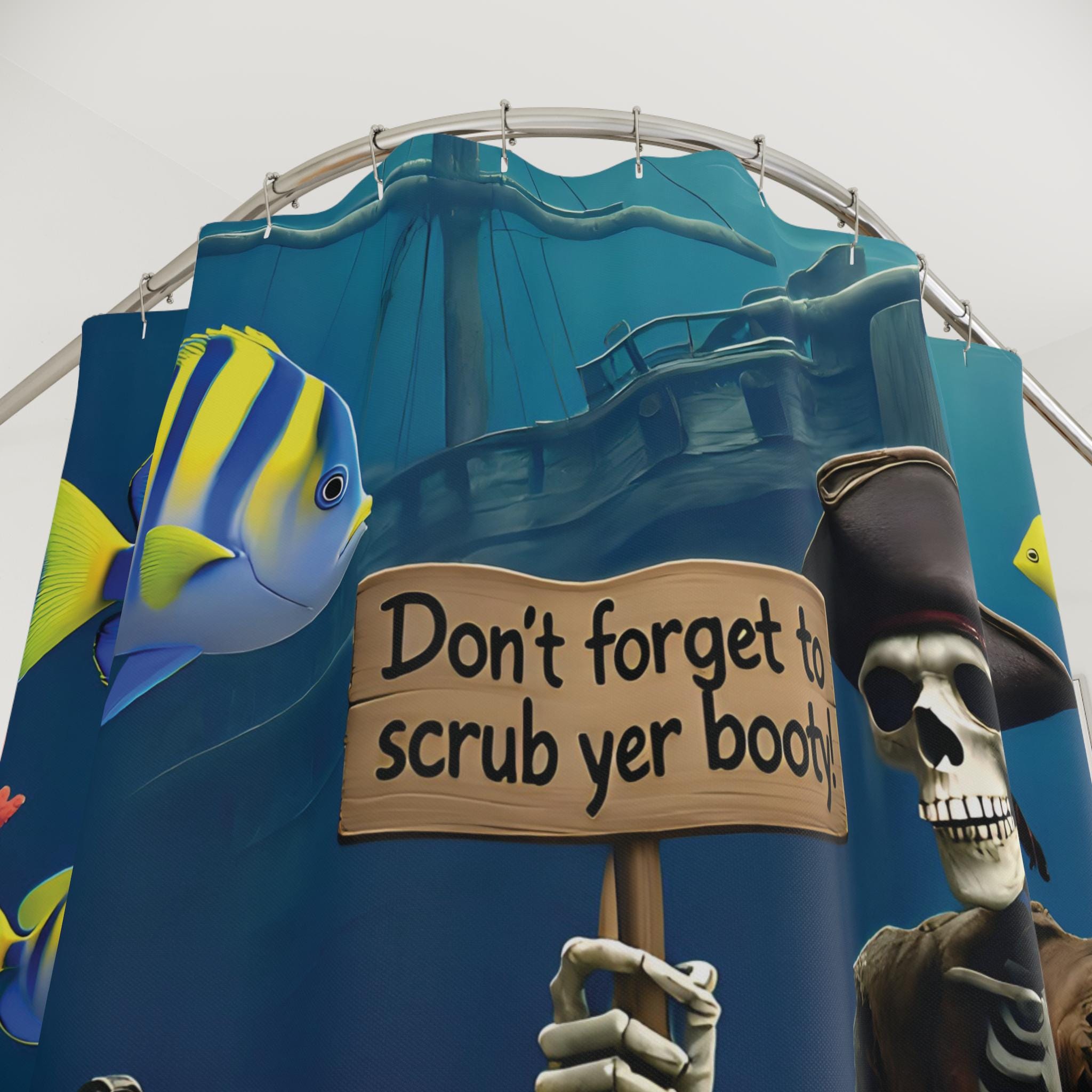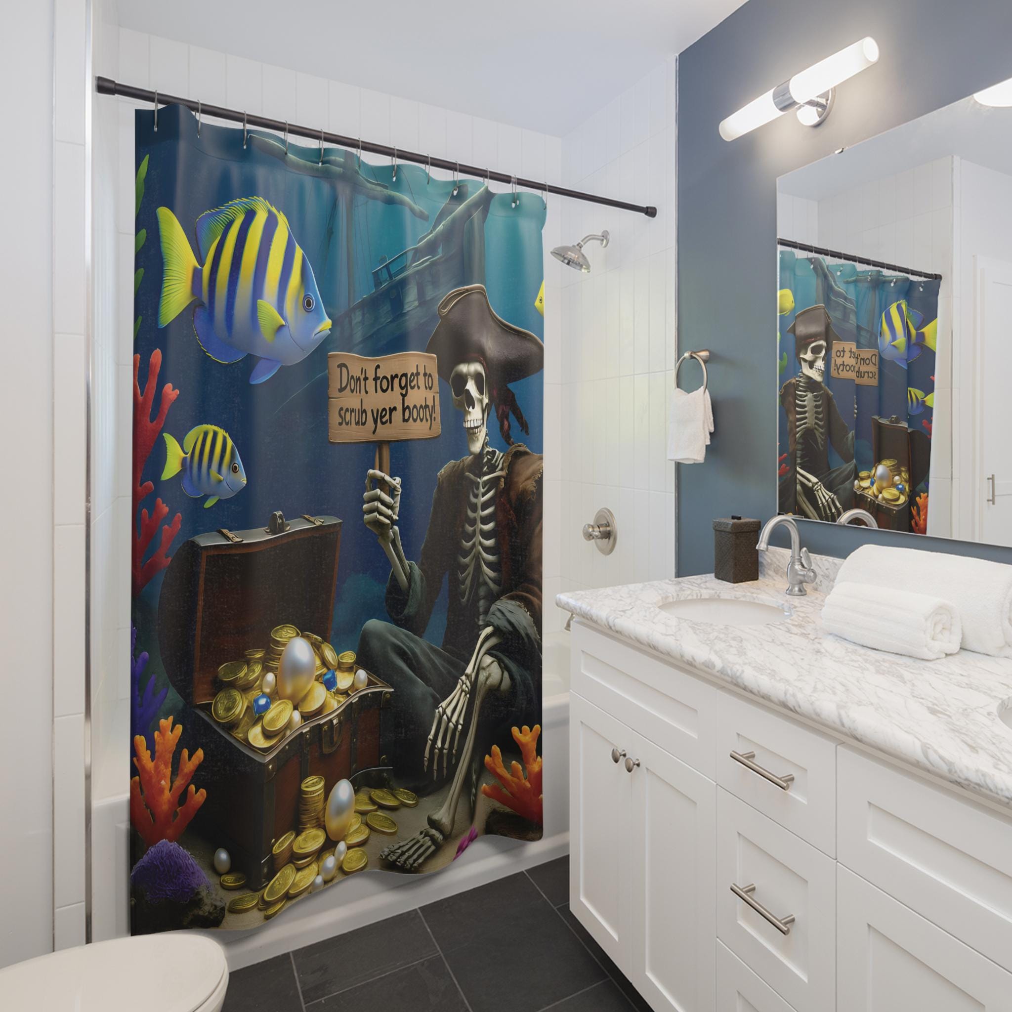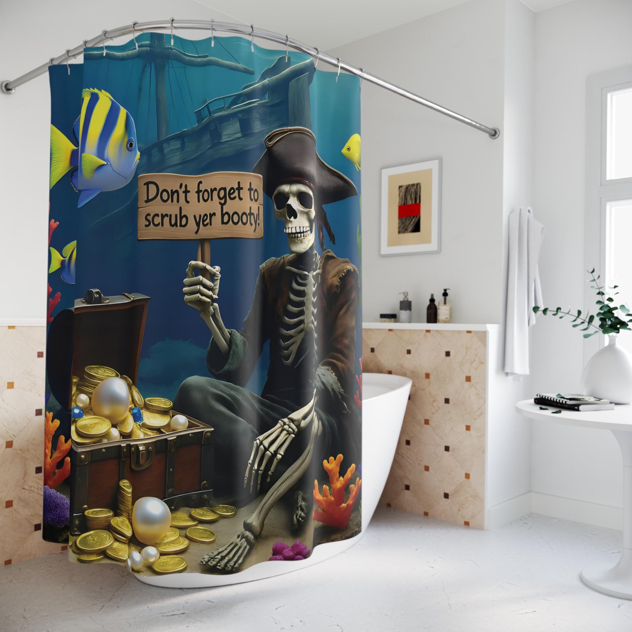 This pirate skeleton shower curtain brings a touch of adventure to your bathroom, with the playful quote 'Don't forget to scrub yer booty'. Perfect for adults who love quirky and unique decor. Ideal for Halloween, Talk Like a Pirate Day, or any pirate-themed event.