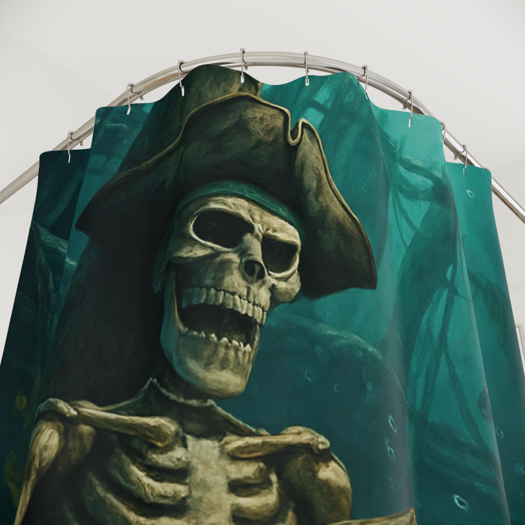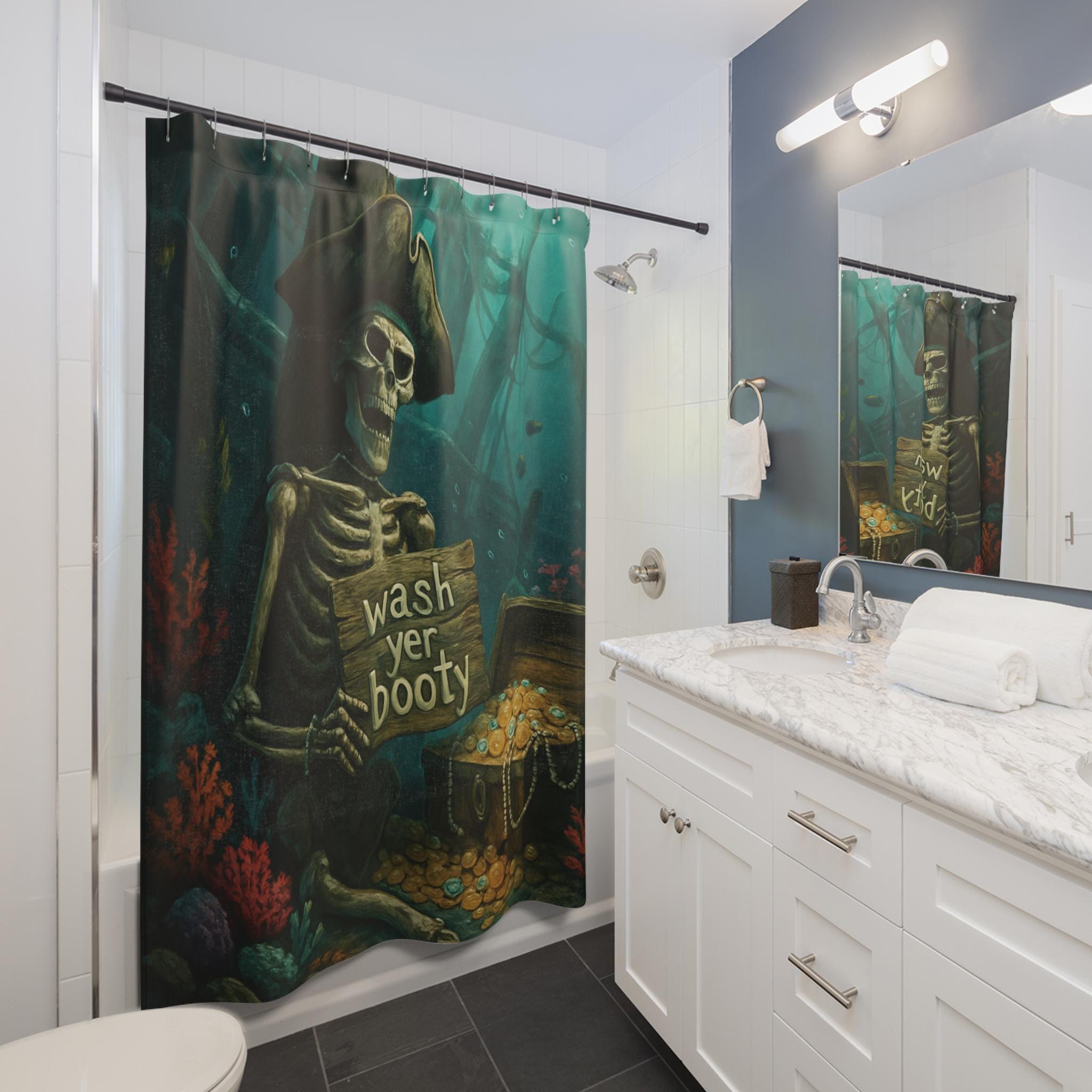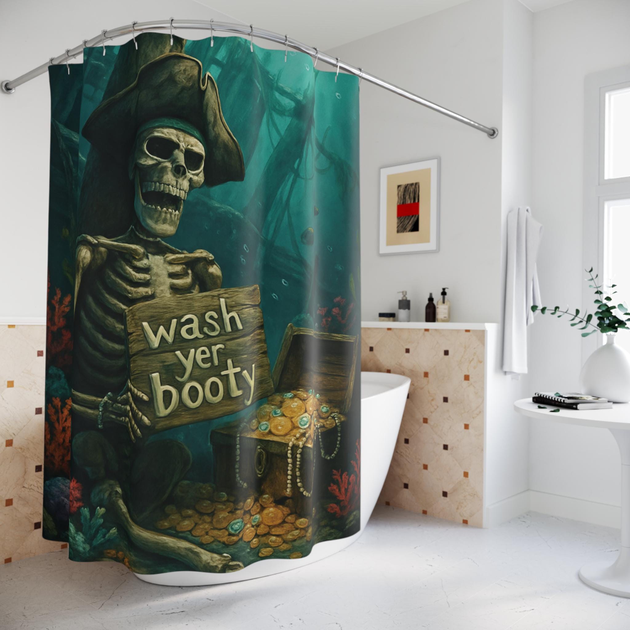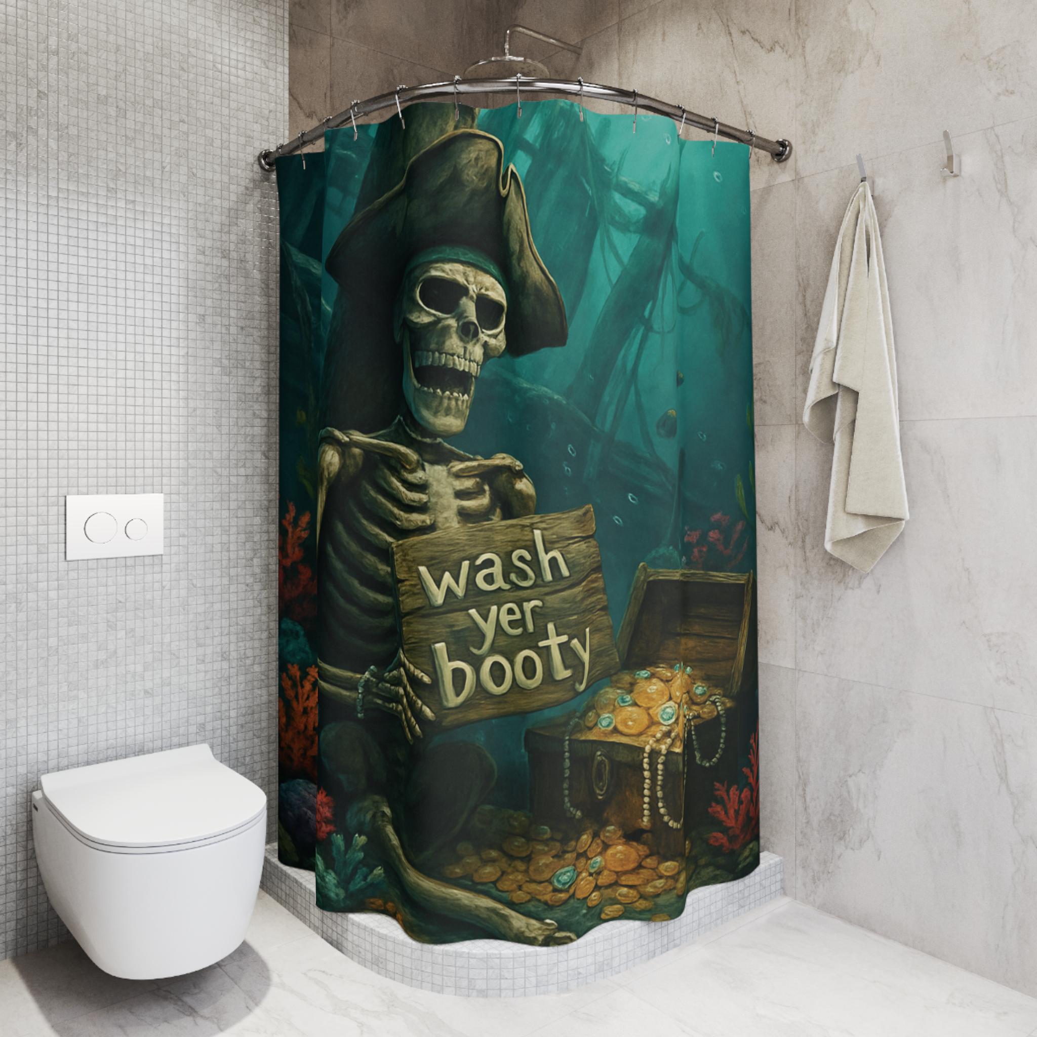 This pirate skeleton shower curtain brings a touch of adventure to your bathroom, with the playful quote 'wash yer booty'. Perfect for adults who love quirky and unique decor. Ideal for Halloween, Talk Like a Pirate Day, or any pirate-themed event.