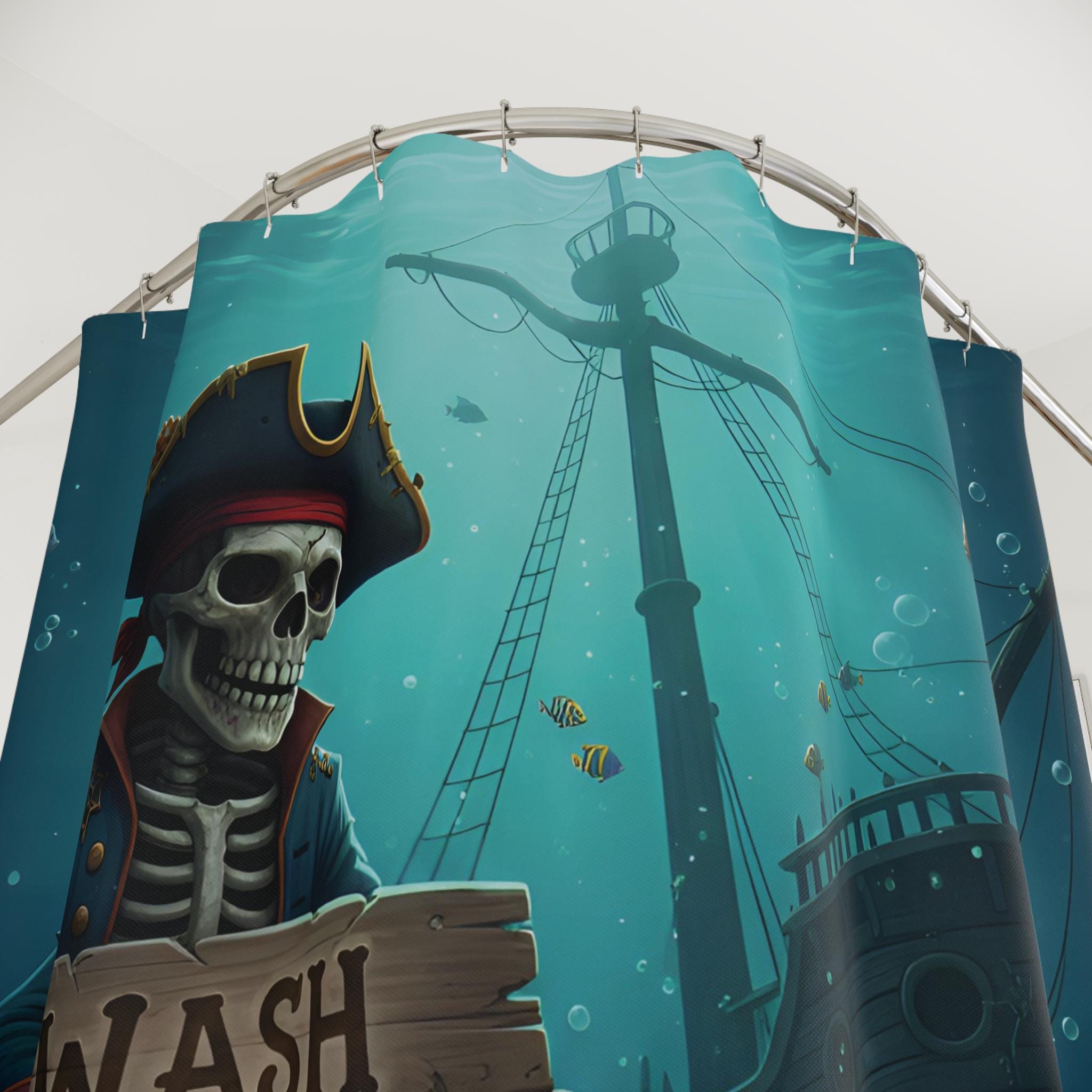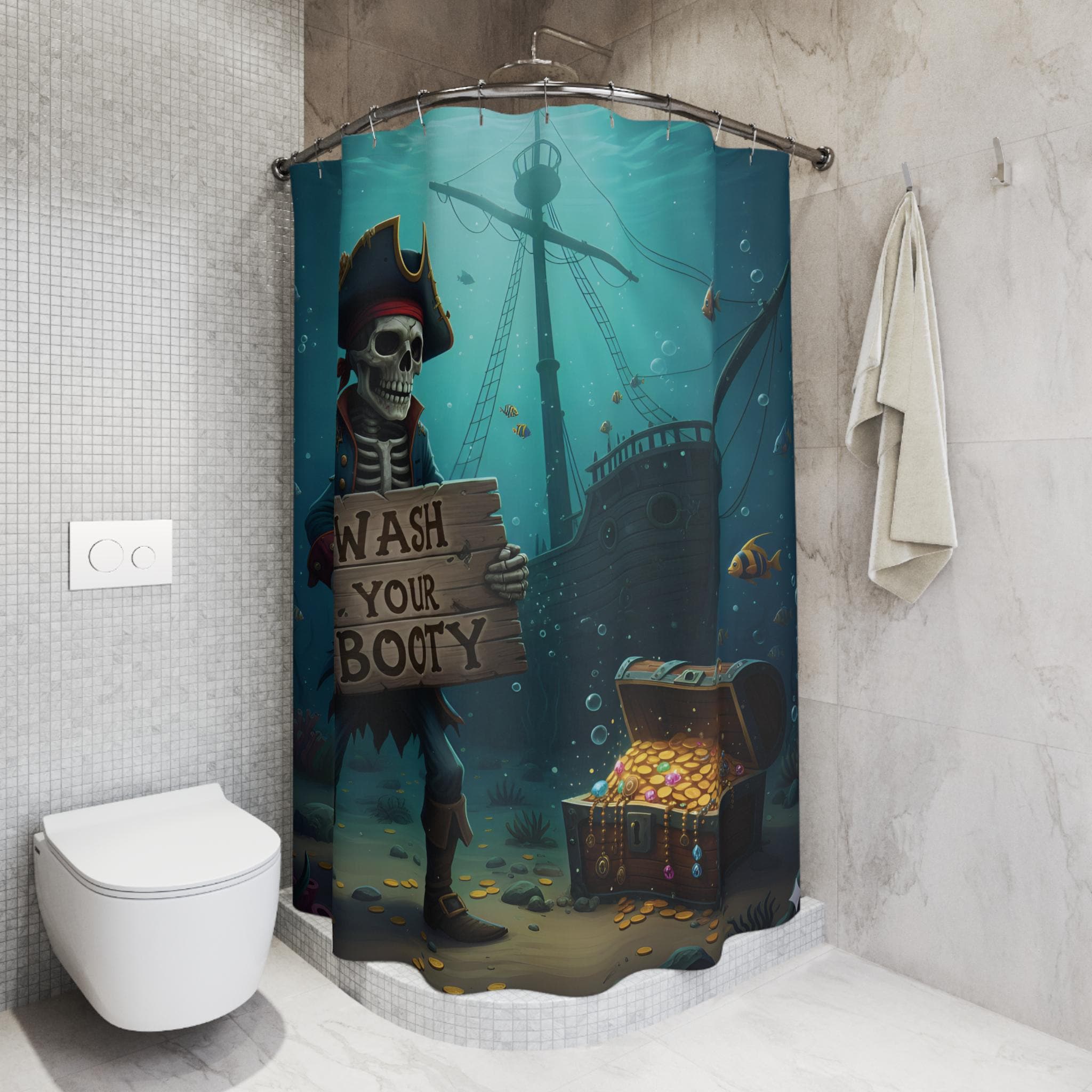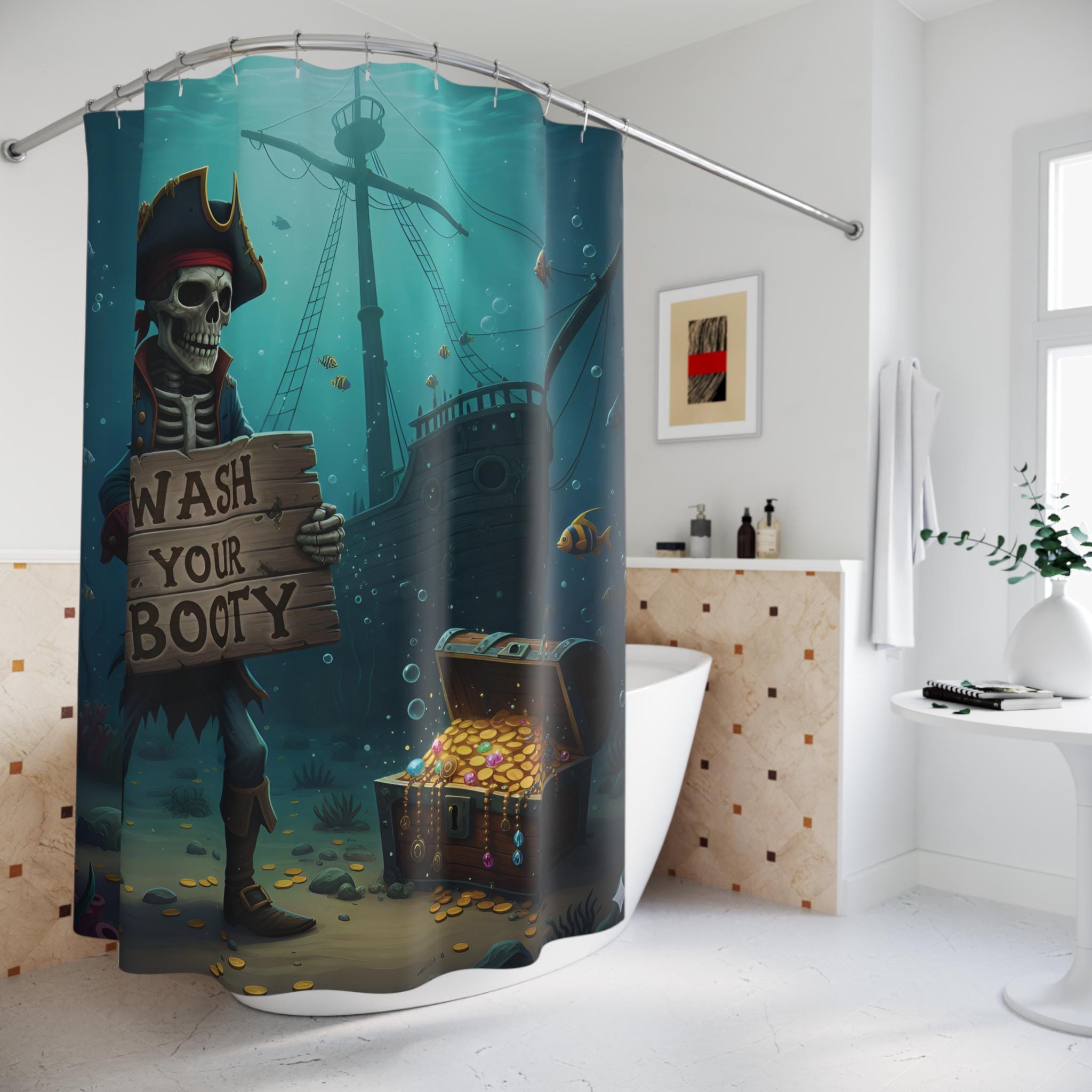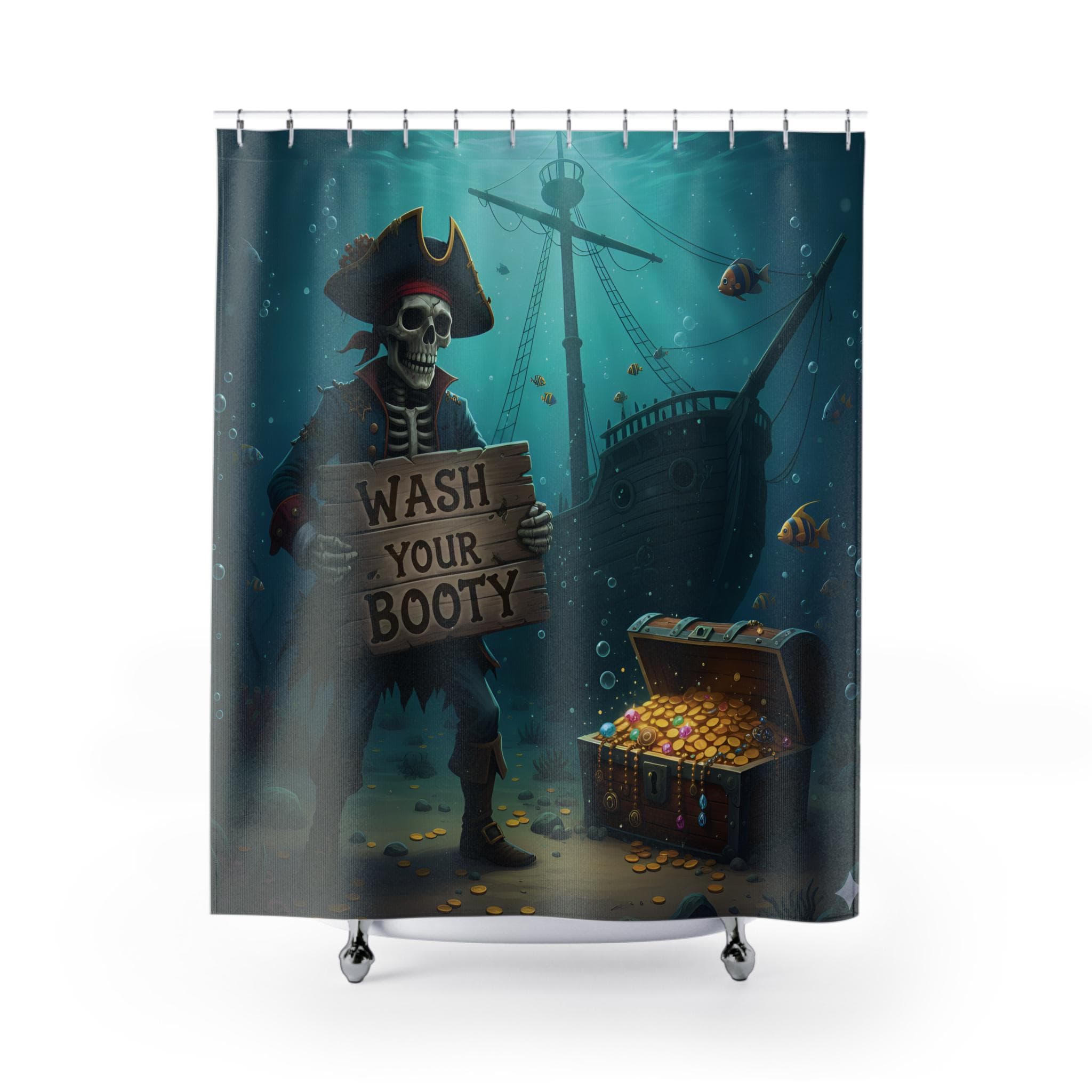 This pirate skeleton shower curtain brings a touch of adventure to your bathroom, with the playful quote 'Wash your booty'. Perfect for adults who love quirky and unique decor. Ideal for Halloween, Talk Like a Pirate Day, or any pirate-themed event.