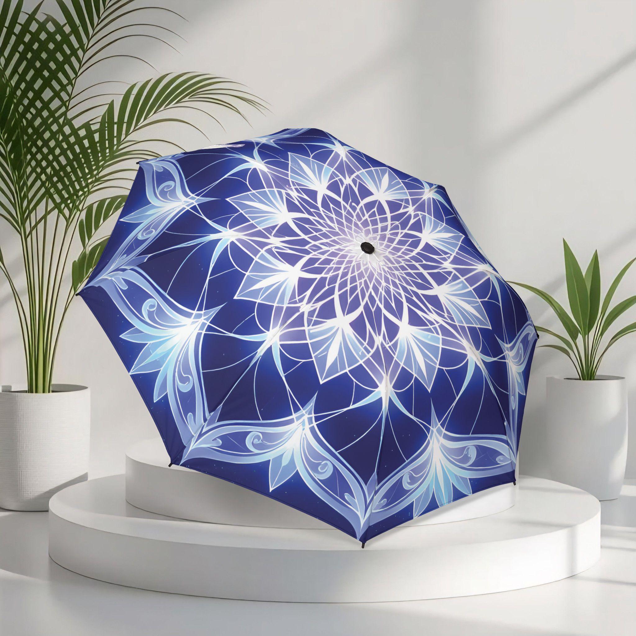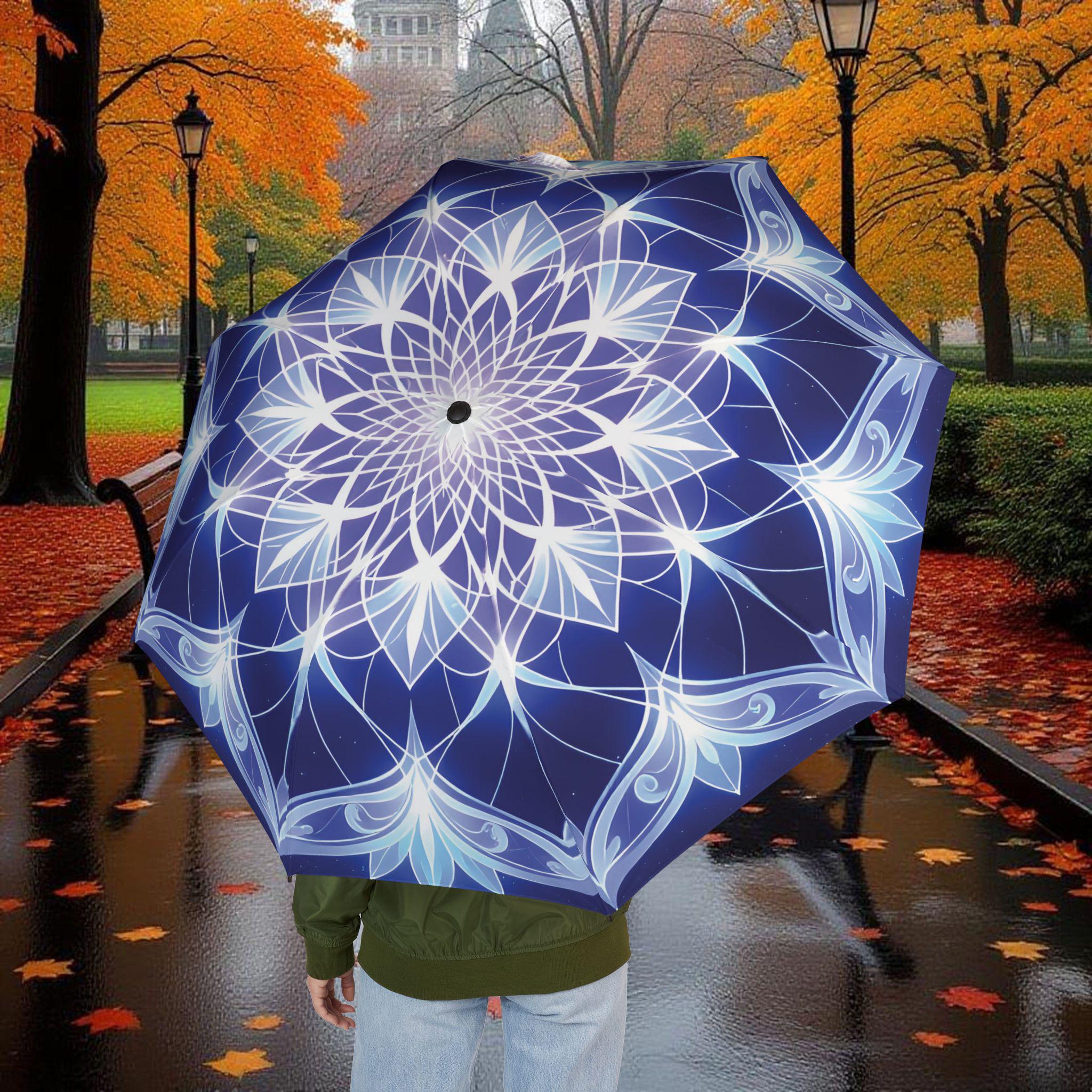 A stunning geometric mandala umbrella that is both stylish and functional. This umbrella is perfect for those who appreciate intricate designs and want to add a touch of elegance to their rainy day outfit. It opens with semi-automatic operation, providing convenience for one-handed use. Perfect for those who enjoy unique and eye-catching accessories, this umbrella is ideal for spring showers and summer storms.