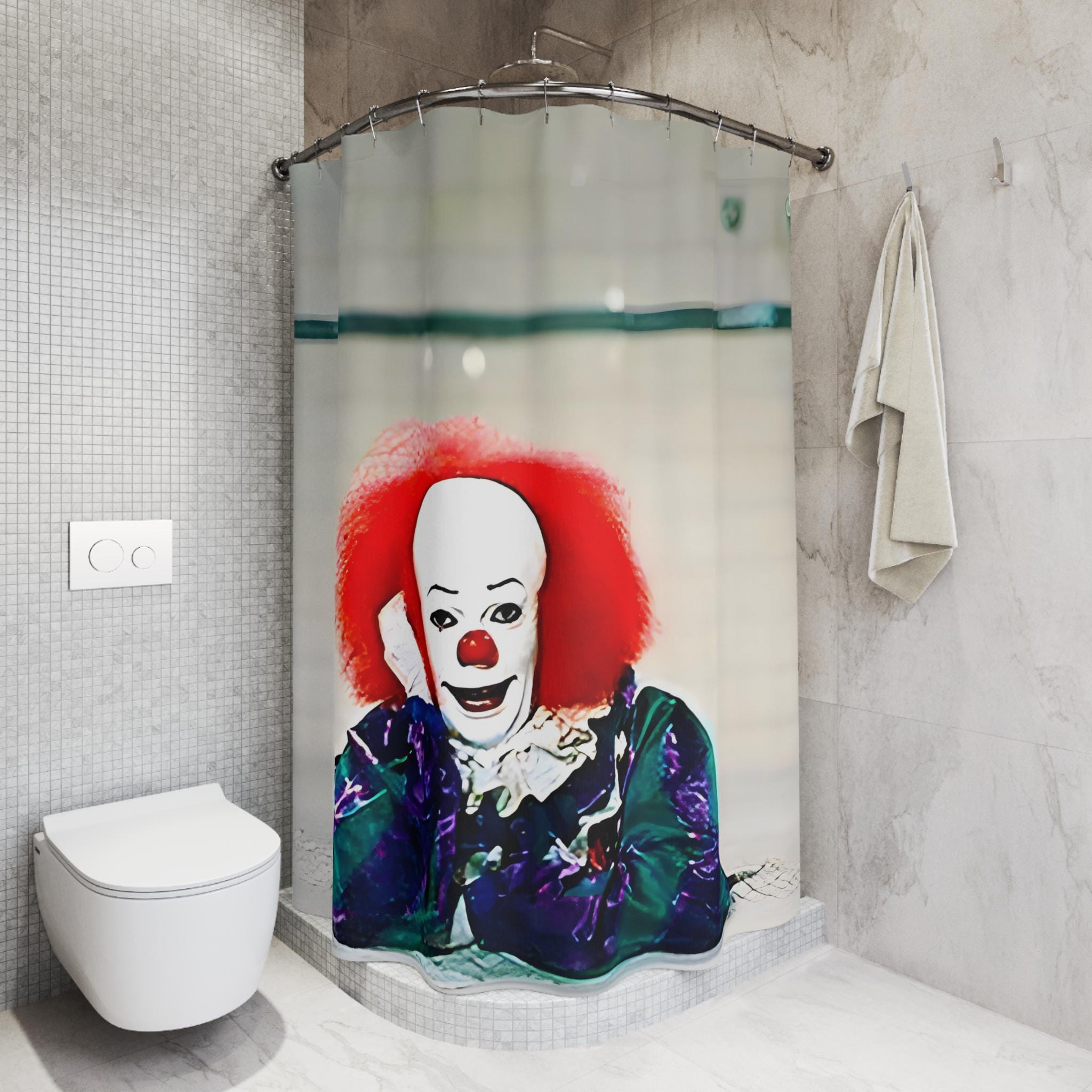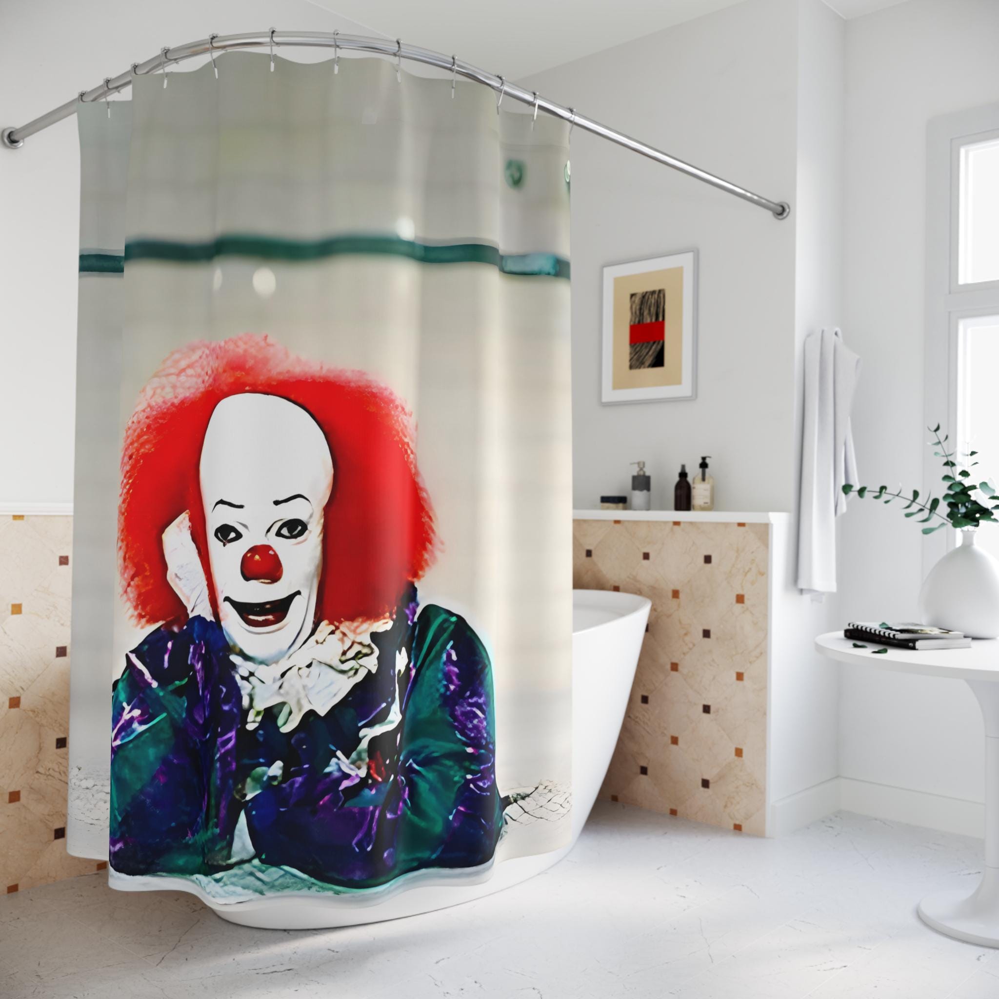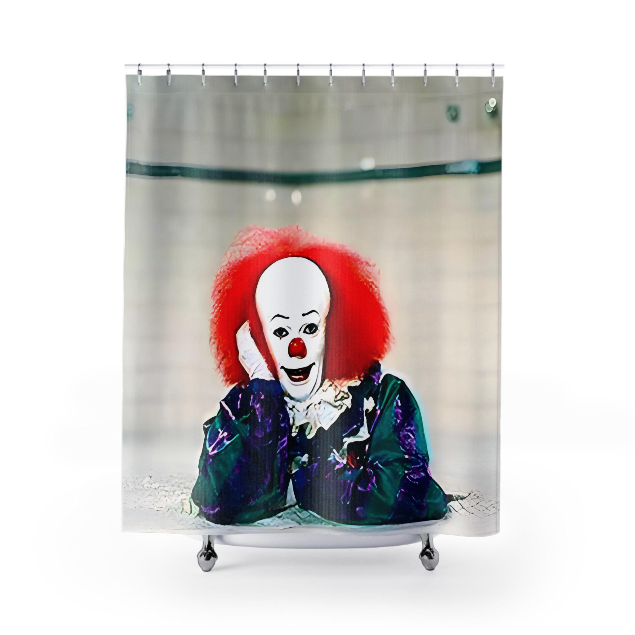 A spooky Steven King's It clown themed shower curtain to add a touch of horror to your bathroom decor. Perfect for adult fans of the novel and movie looking to set a creepy vibe during Halloween.