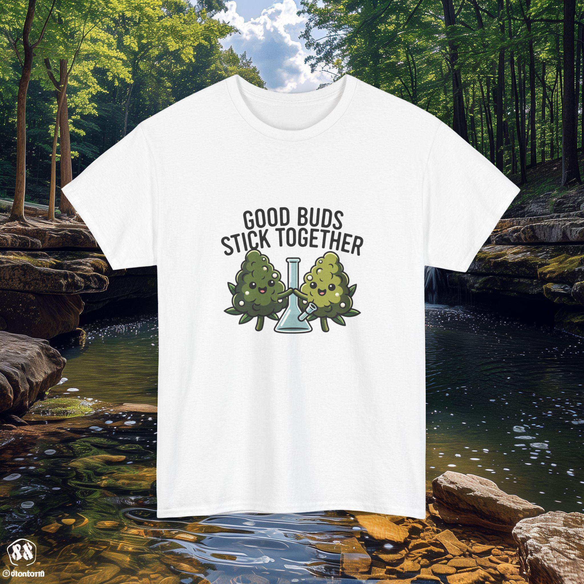 This tee feels like a laugh shared between friends at golden hour. Two playful marijuana buds and a vintage-style bong form the centerpiece, accompanied by the cheeky line “Good buds stick together.” It’s built for laid-back hangouts, late-night playlists, and porch conversations that stretch into the stars. Wear it to signal friendly vibes without saying a word — the soft, sturdy fabric and classic crewneck keep it comfortable through group sessions, campground chill-outs, and casual meetups with your circle.