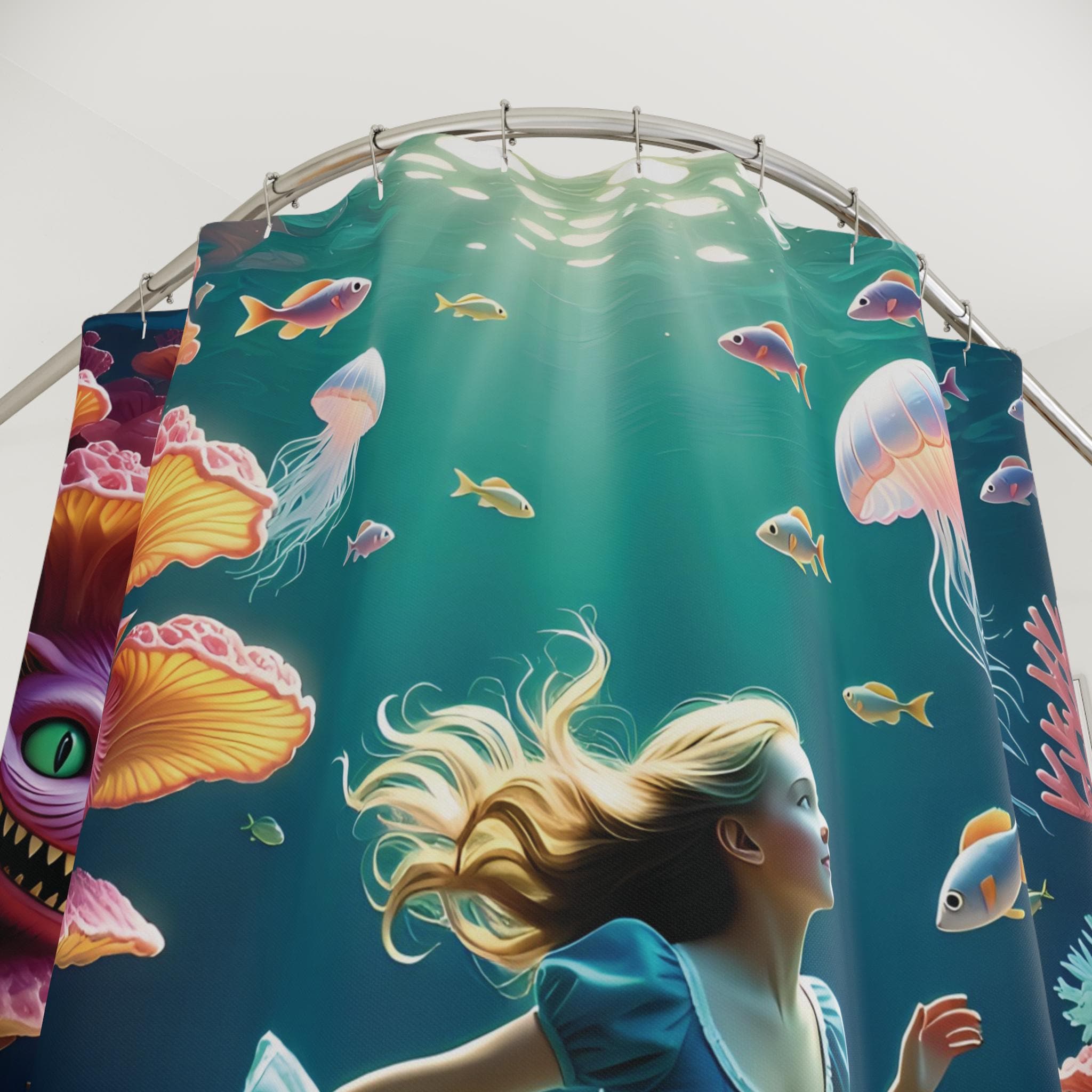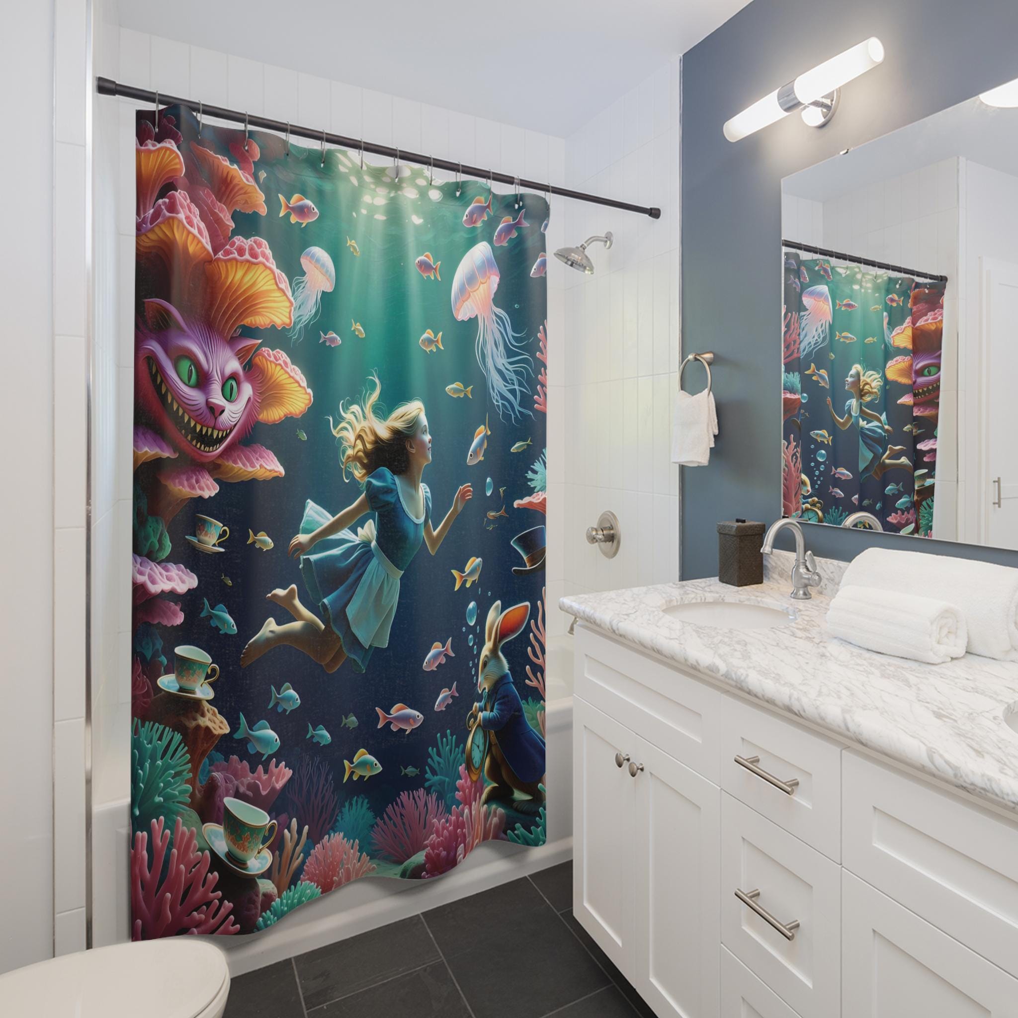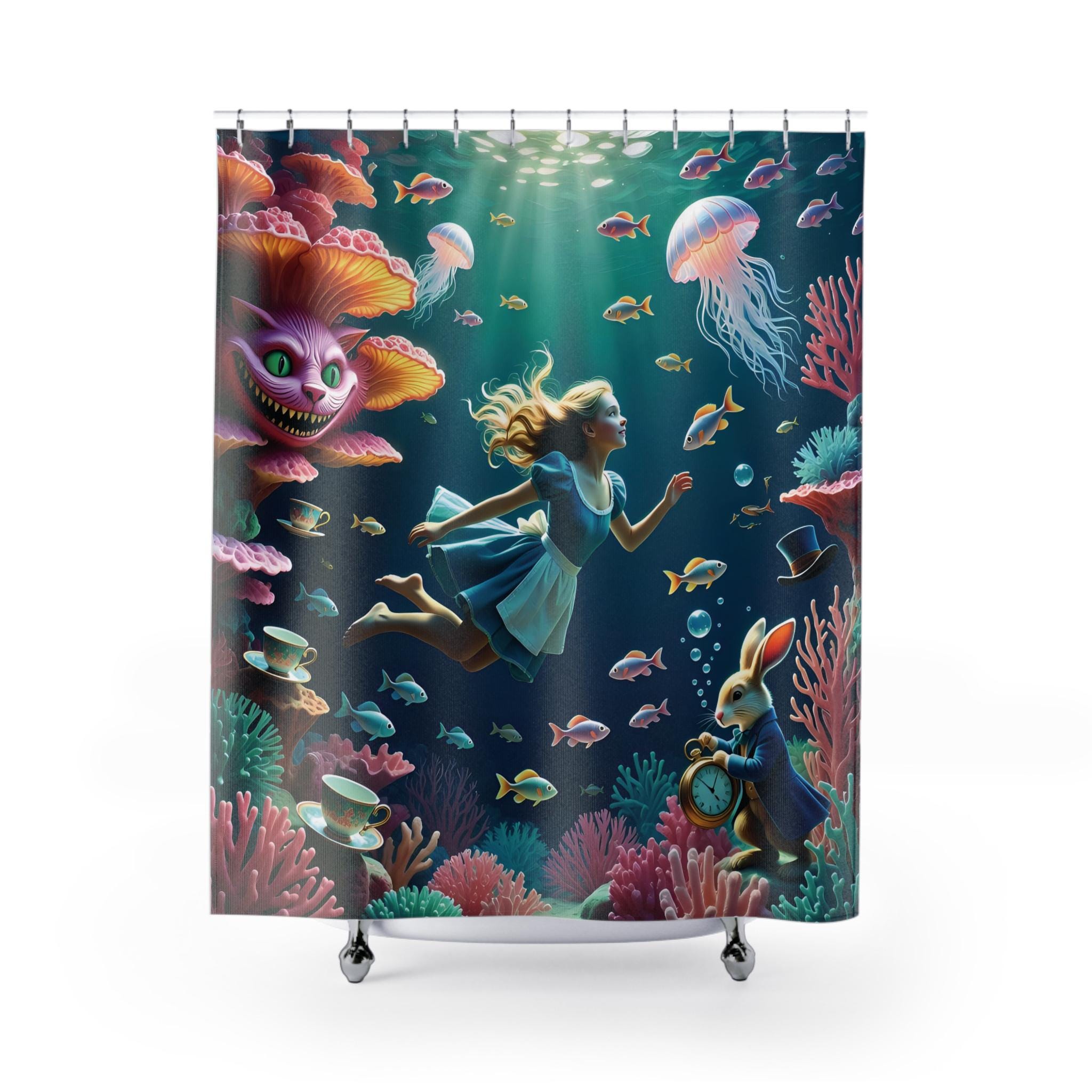 Float into a strange, underwater dream where Alice glides alongside the Cheshire Cat and the ever-urgent White Rabbit. This shower curtain turns a simple routine into a soft, surreal escape: the cat’s grin drifting through ripples, Alice’s hair and dress flowing like seaweed, and the rabbit’s watch tucked into the current. It’s for adults who love whimsical, storybook imagery and want their bathroom to feel like a secret scene from a favorite tale. Hang it for quiet mornings when you want to start the day with wonder, or for evening baths that feel more like a gentle, curious dive.